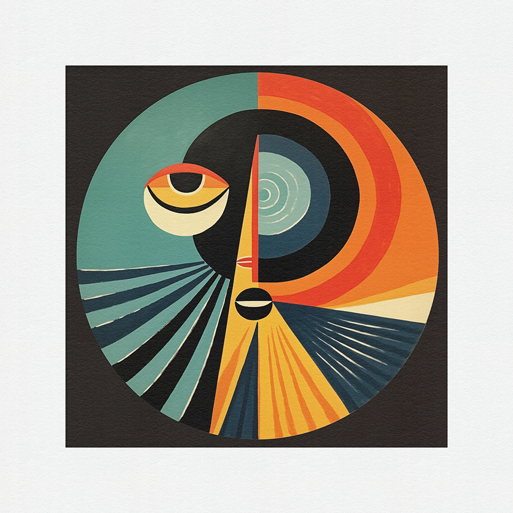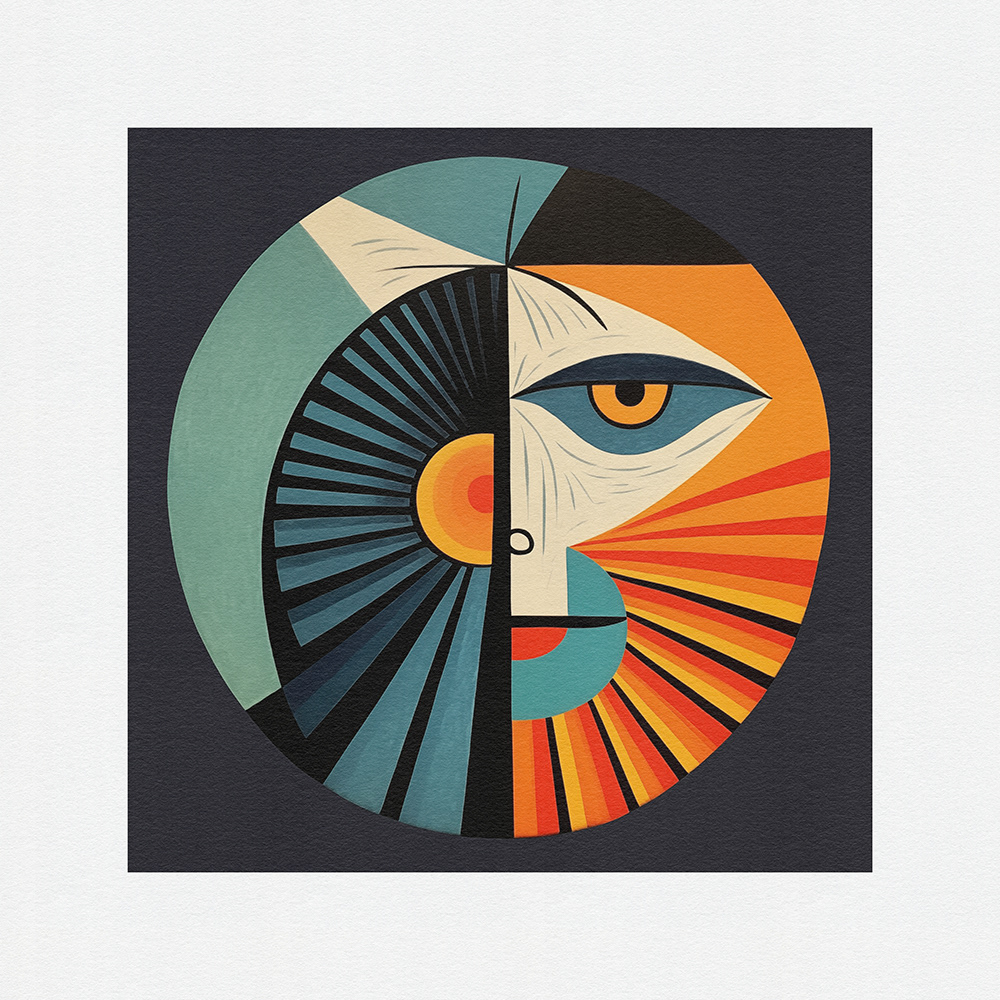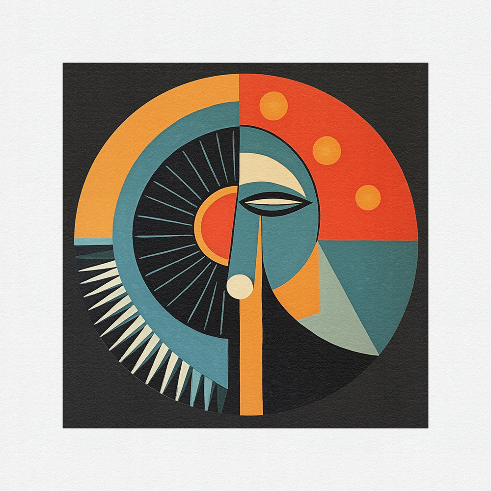 "Bauhaus Meets Cubism" merges Bauhaus design principles with Cubist fragmentation. Circular artworks feature vivid colors and dynamic shapes, inviting viewers into a captivating world of form and function.