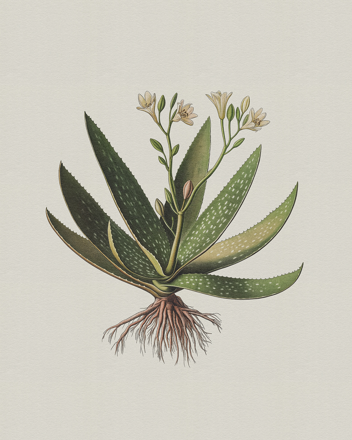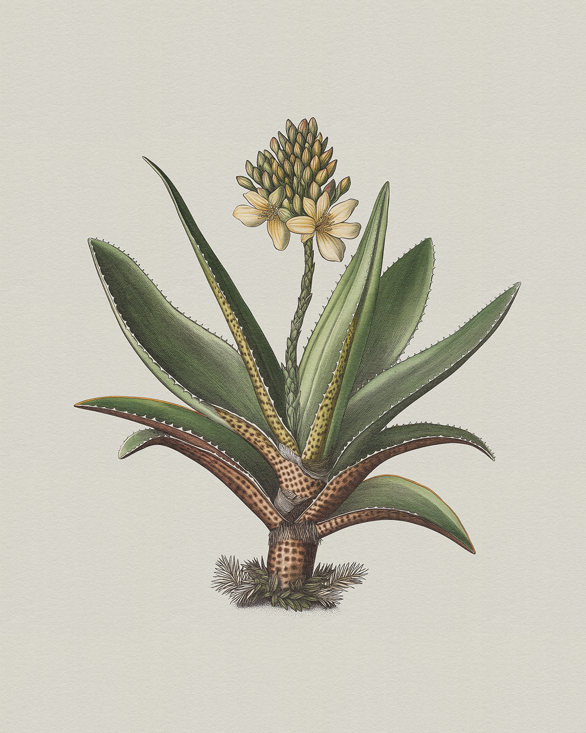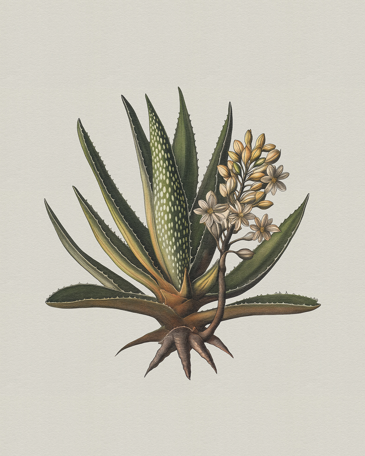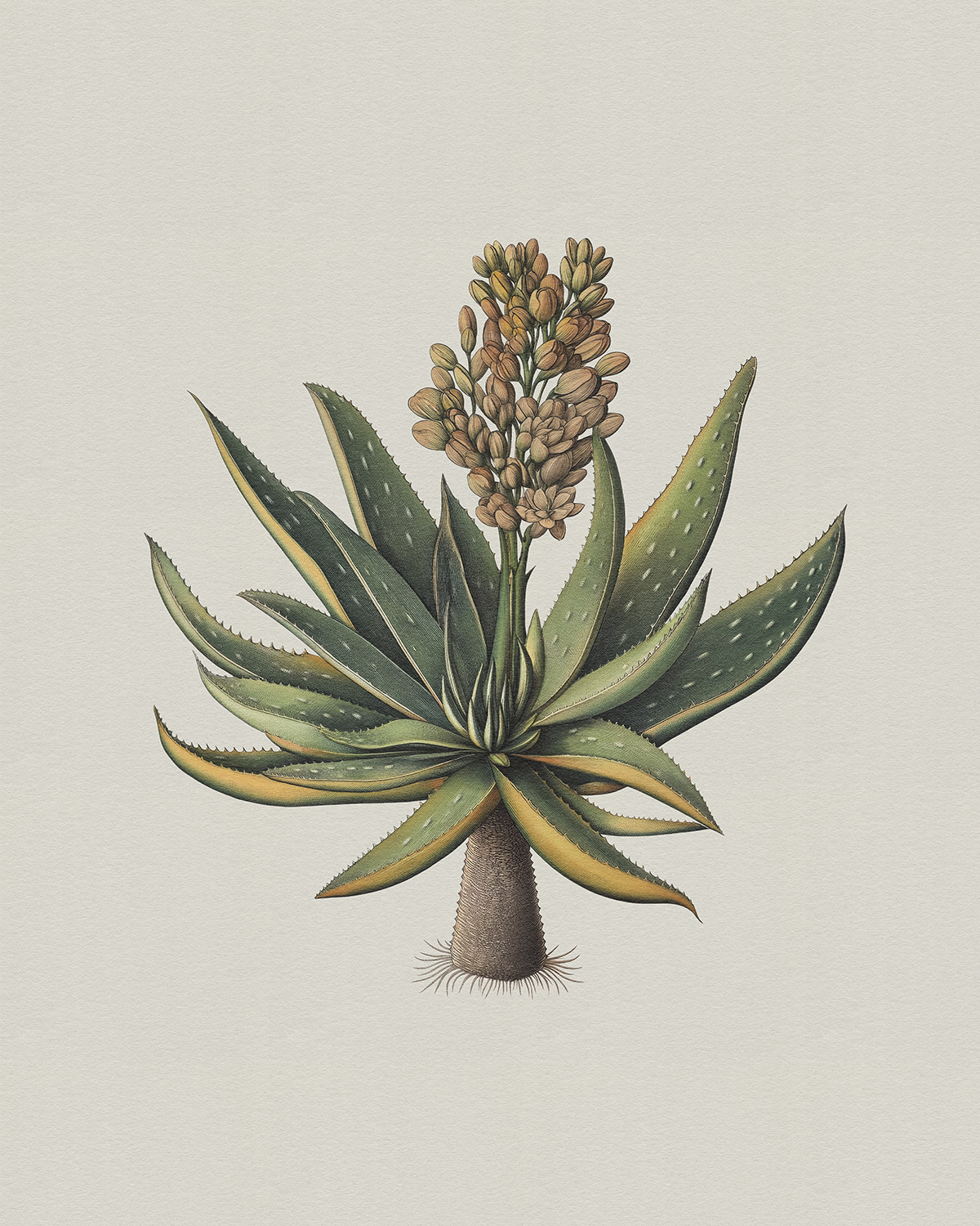 A premium AI-crafted botanical stock illustration series featuring aloe and succulent plants, intelligently generated with vintage botanical precision and modern clarity for editorial, packaging, branding, and surface design applications.