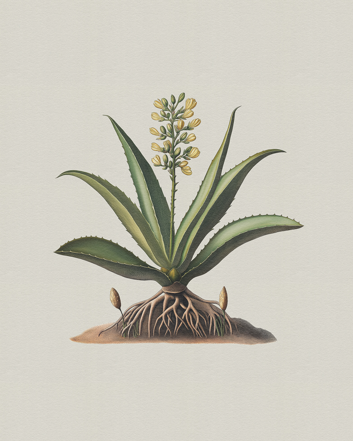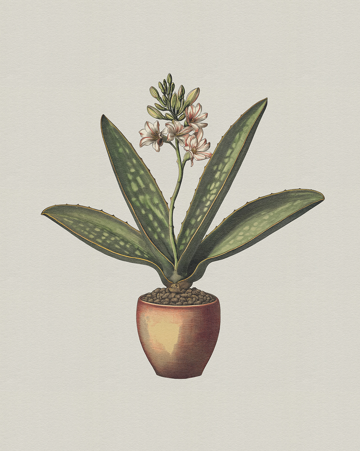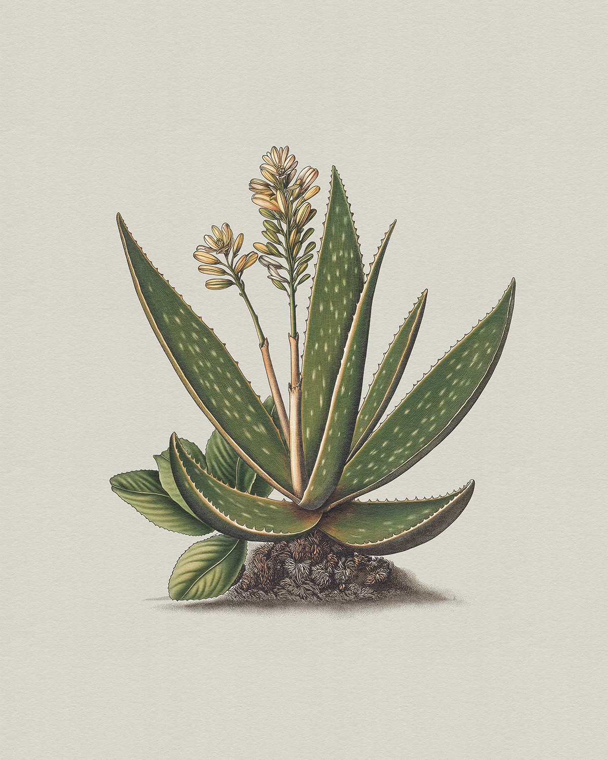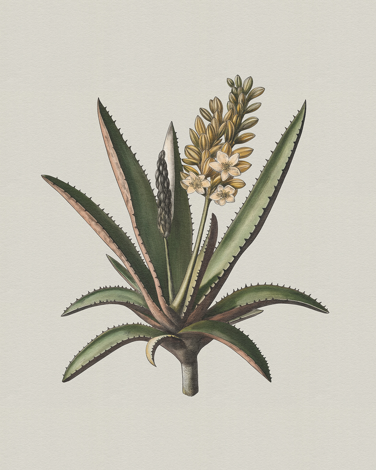 A premium AI-crafted botanical stock illustration series featuring aloe and succulent plants, intelligently generated with vintage botanical precision and modern clarity for editorial, packaging, branding, and surface design applications.