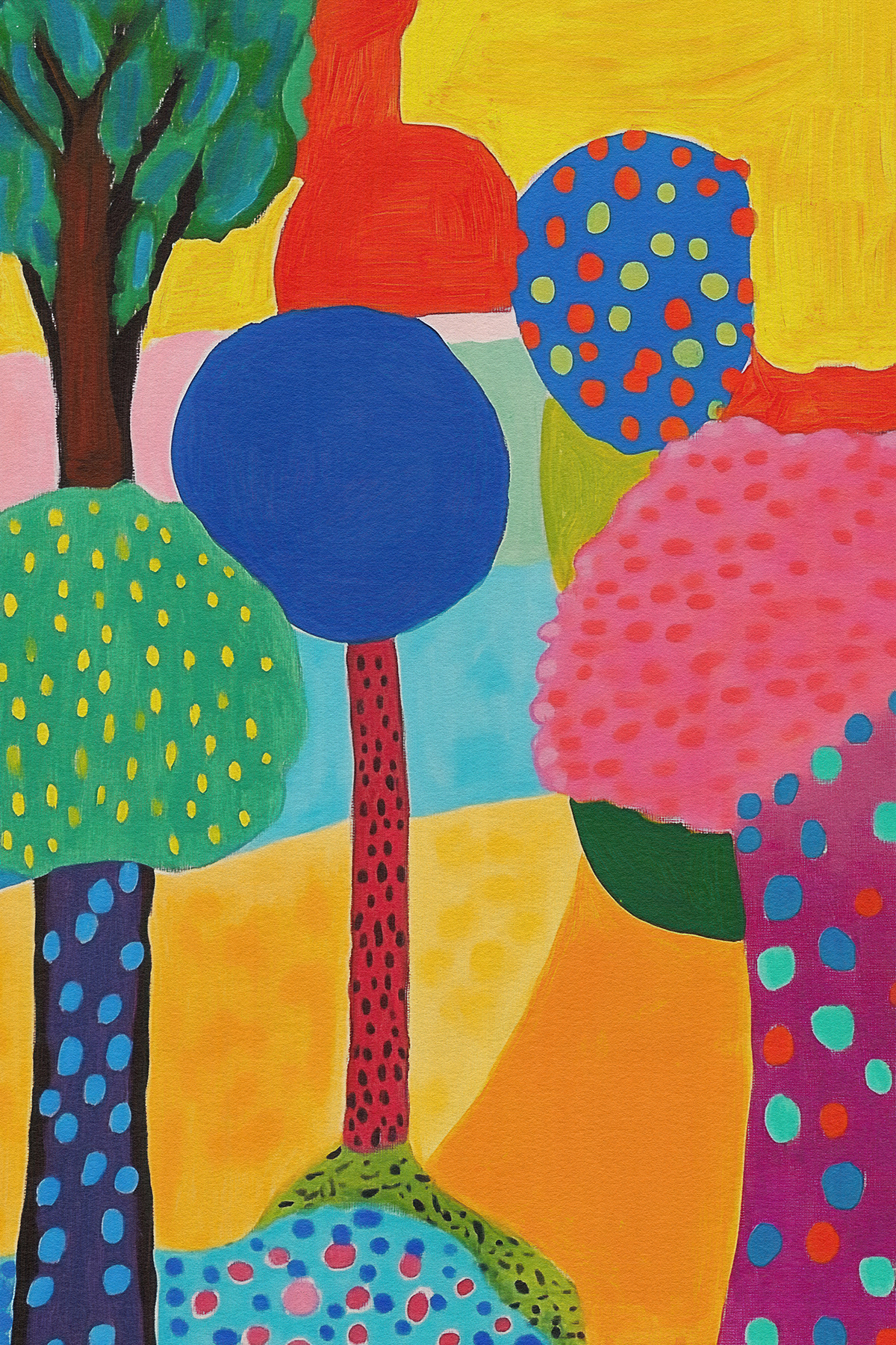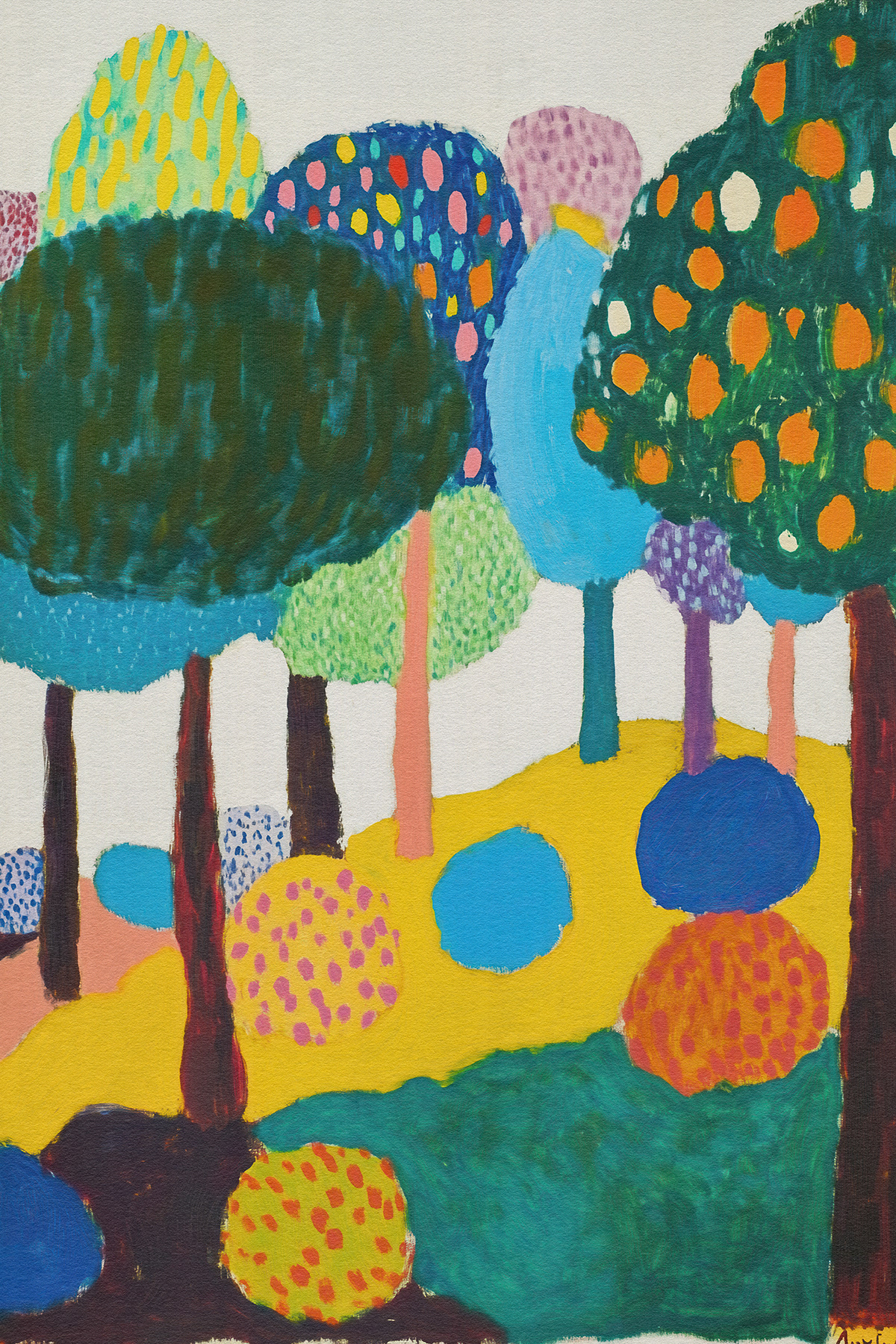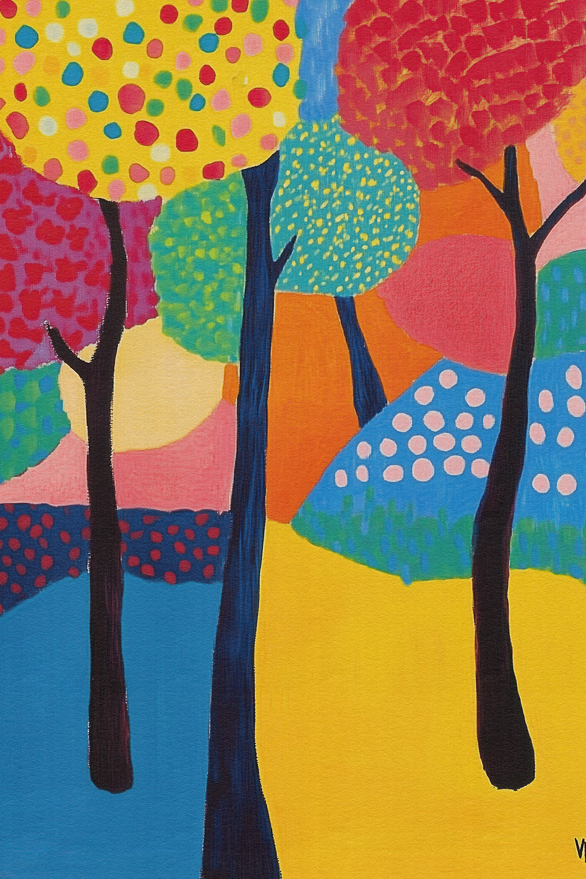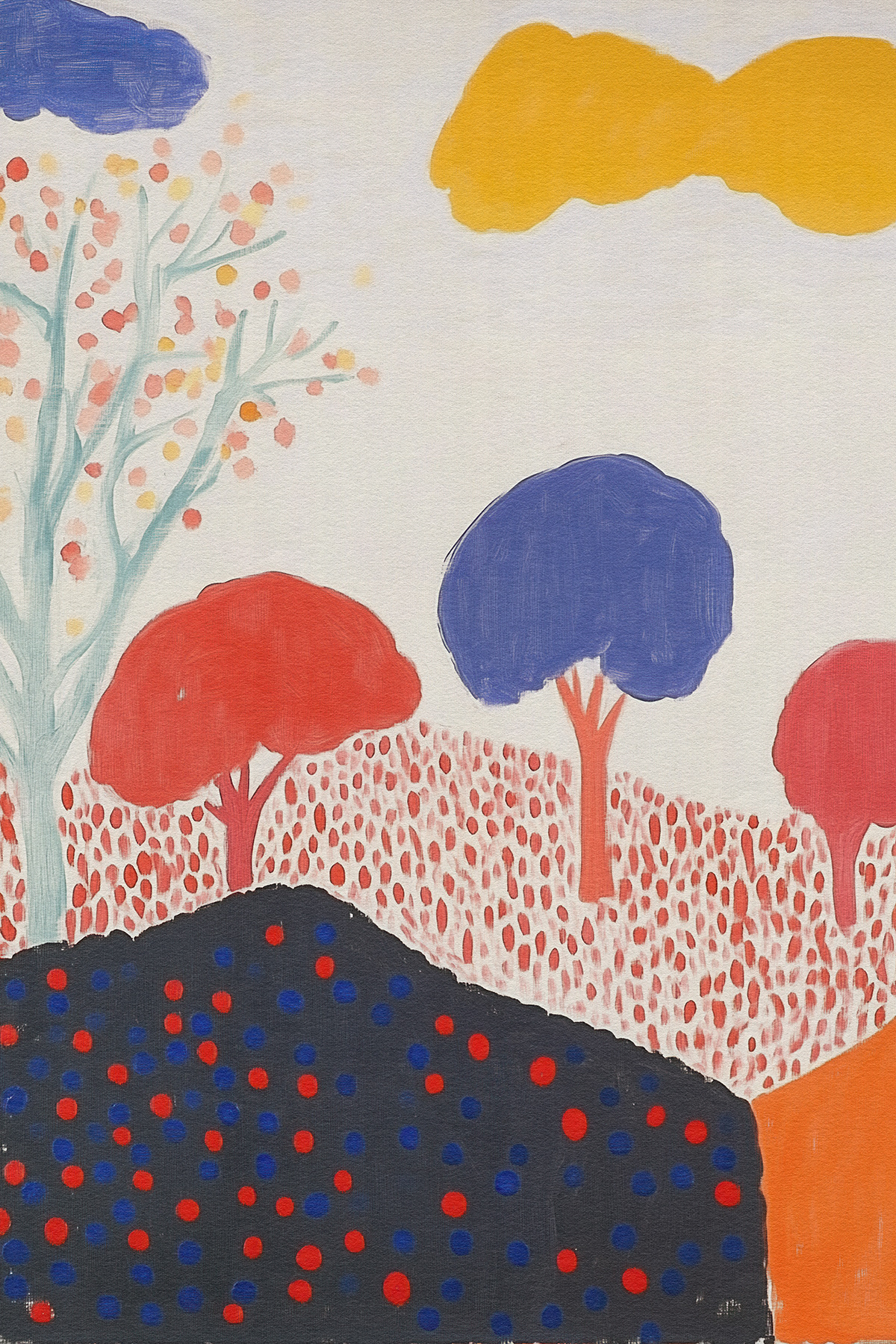 Blending the poetic geometry of Etel Adnan with Matisse’s chromatic freedom, this art series reimagines forests through abstract shapes, vibrant palettes, and emotional minimalism—ideal for modern art collectors and decor.