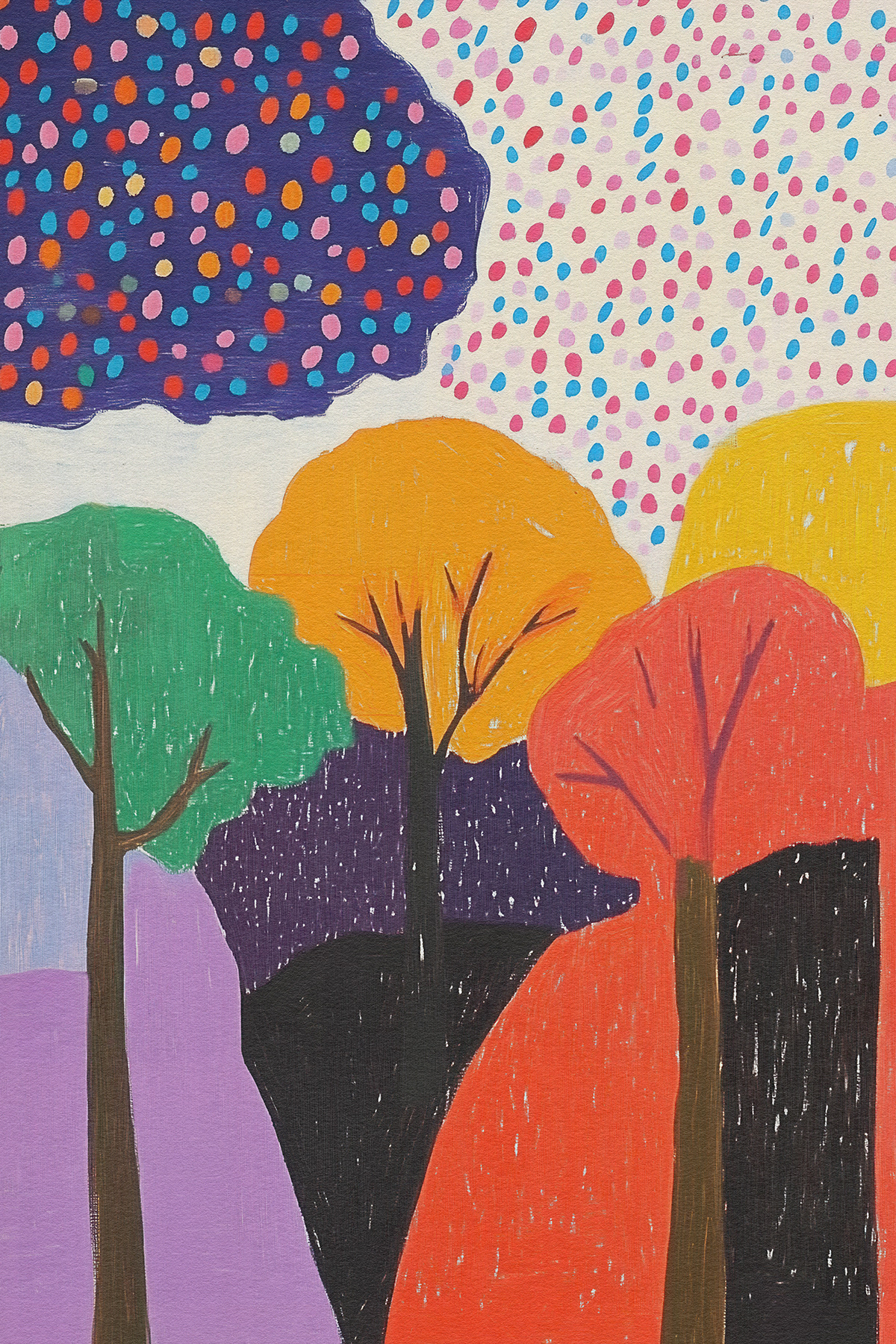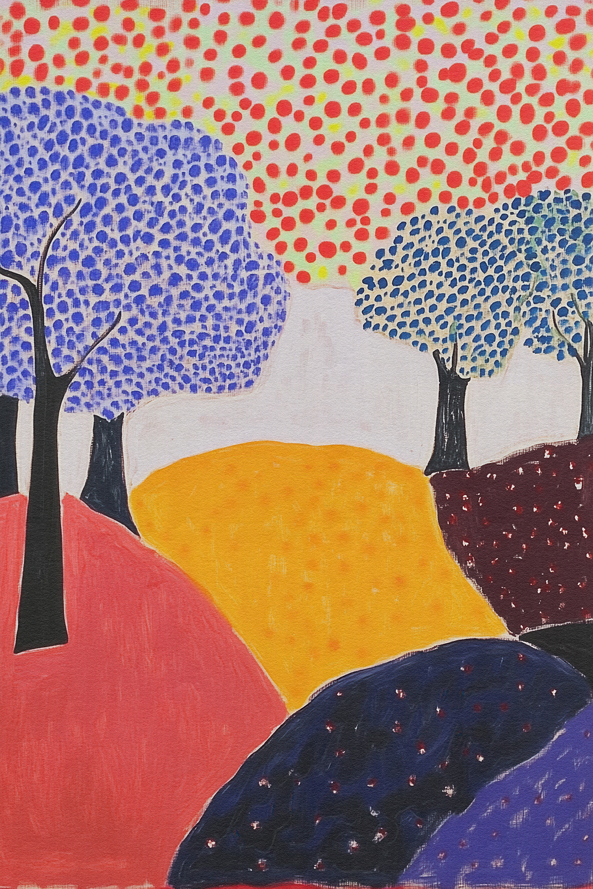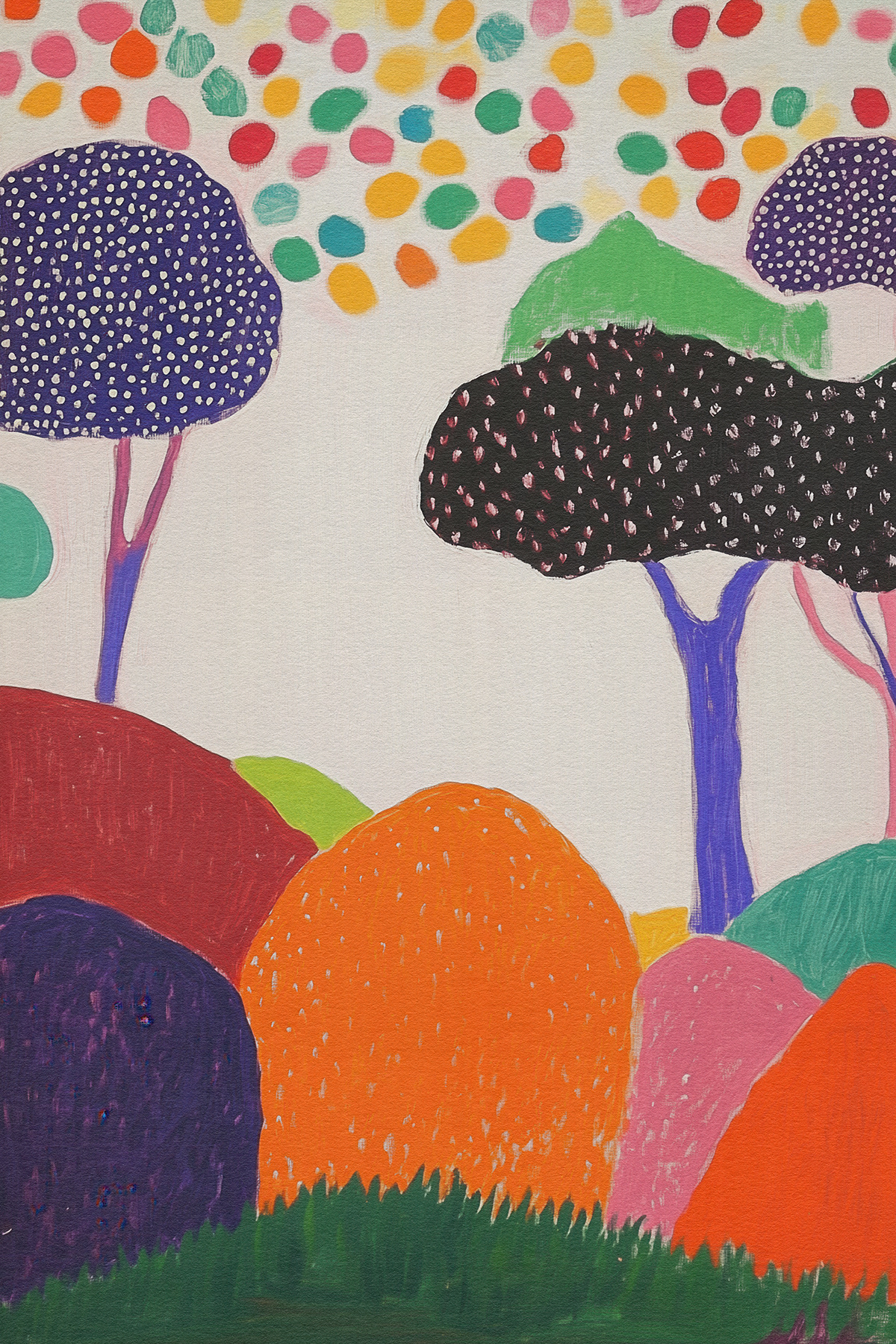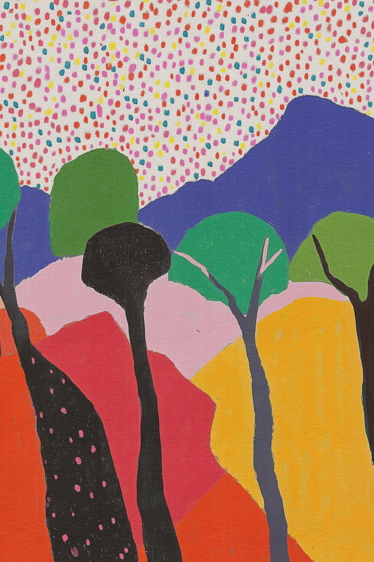 Blending the poetic geometry of Etel Adnan with Matisse’s chromatic freedom, this art series reimagines forests through abstract shapes, vibrant palettes, and emotional minimalism—ideal for modern art collectors and decor.