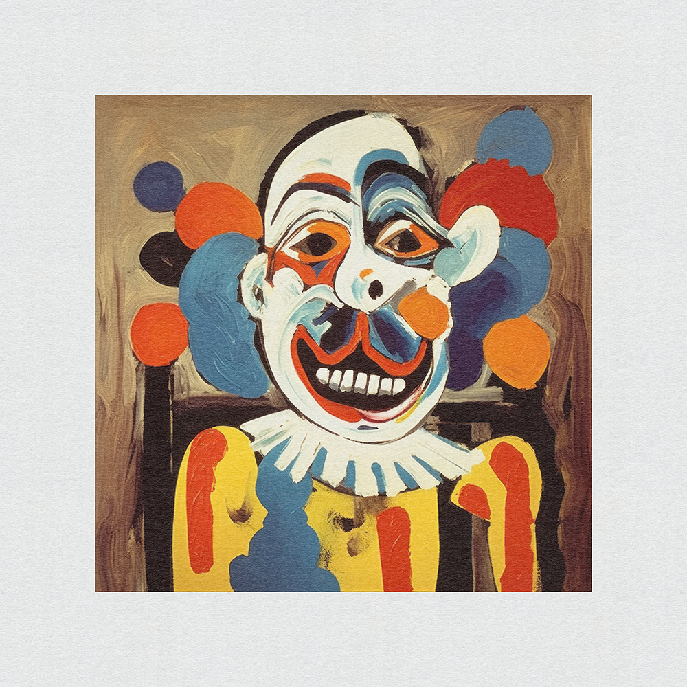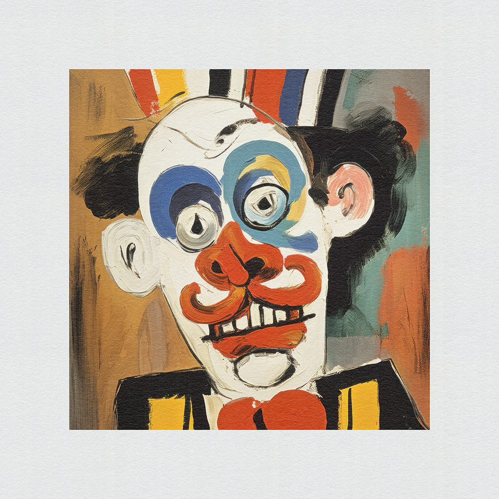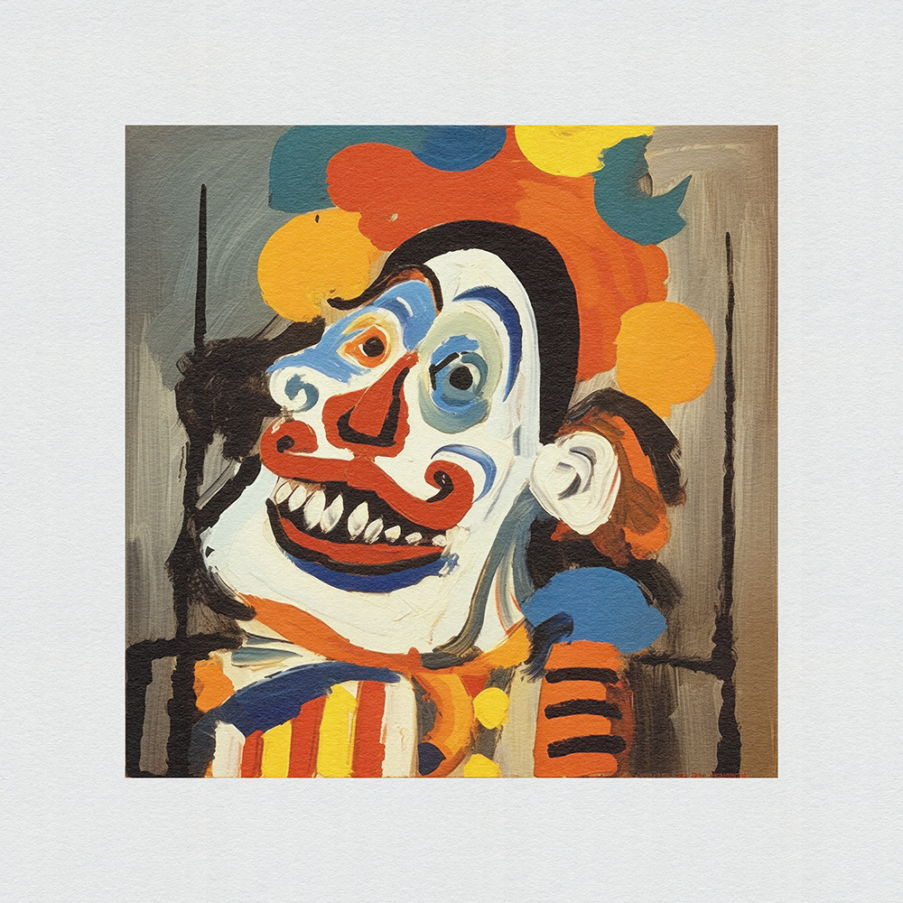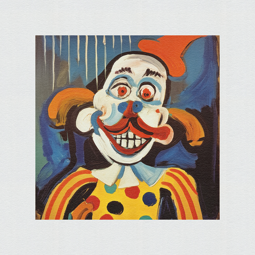 An expressive, abstract series. Vibrant chaos on canvas. Frenetic brushstrokes depict clown mishaps, capturing humor and turmoil in bold, dynamic forms and vibrant colors.