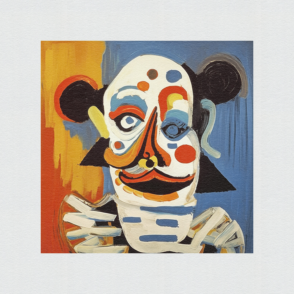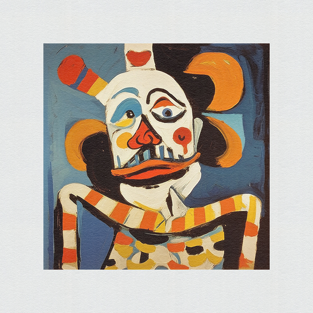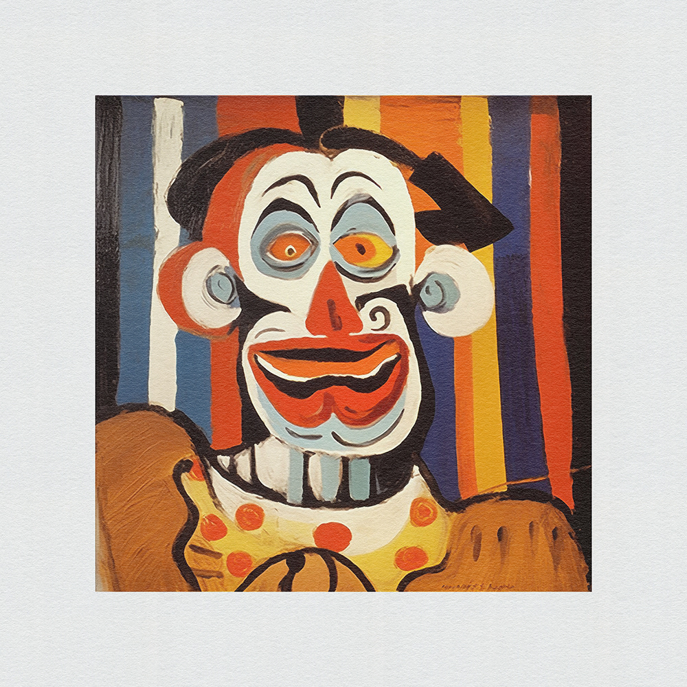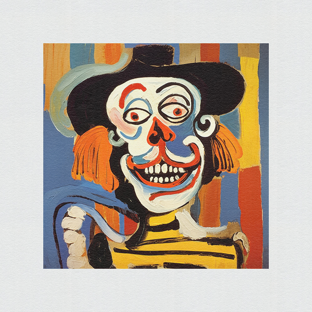 An expressive, abstract series. Vibrant chaos on canvas. Frenetic brushstrokes depict clown mishaps, capturing humor and turmoil in bold, dynamic forms and vibrant colors.