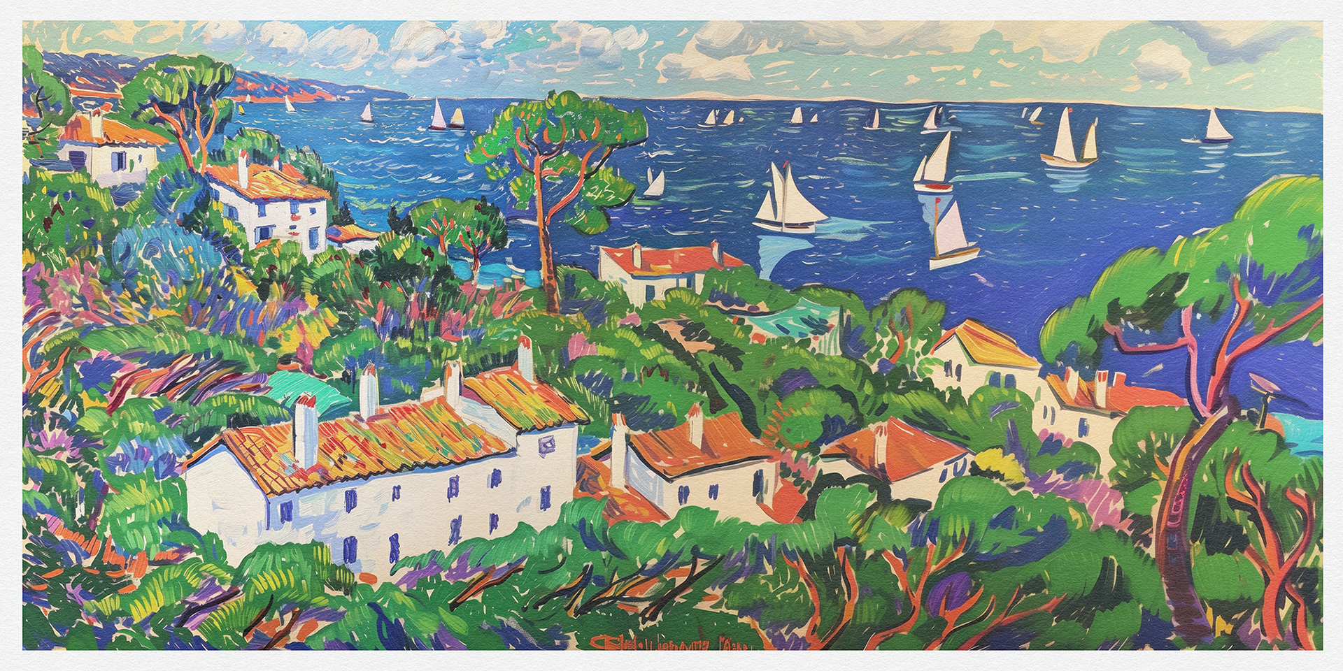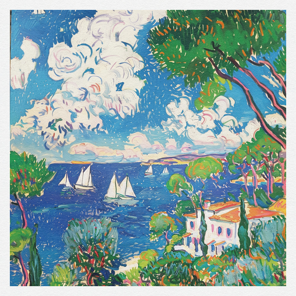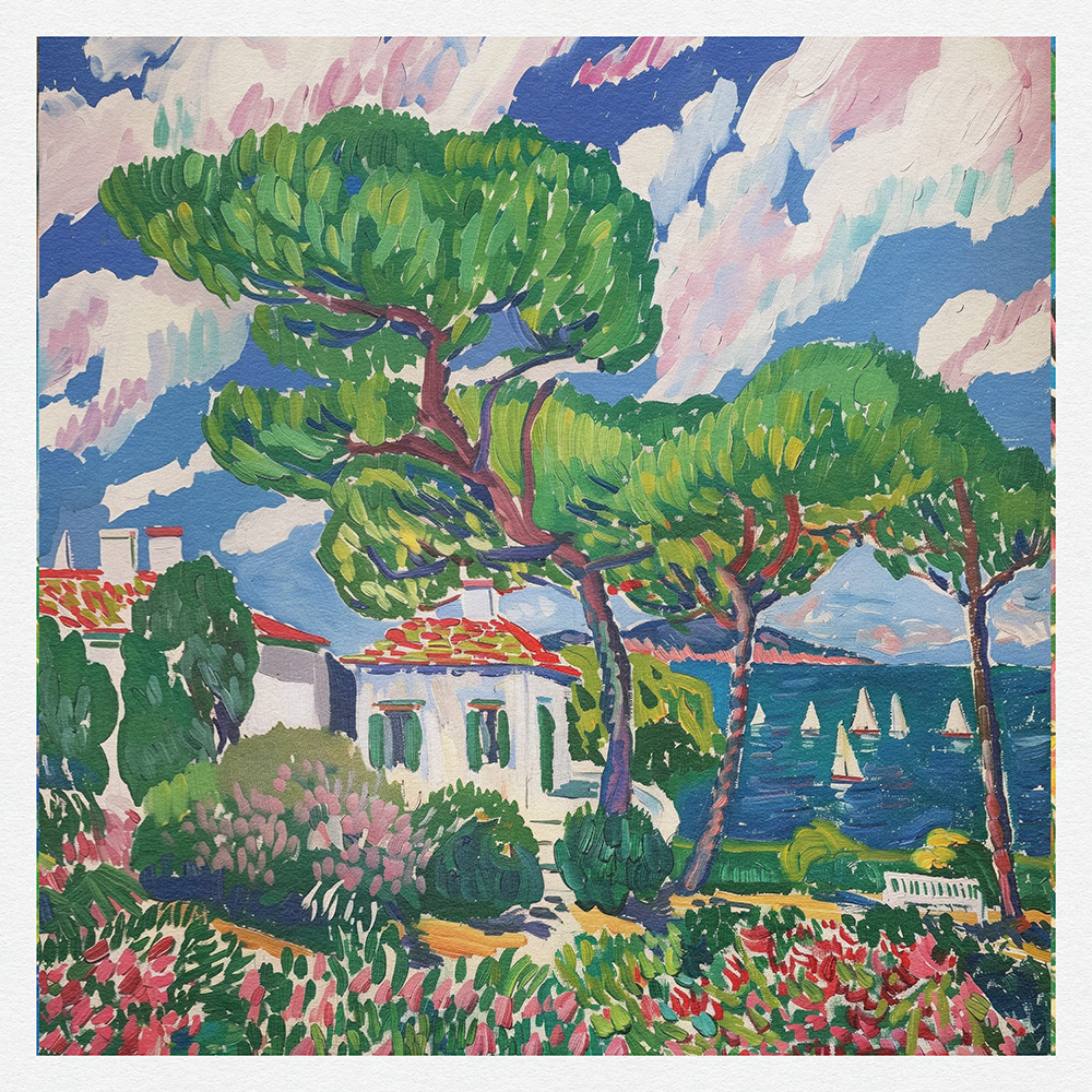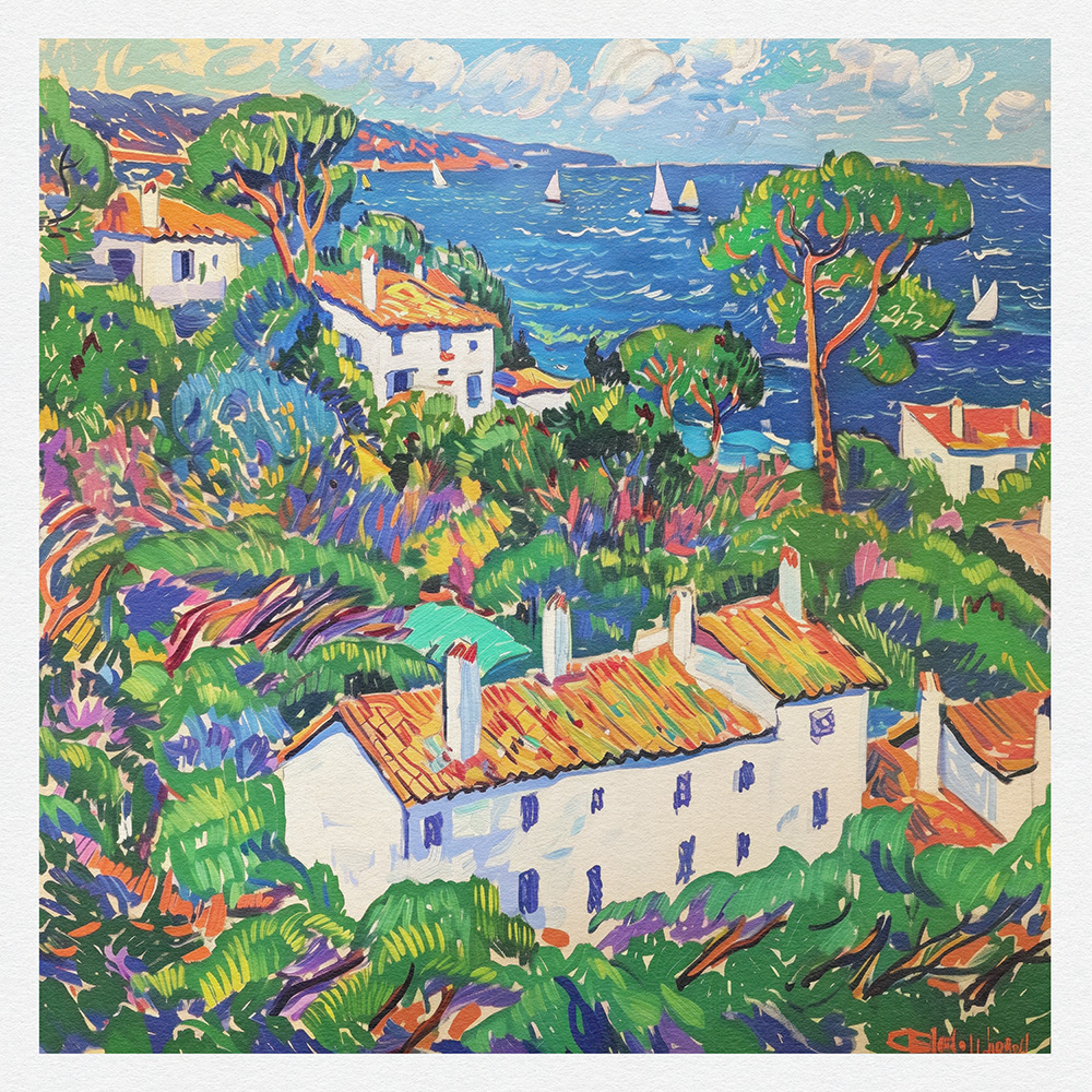 "Coastal Harmony" vibrantly captures serene seaside vistas, blending lush landscapes and charming cottages with bold, dynamic brushstrokes, exuding a sense of idyllic tranquility and the vibrant essence of coastal life.