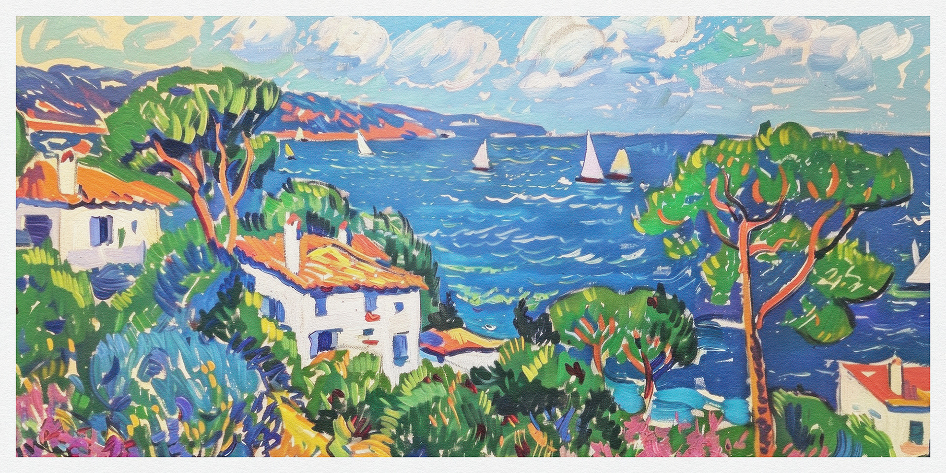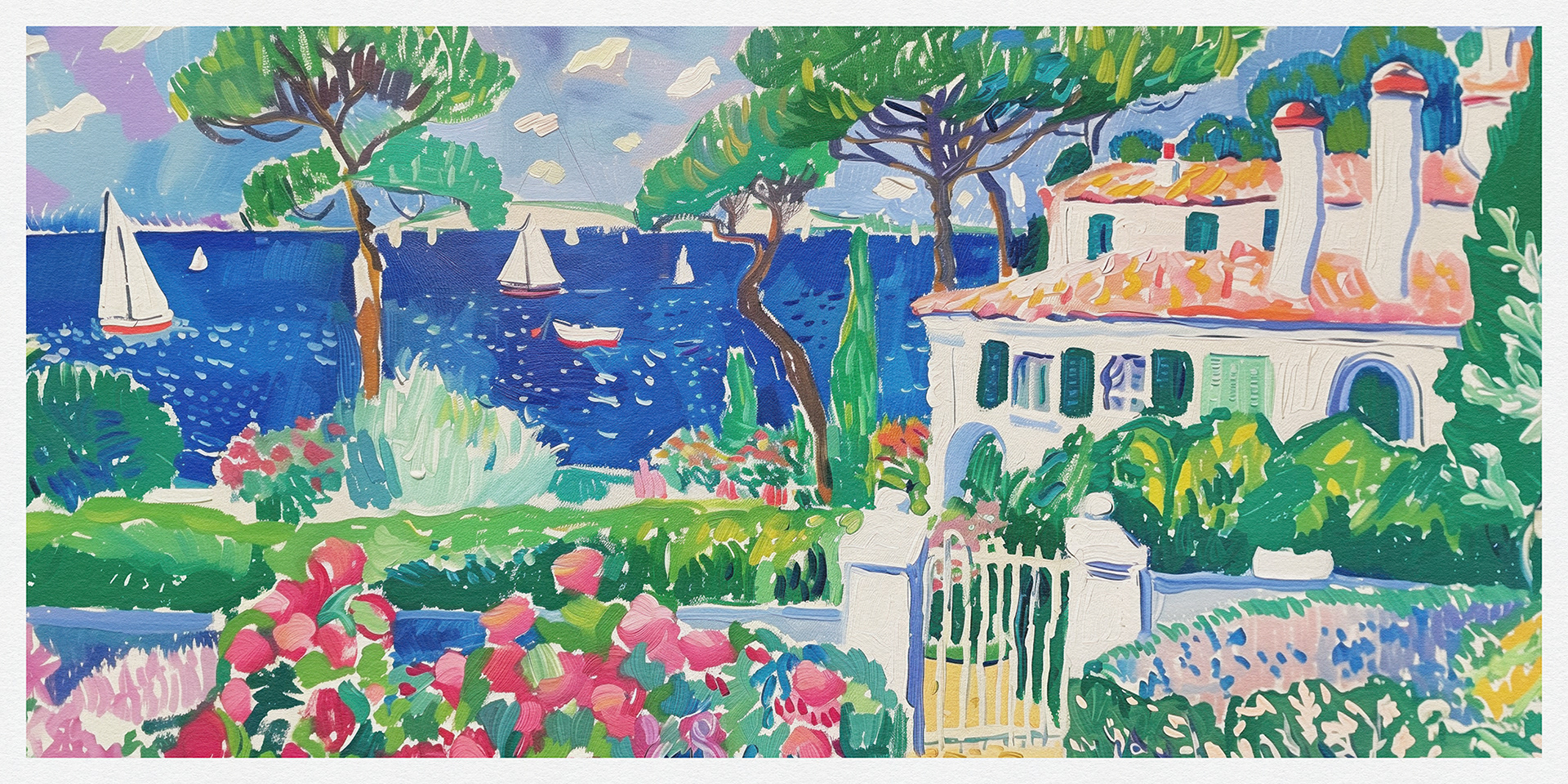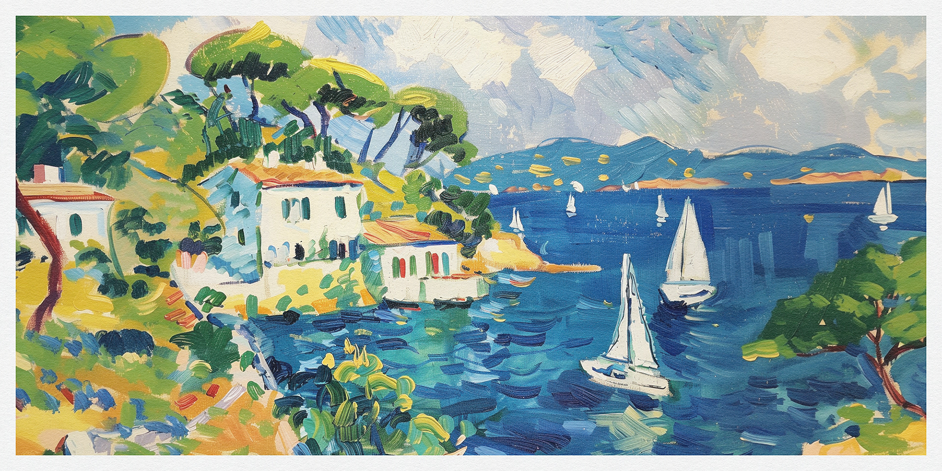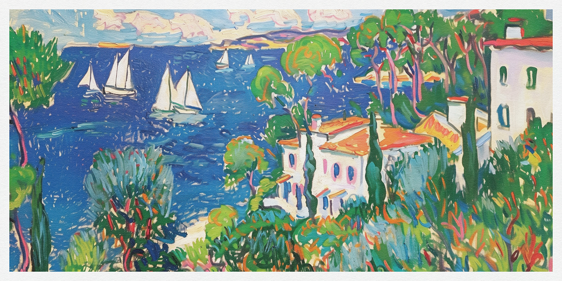 "Coastal Harmony" vibrantly captures serene seaside vistas, blending lush landscapes and charming cottages with bold, dynamic brushstrokes, exuding a sense of idyllic tranquility and the vibrant essence of coastal life.
