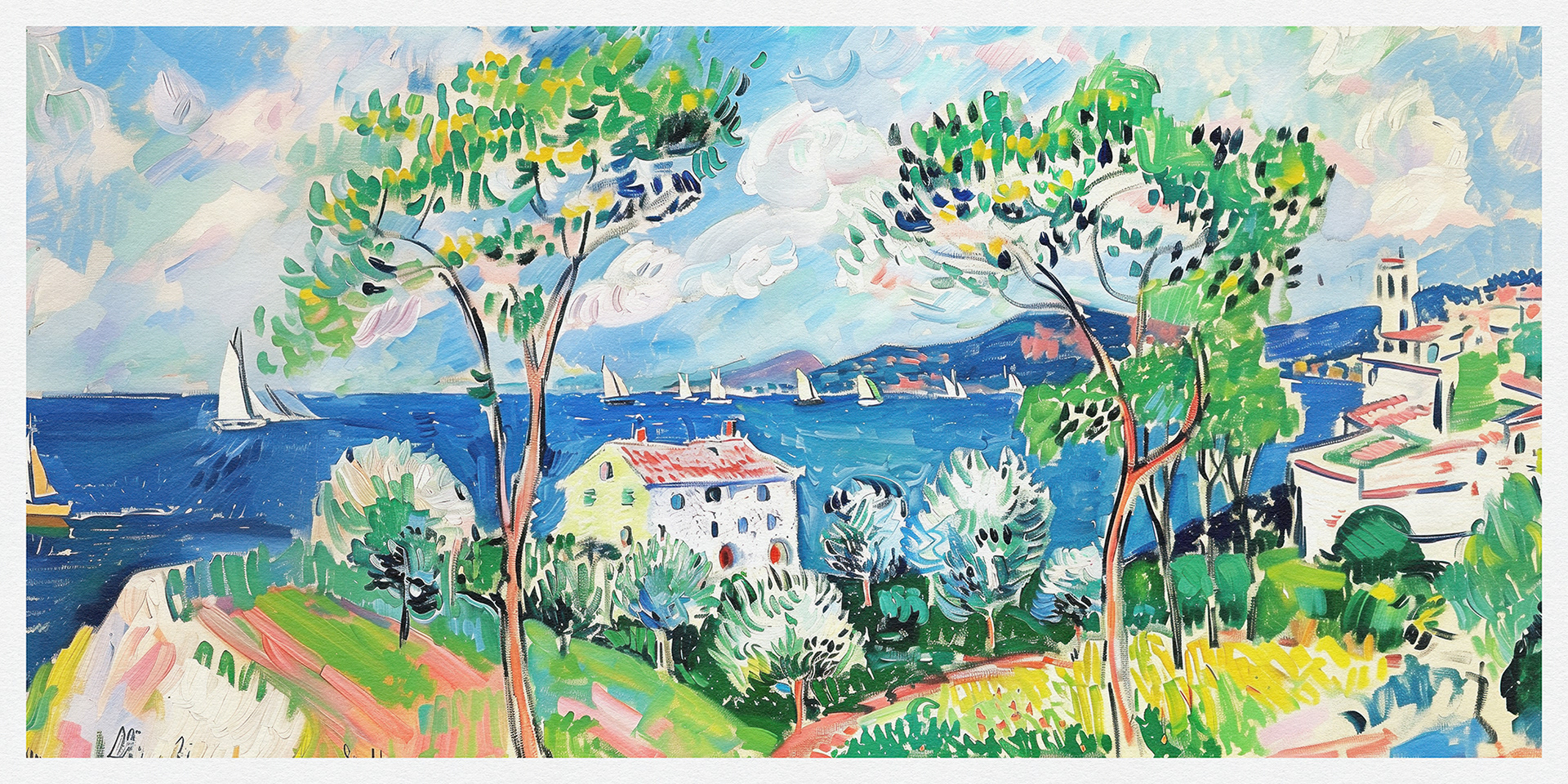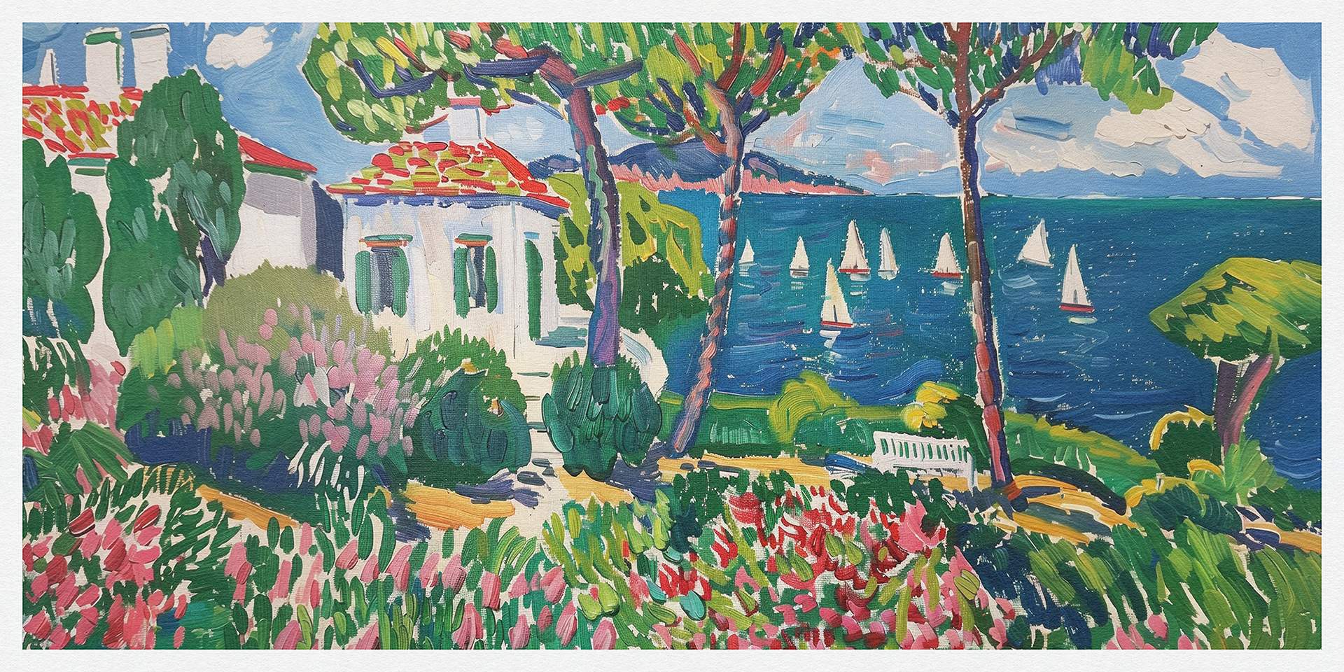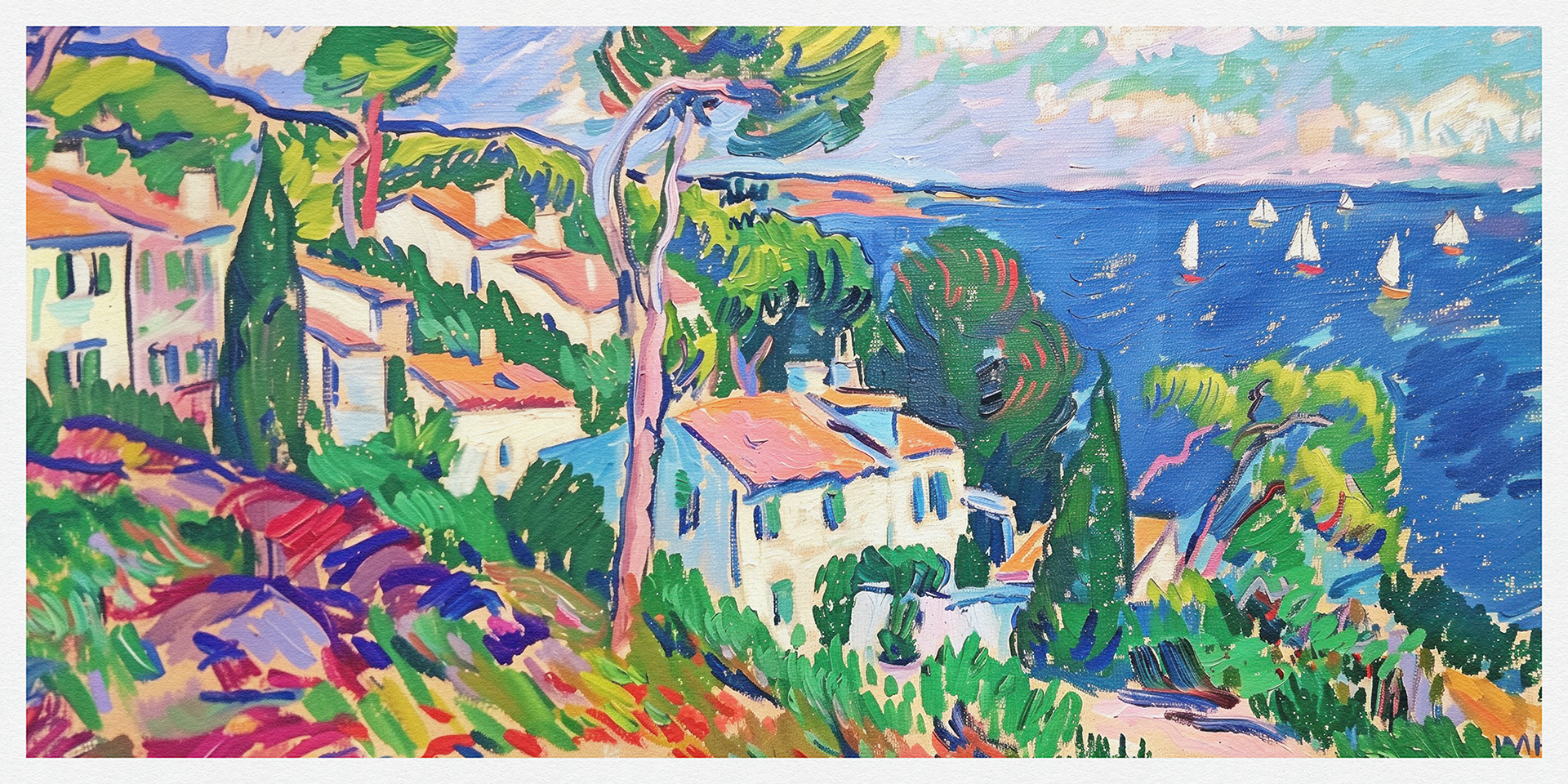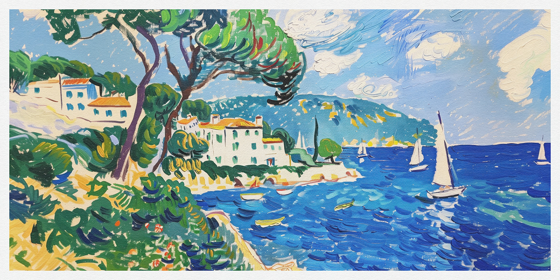 "Coastal Harmony" vibrantly captures serene seaside vistas, blending lush landscapes and charming cottages with bold, dynamic brushstrokes, exuding a sense of idyllic tranquility and the vibrant essence of coastal life.