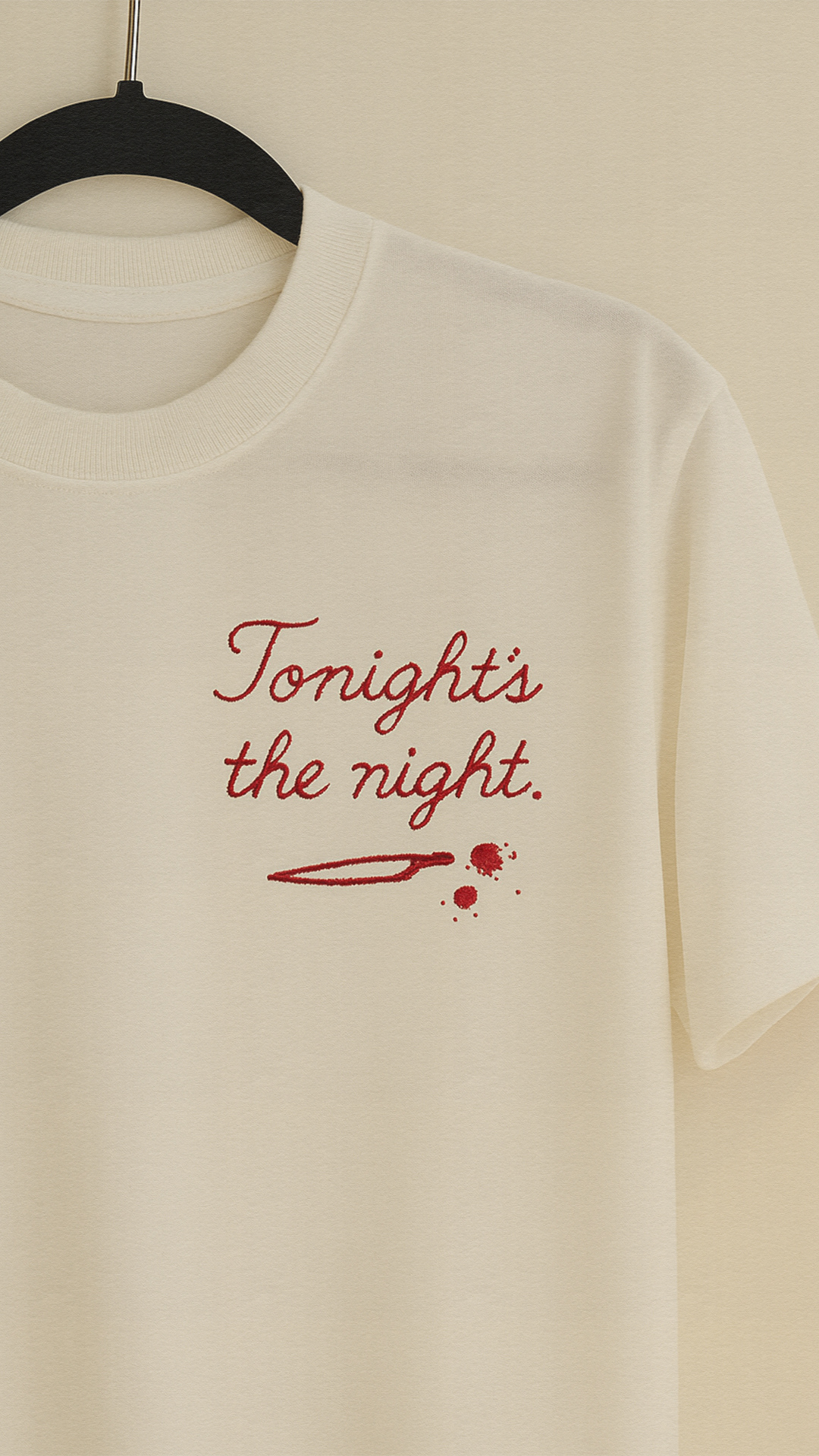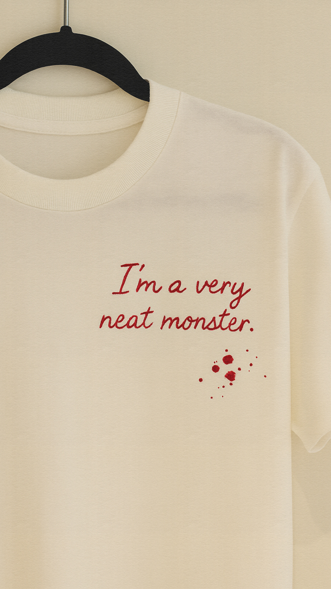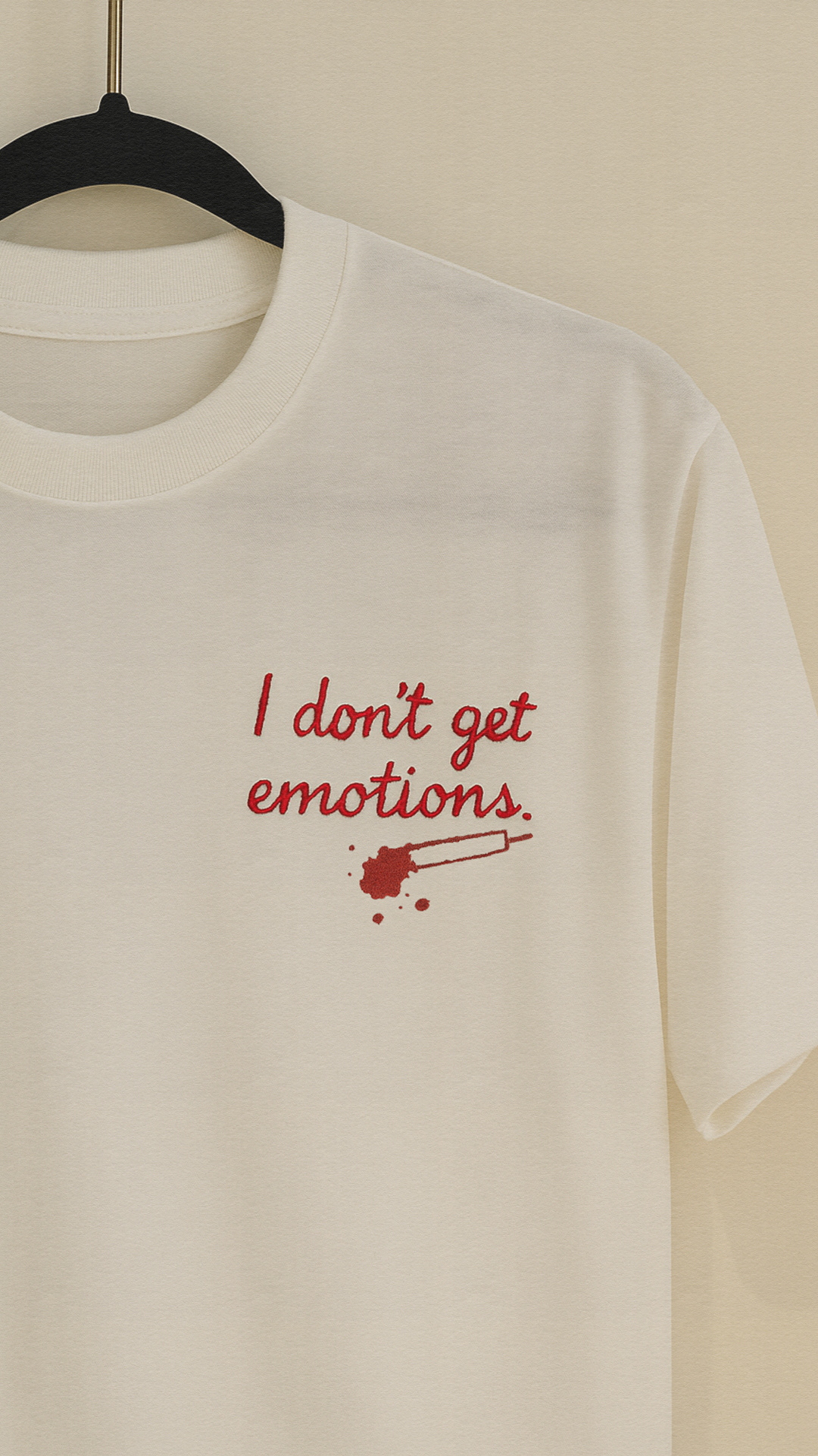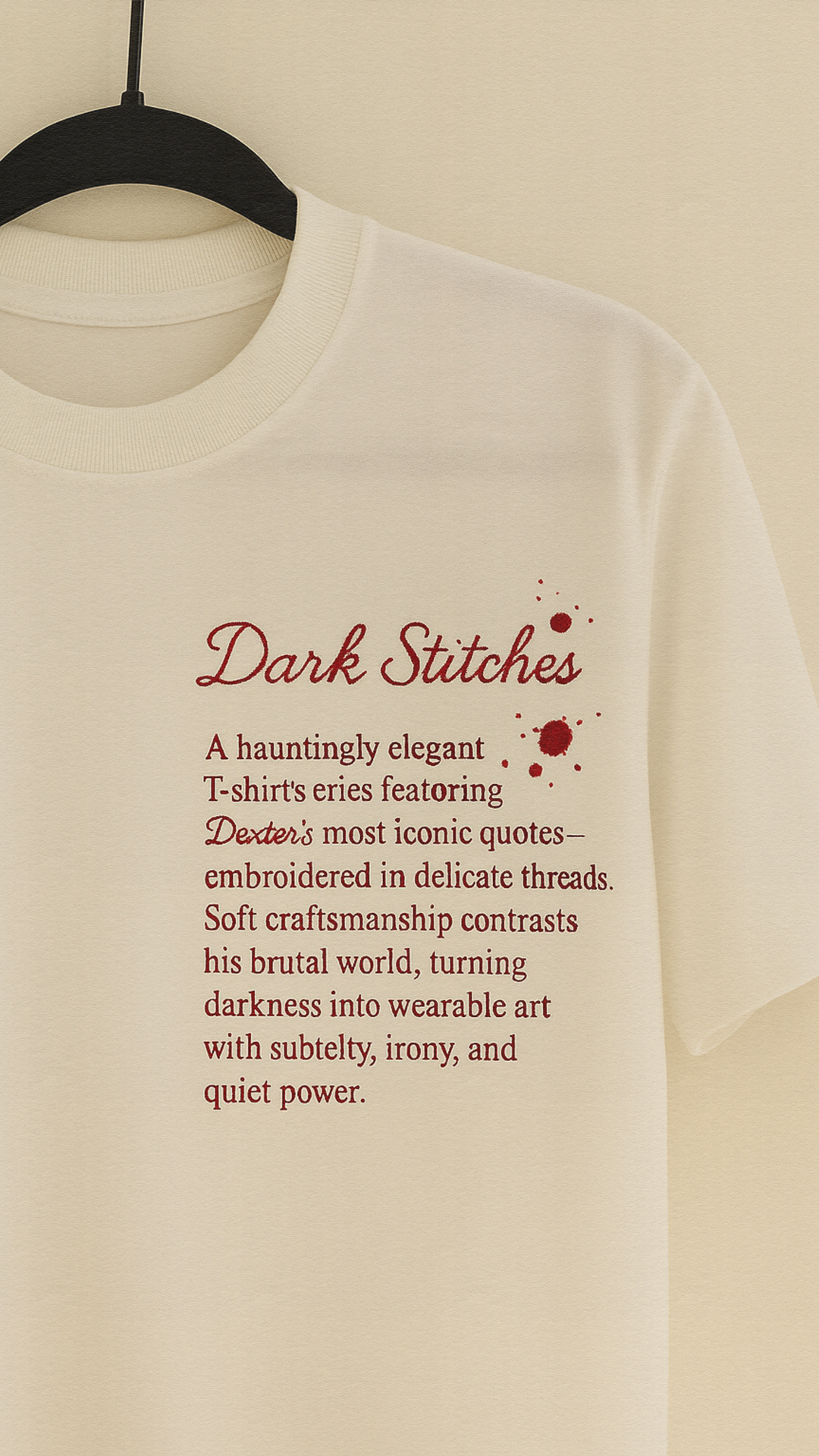 A hauntingly elegant T-shirt series featuring Dexter’s most iconic quotes—embroidered in delicate threads. Soft craftsmanship contrasts his brutal world, turning darkness into wearable art with subtlety, irony, and quiet power.