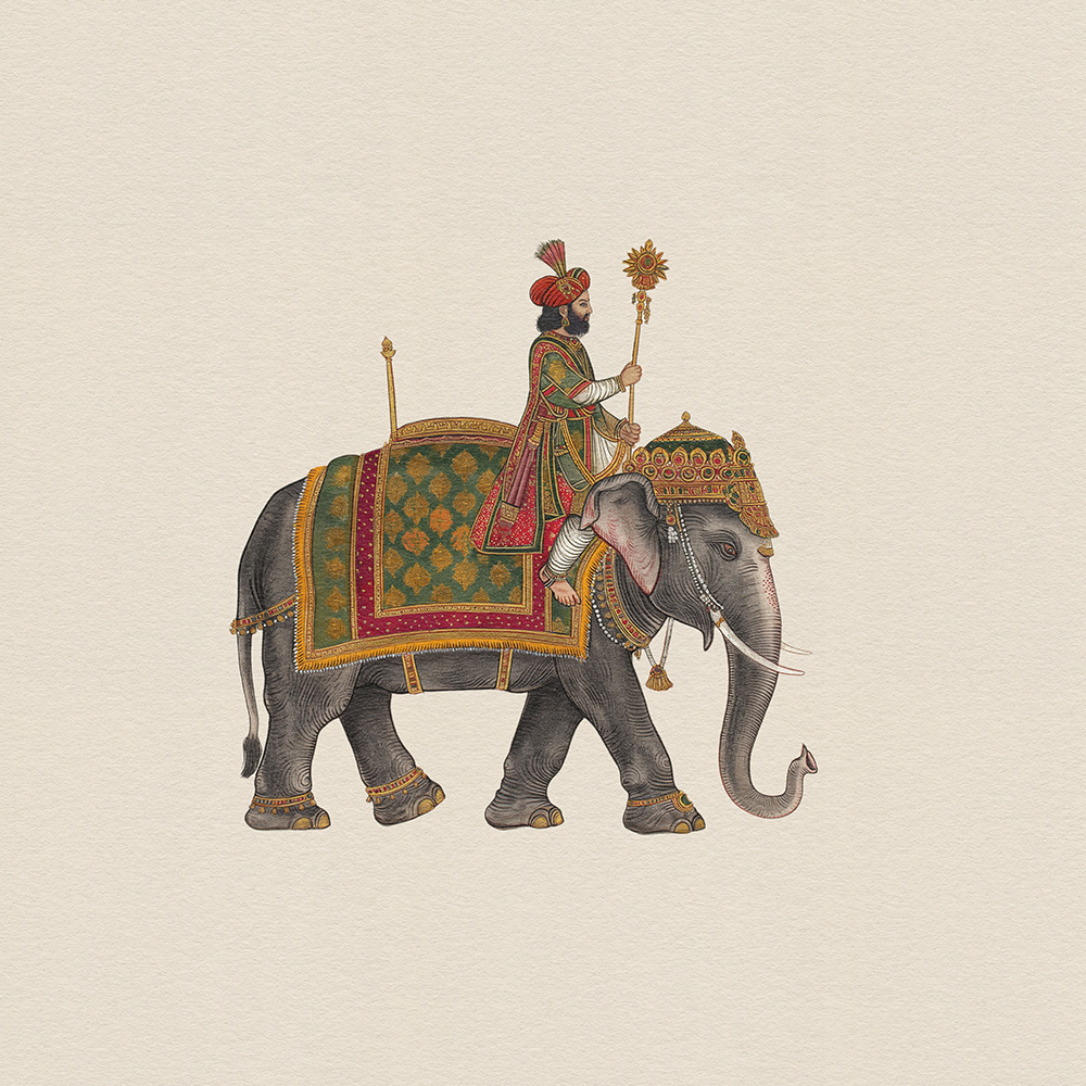 An exquisite art series portraying elaborately adorned elephants carrying royal figures, capturing the grandeur and opulence of India's majestic heritage through intricate details and vibrant colors.