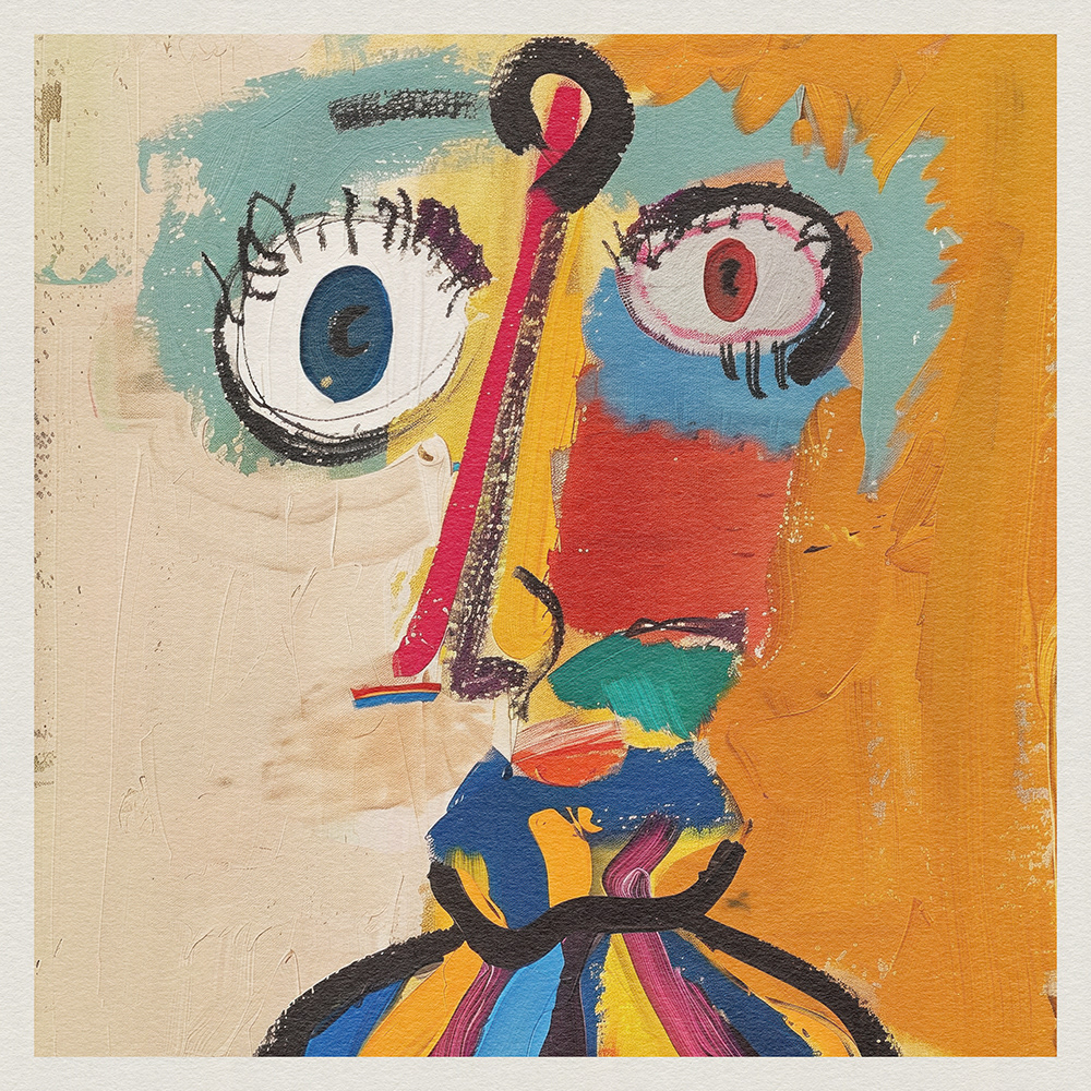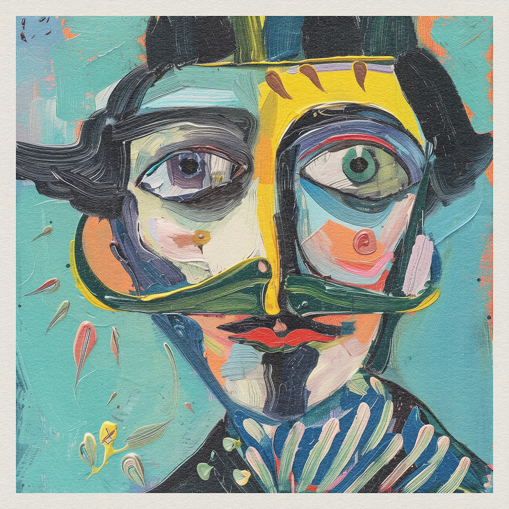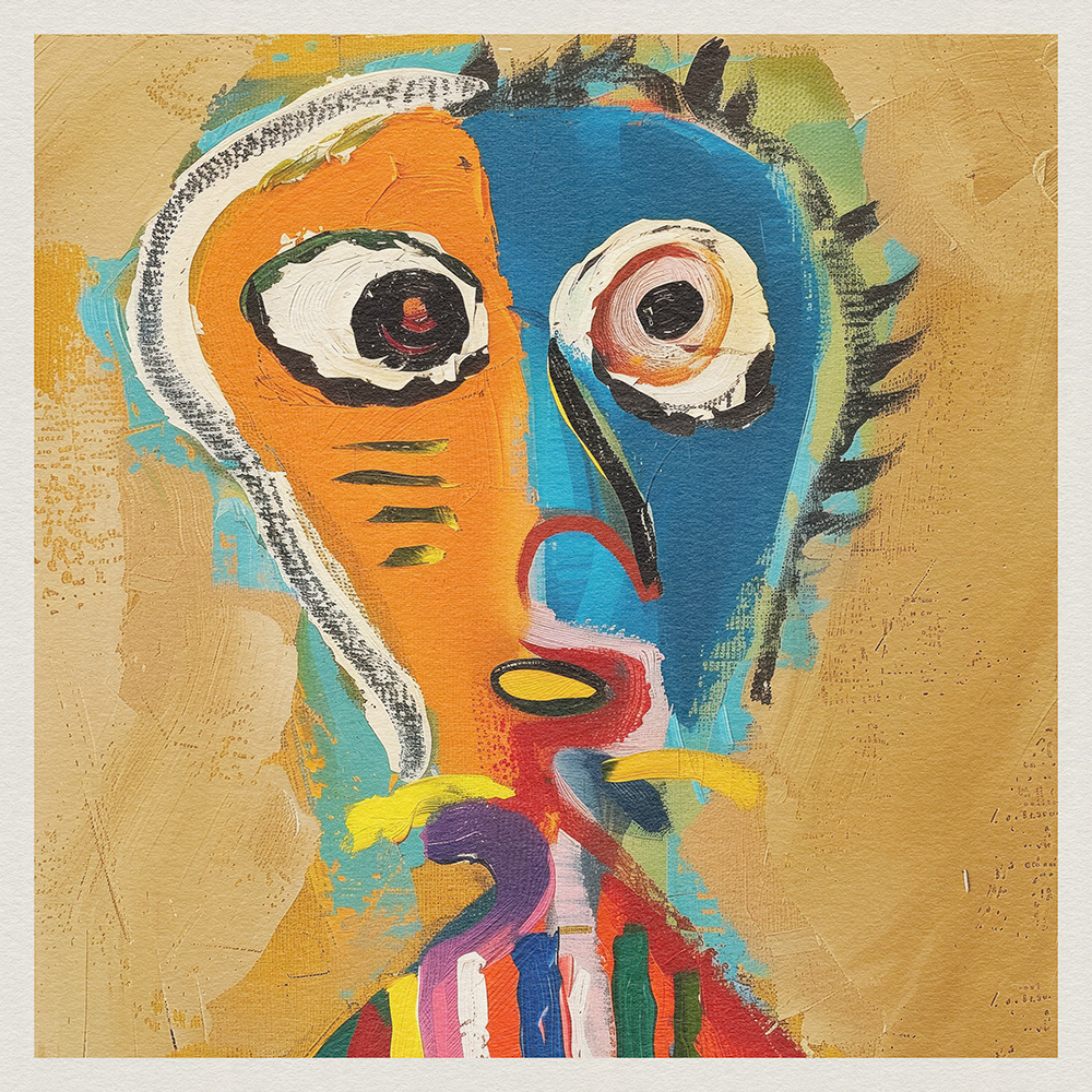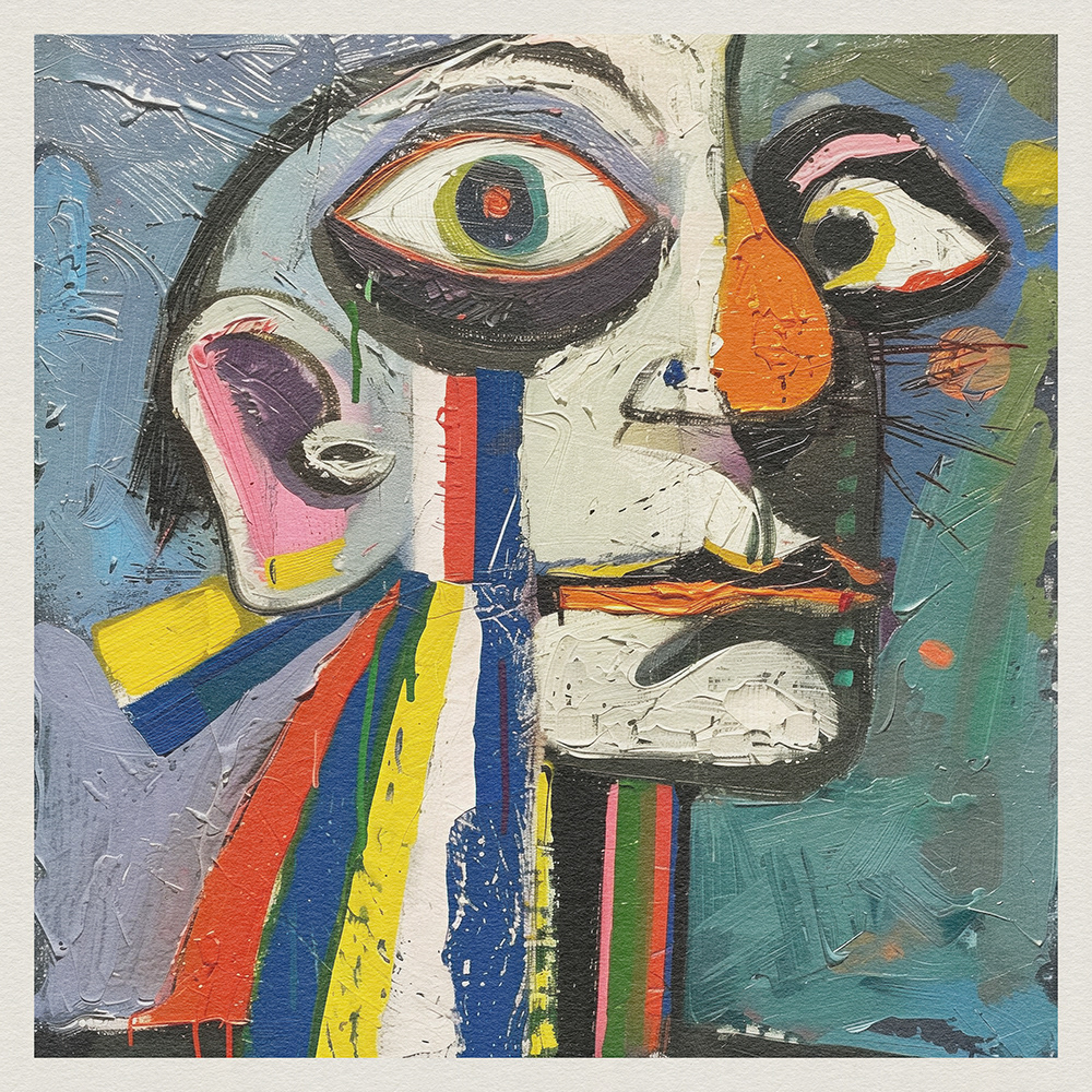The series is a striking exploration of emotional depth, melding chaotic abstraction with the human visage, challenging perceptions of identity through bold color and impassioned, textured strokes