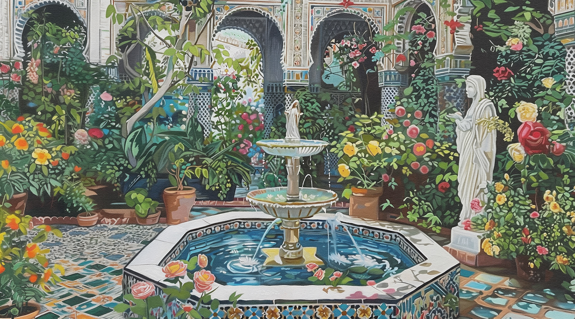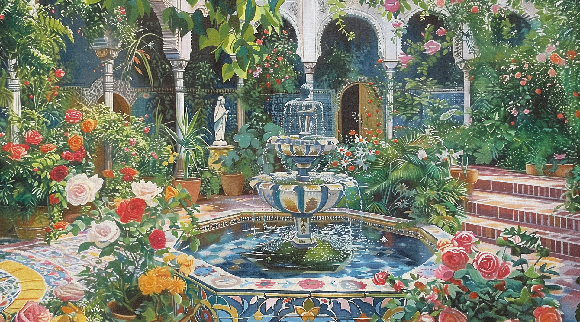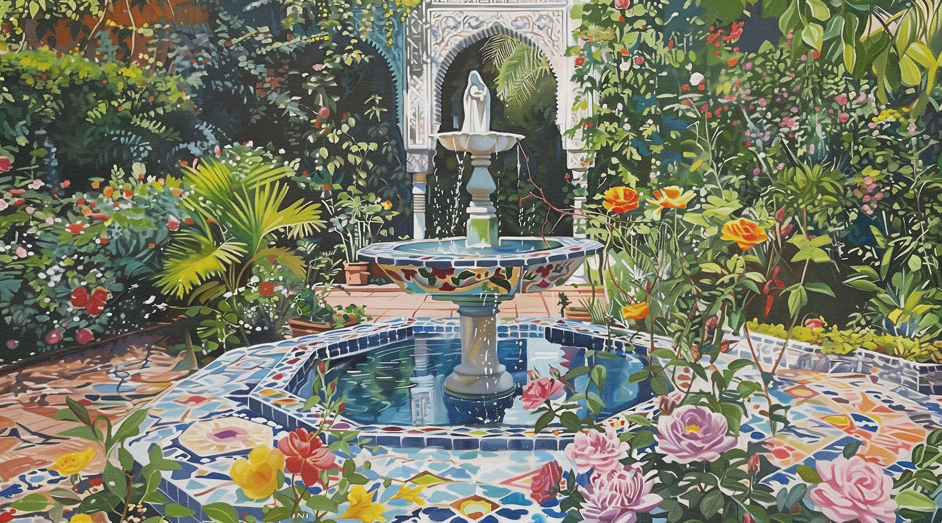 This series captures vibrant, lush courtyards with intricate fountains, showcasing serene, blooming gardens that blend nature's beauty with architectural elegance. Each piece invites peaceful contemplation amidst floral splendor.