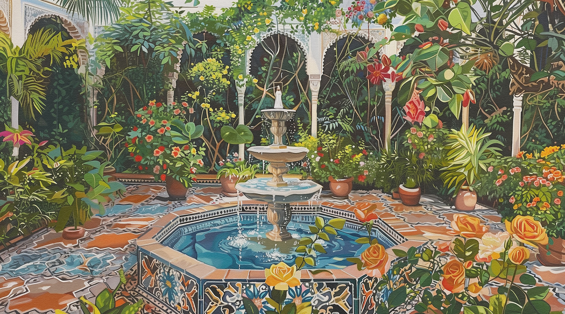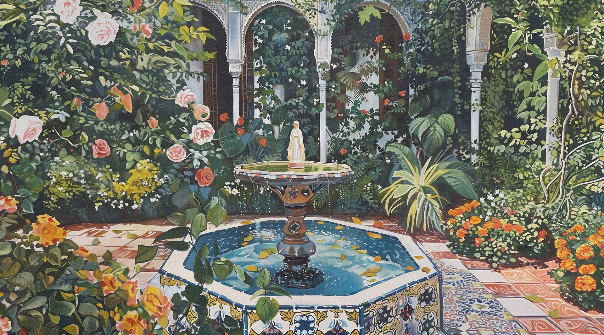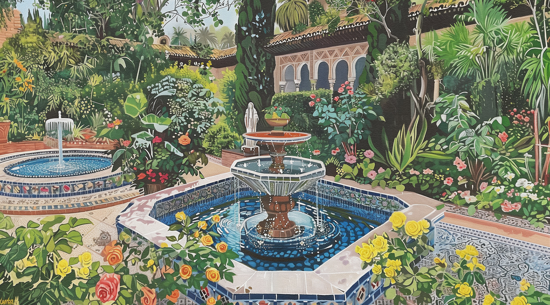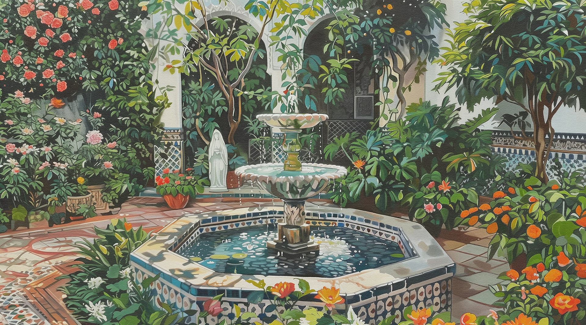 This series captures vibrant, lush courtyards with intricate fountains, showcasing serene, blooming gardens that blend nature's beauty with architectural elegance. Each piece invites peaceful contemplation amidst floral splendor.