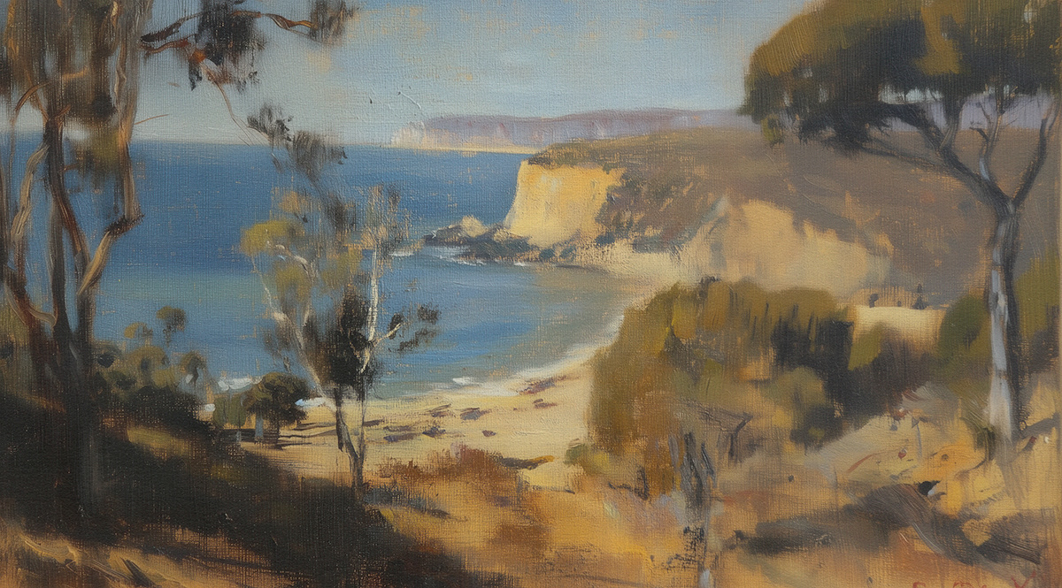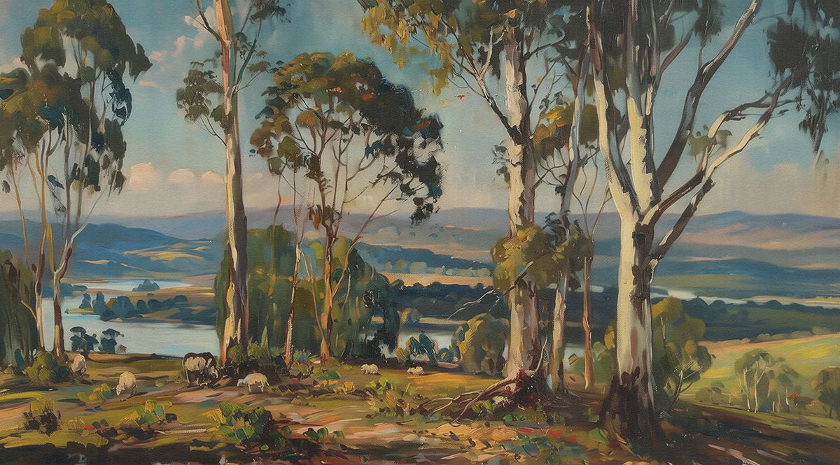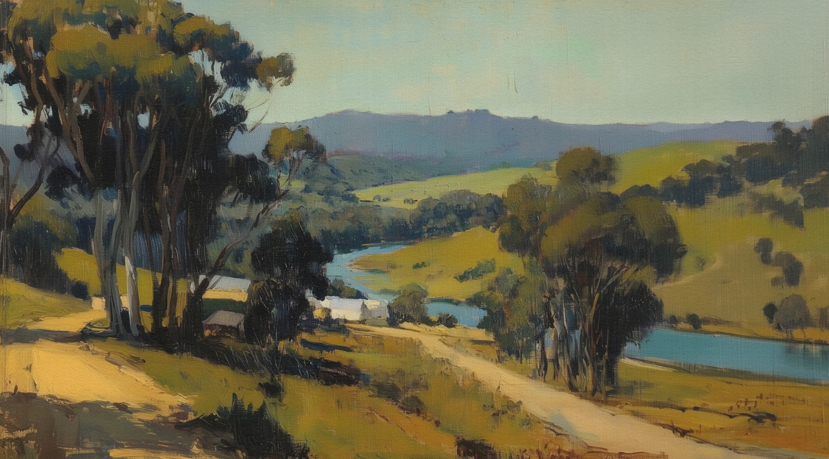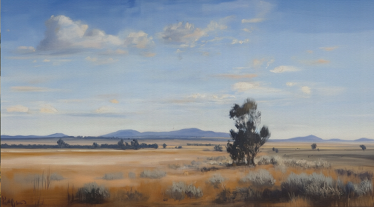 This evocative oil painting series captures the vast beauty of Australian landscapes—sun-drenched fields, coastal horizons, and eucalyptus-lined roads—paying homage to Arthur Streeton’s impressionist brushwork and plein air storytelling.