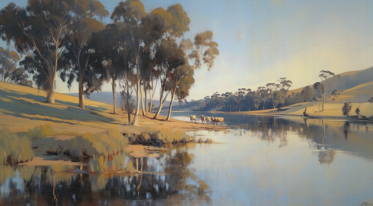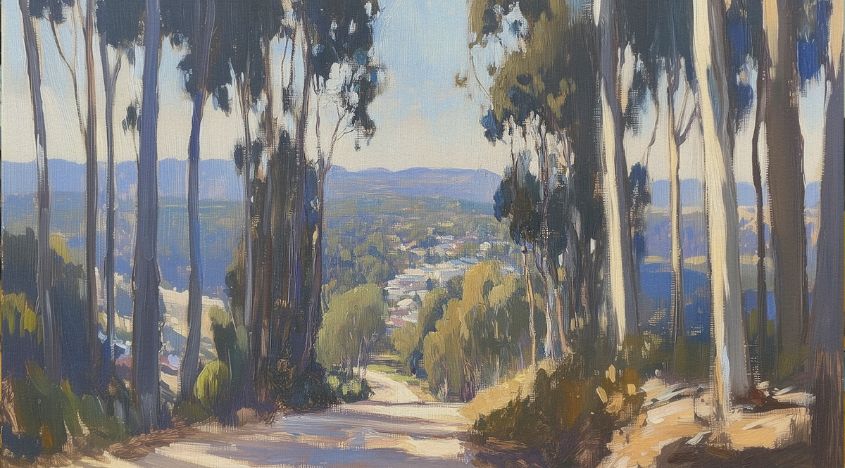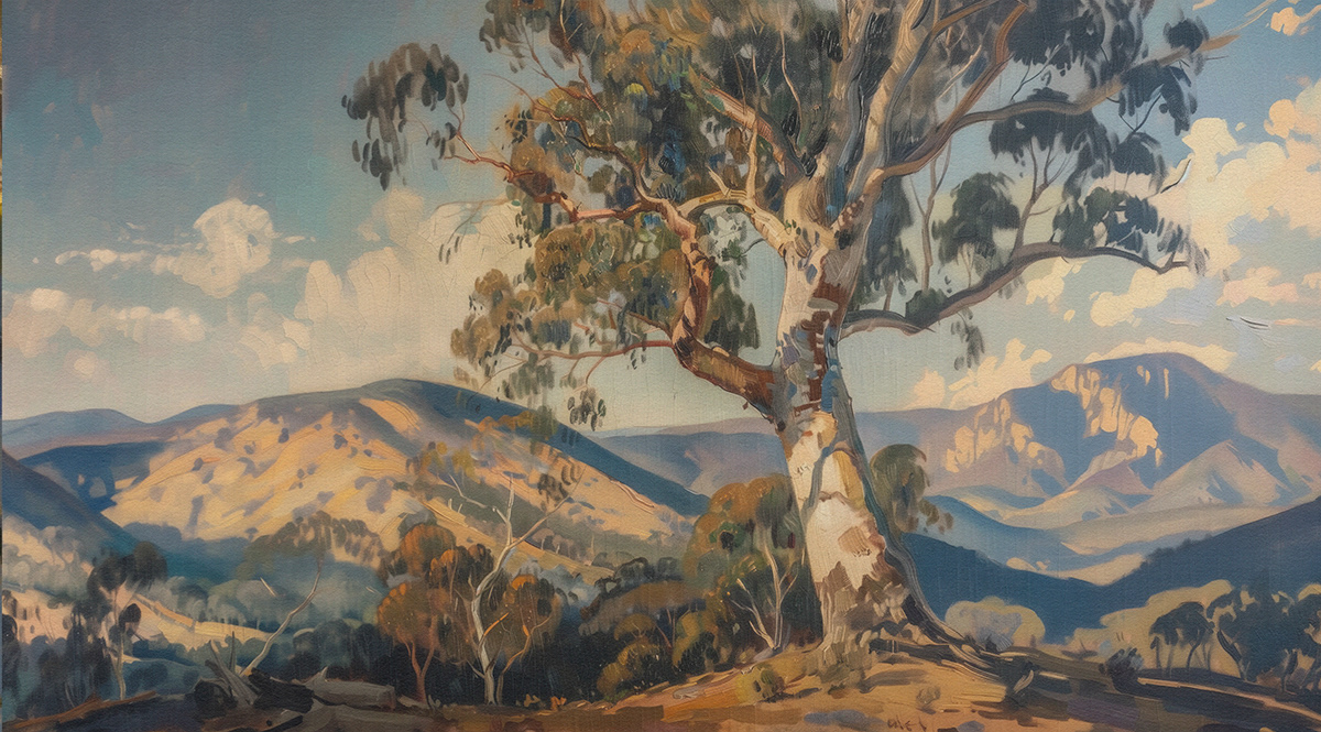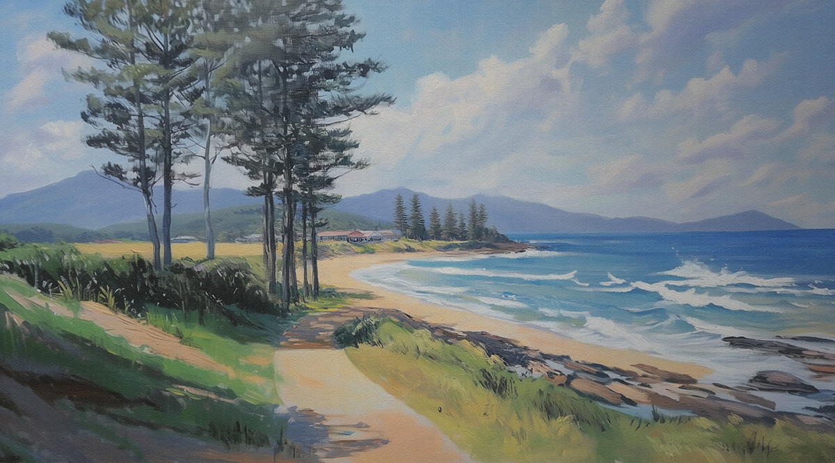 This evocative oil painting series captures the vast beauty of Australian landscapes—sun-drenched fields, coastal horizons, and eucalyptus-lined roads—paying homage to Arthur Streeton’s impressionist brushwork and plein air storytelling.