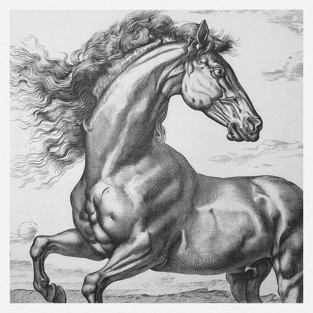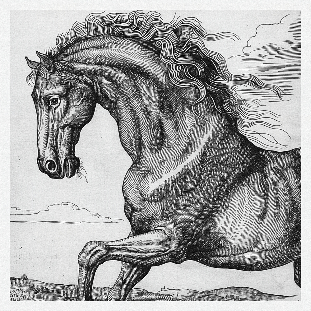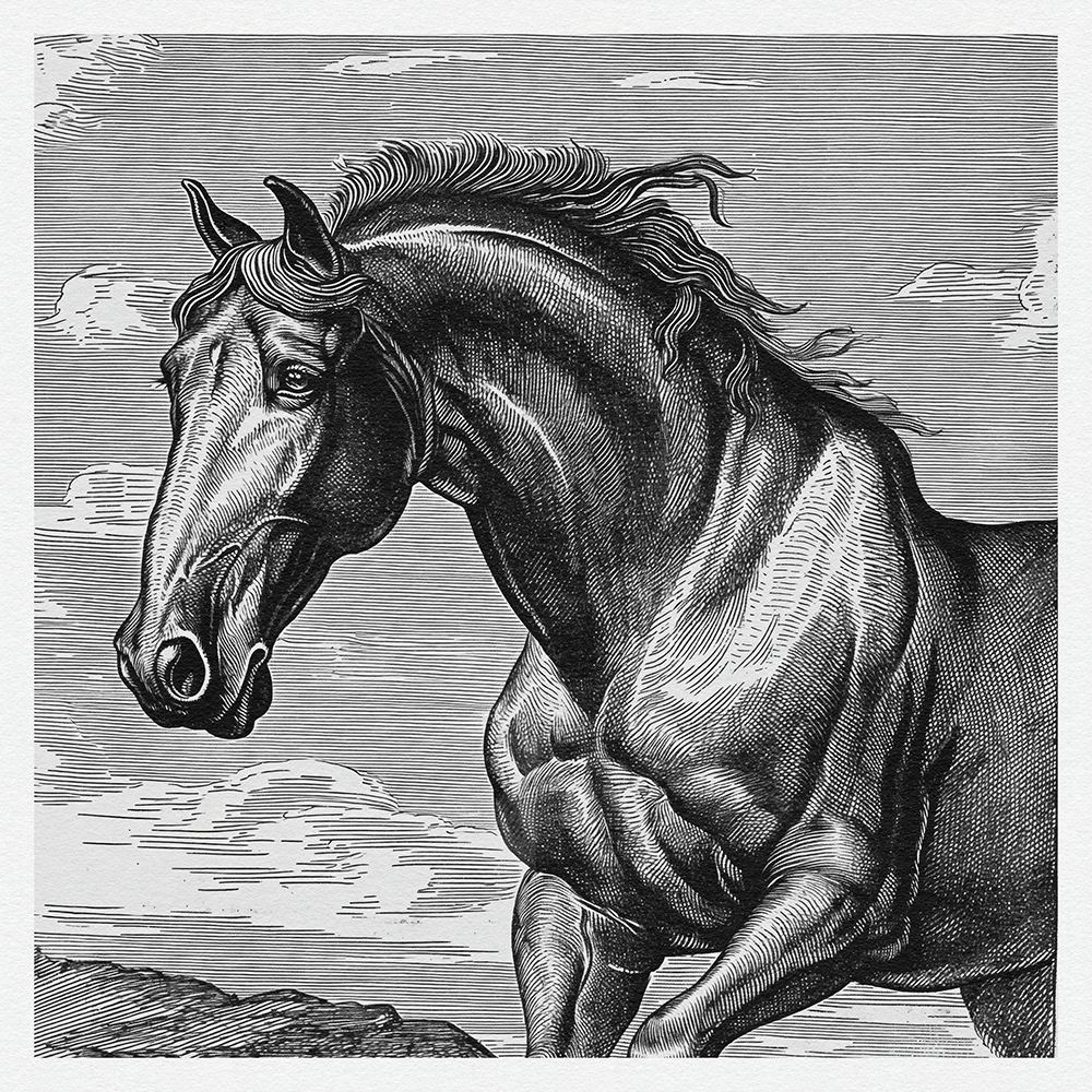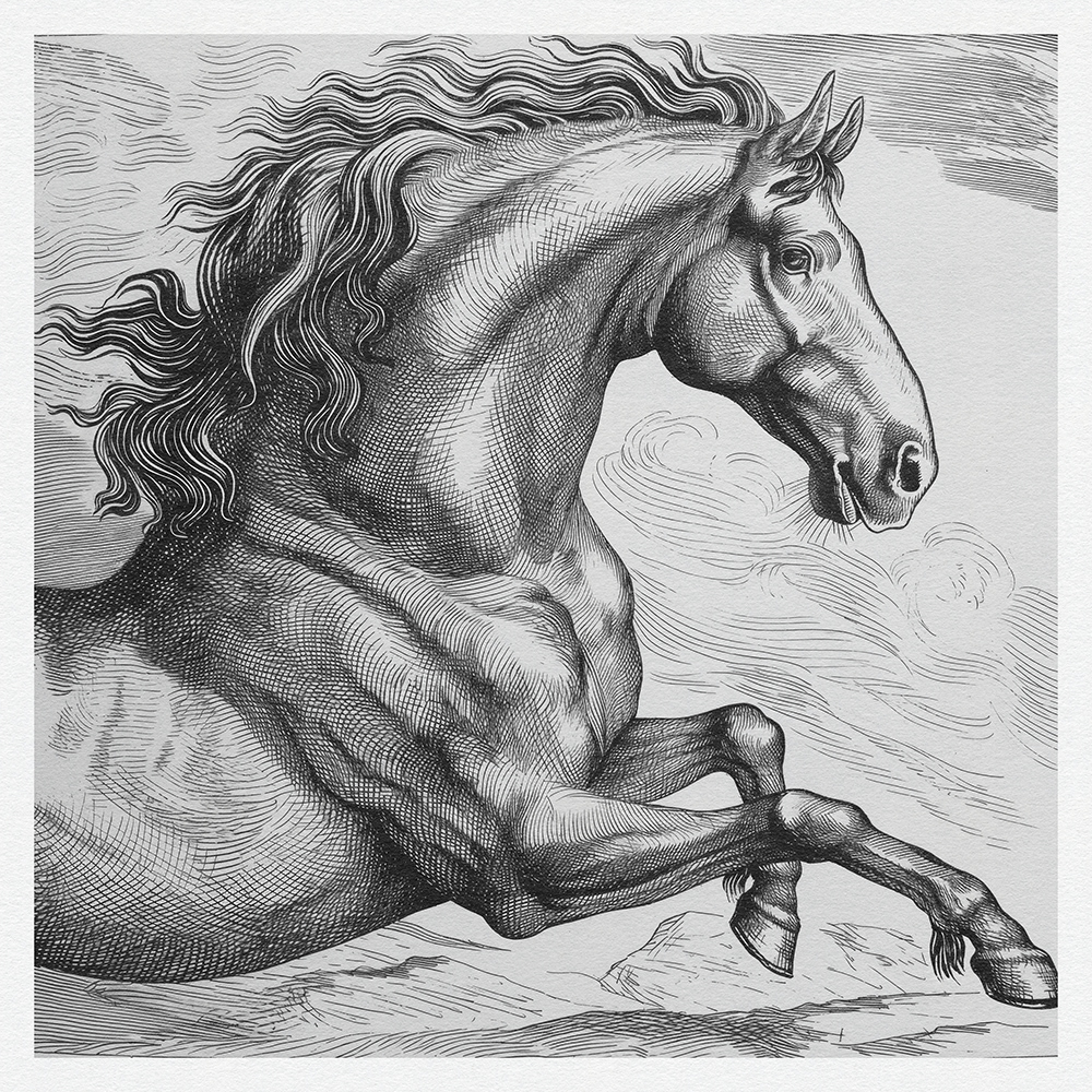 This art series captures the power, grace, and dynamic beauty of horses in meticulously detailed black-and-white etchings, showcasing their majestic presence and fluid motion with exquisite line work.