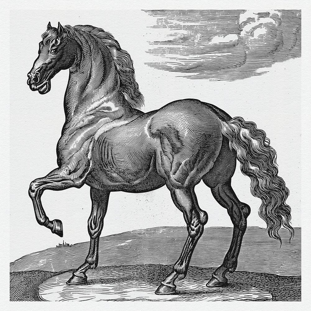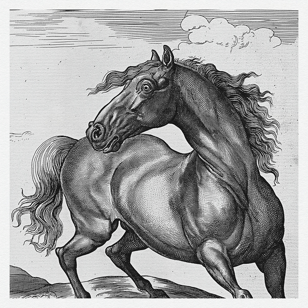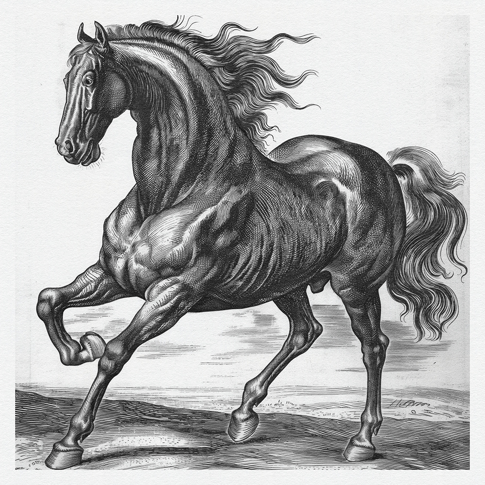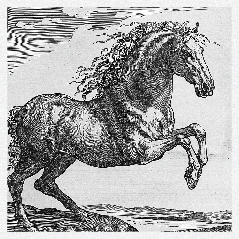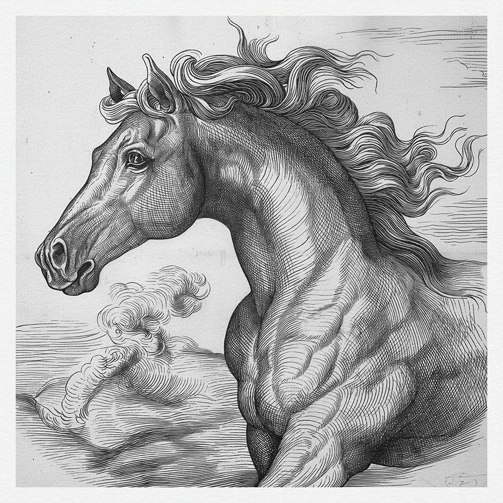 This art series captures the power, grace, and dynamic beauty of horses in meticulously detailed black-and-white etchings, showcasing their majestic presence and fluid motion with exquisite line work.