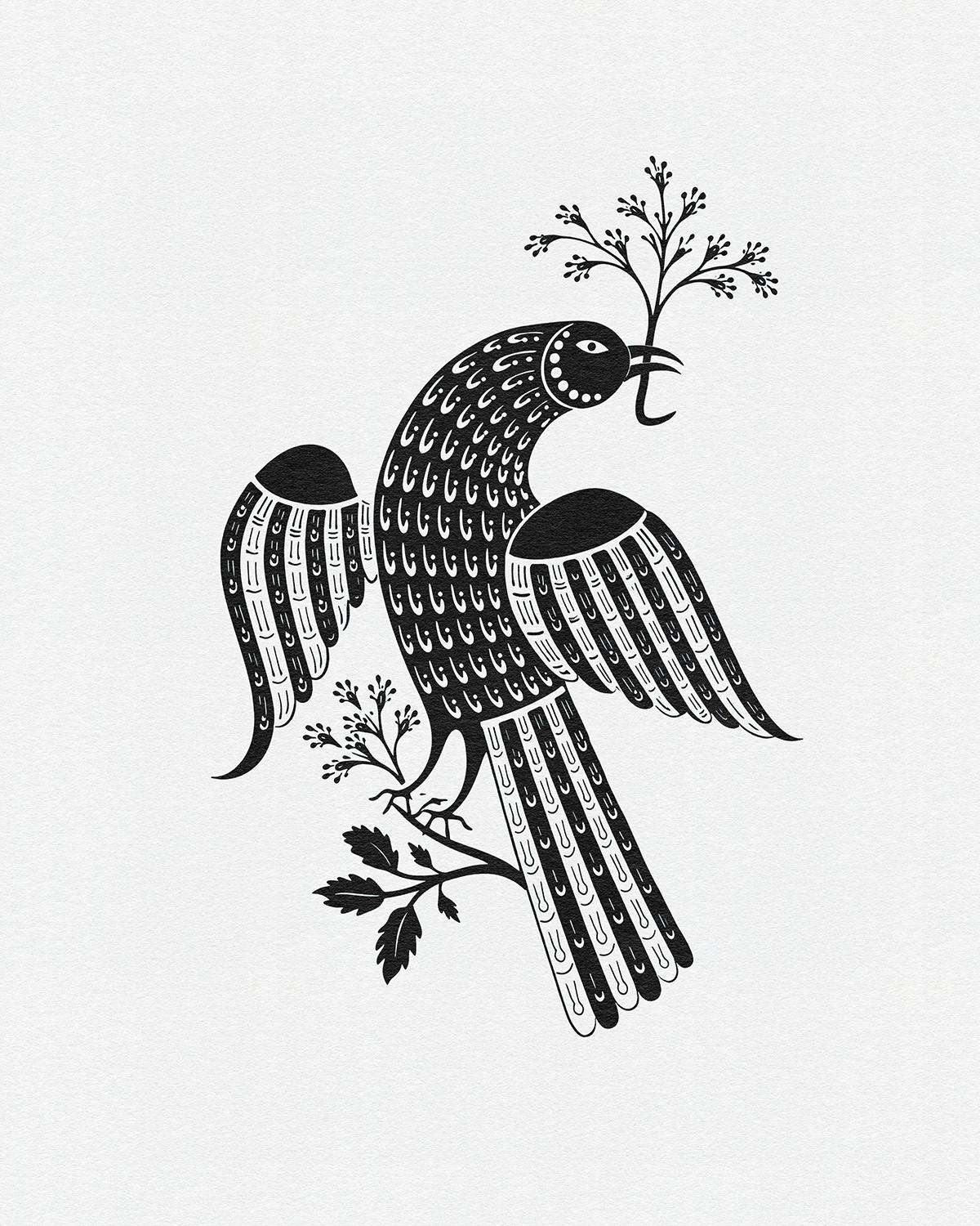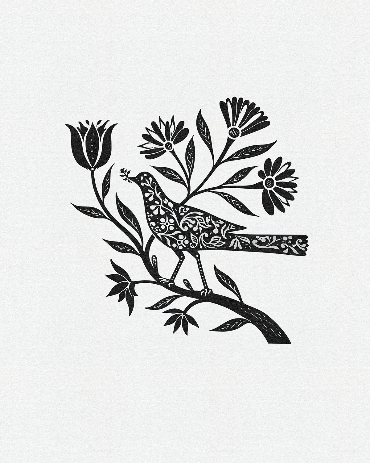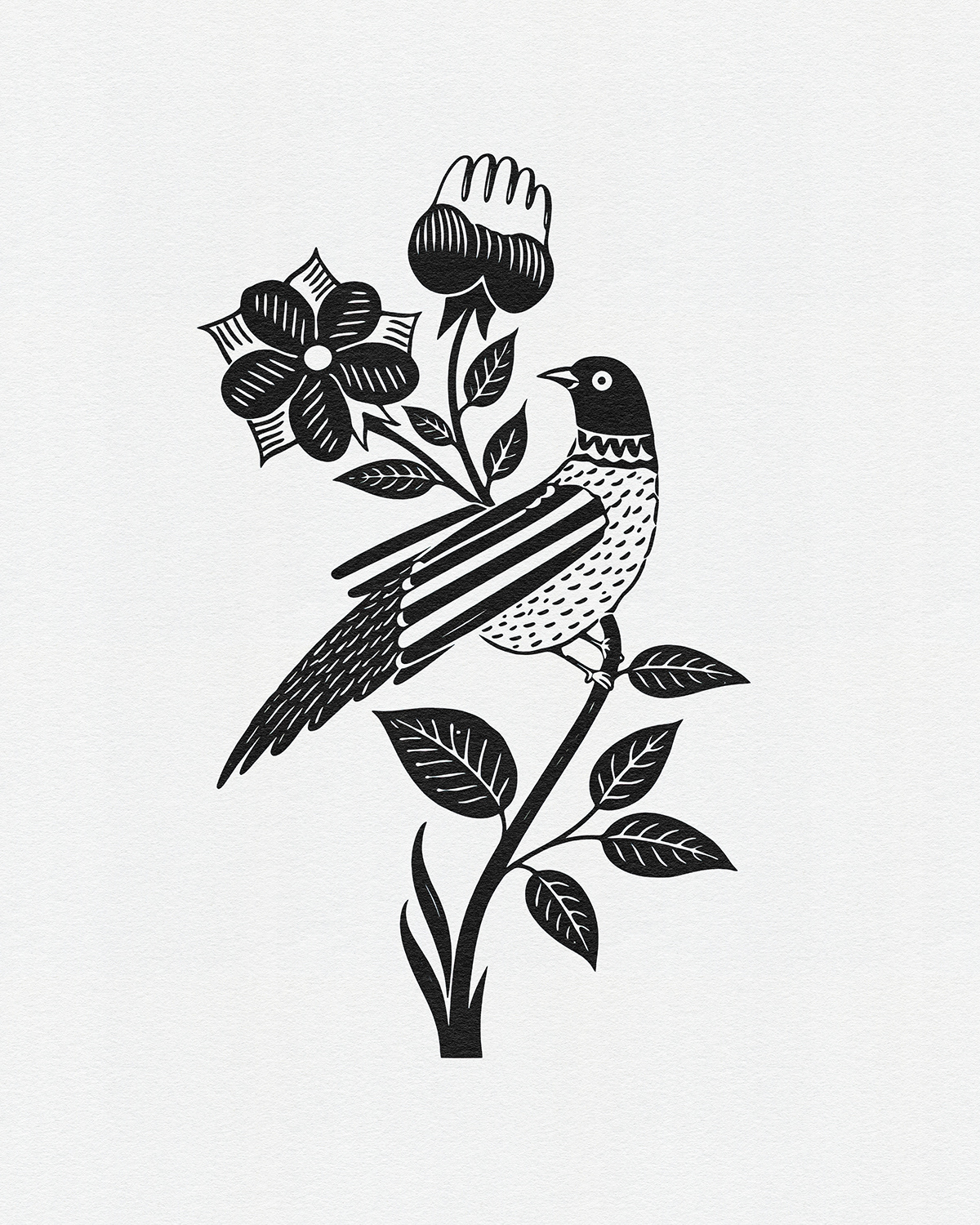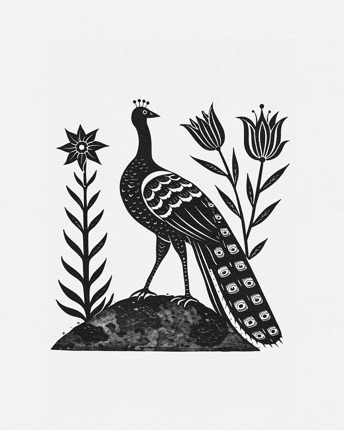 A refined series of black-and-white bird illustrations rooted in Indian block prints, merging folk art, vintage woodcut aesthetics, and botanical motifs—timeless decorative works for textiles, wallpapers, and art-led interiors.