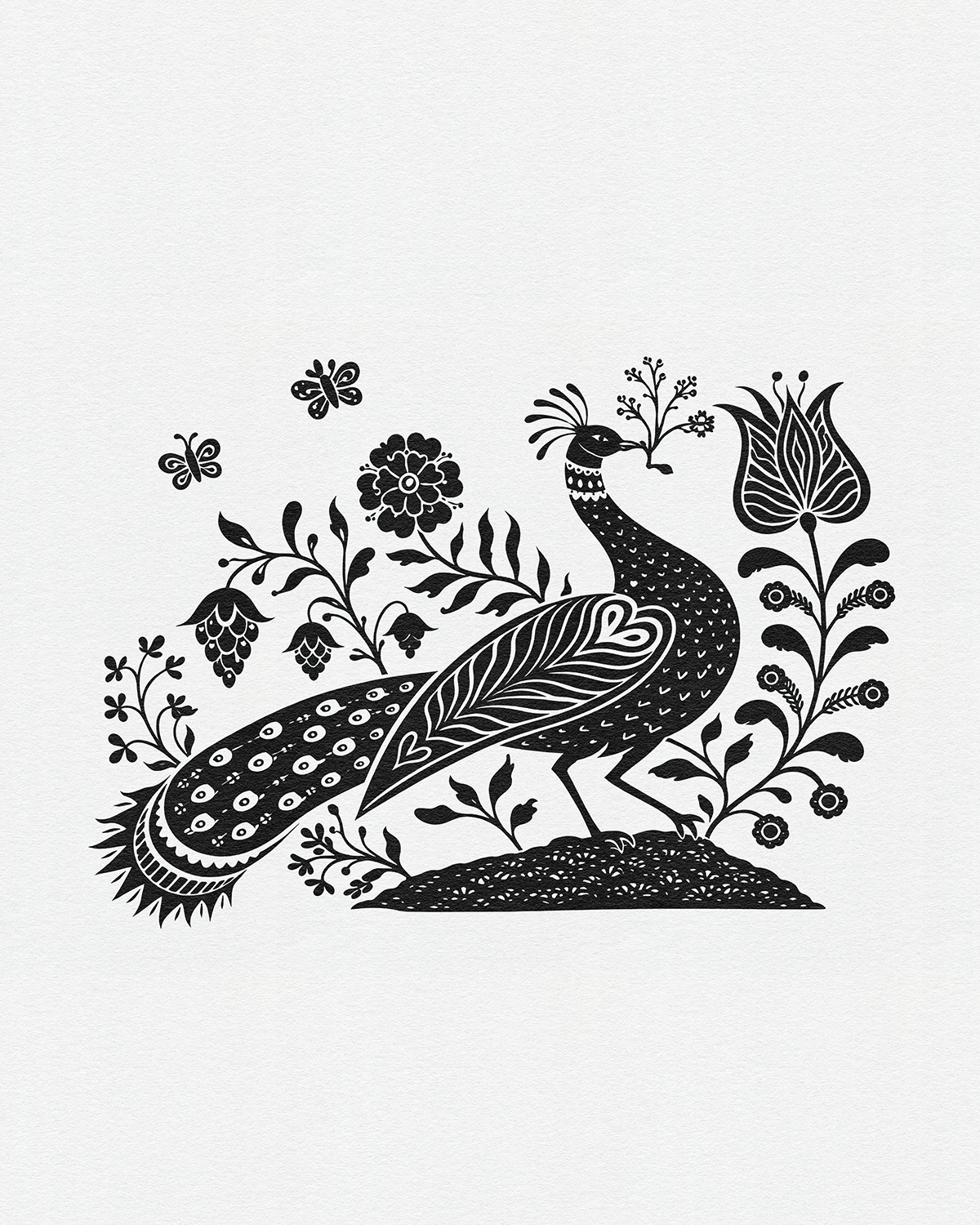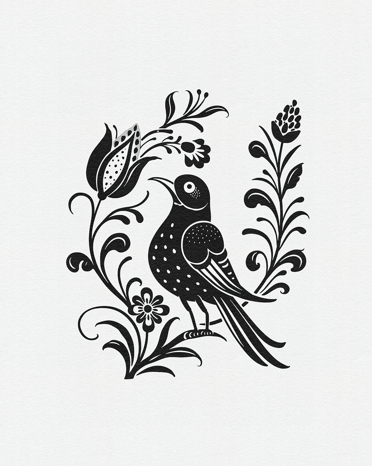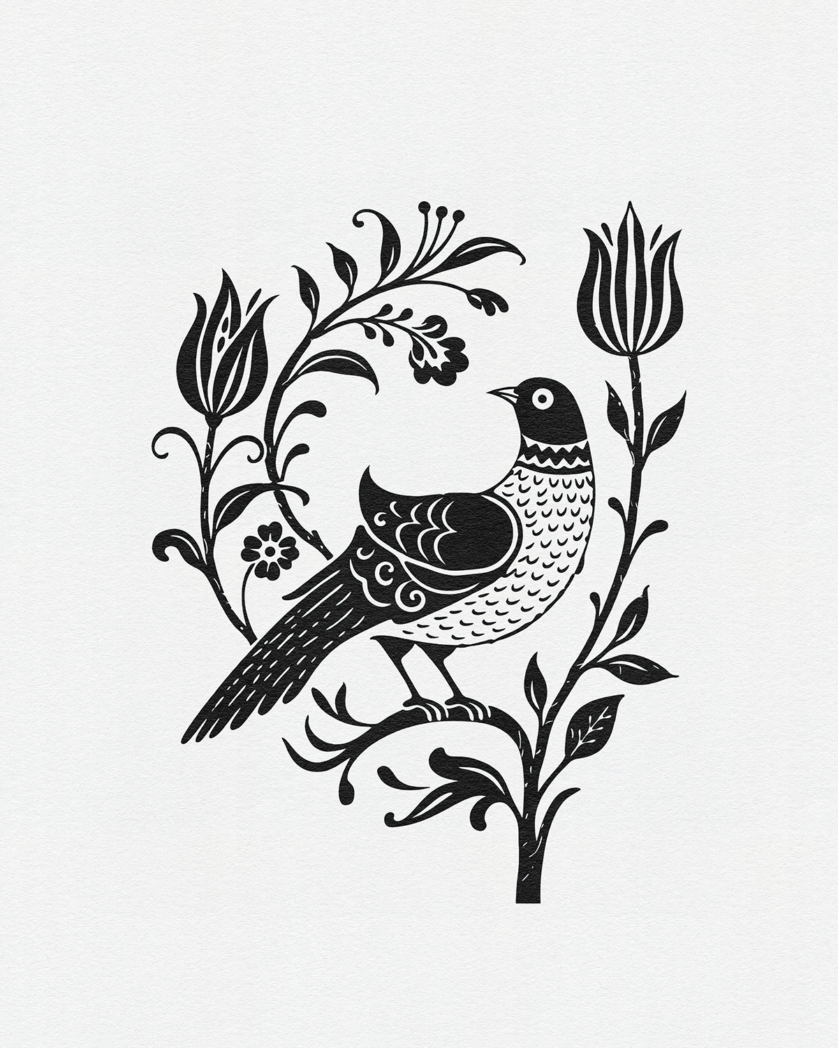 A refined series of black-and-white bird illustrations rooted in Indian block prints, merging folk art, vintage woodcut aesthetics, and botanical motifs—timeless decorative works for textiles, wallpapers, and art-led interiors.