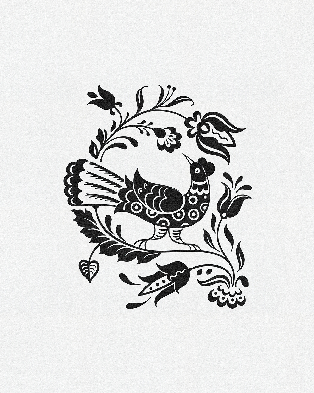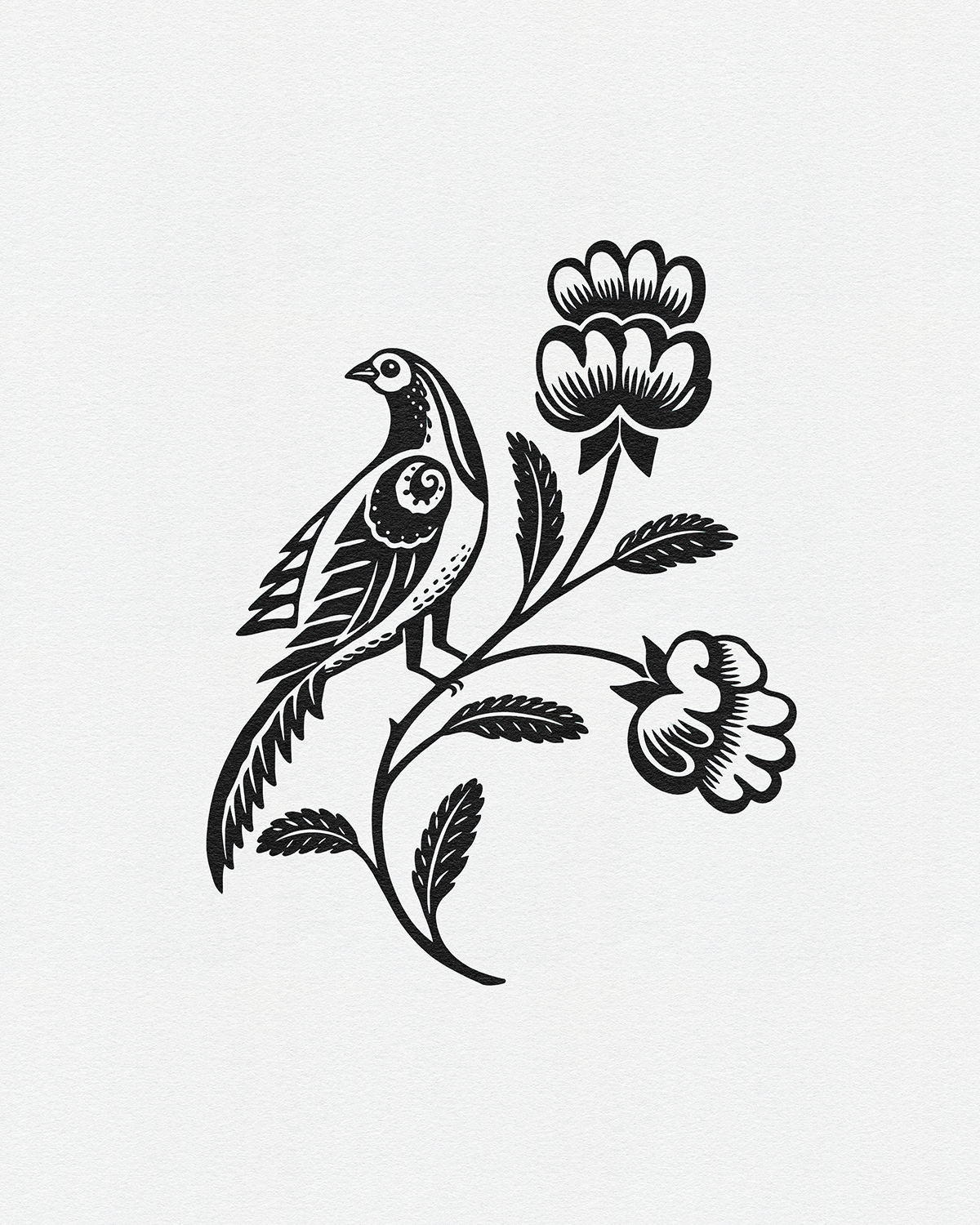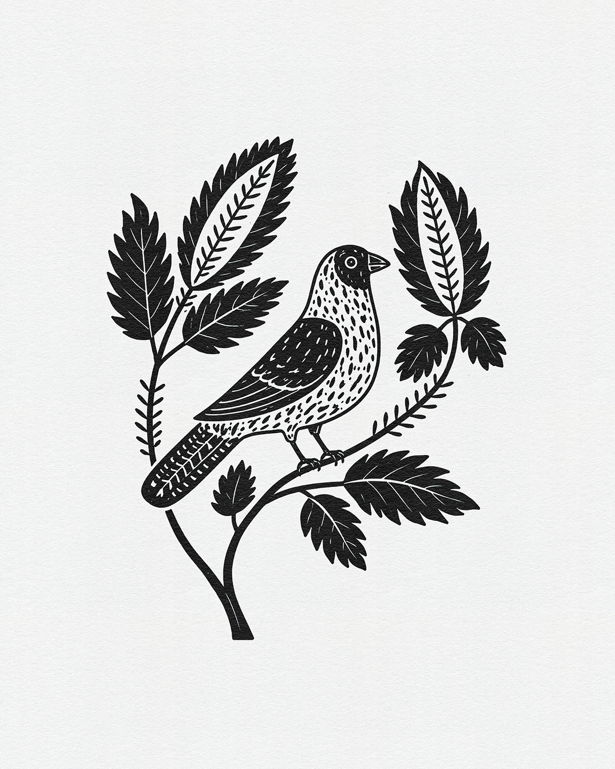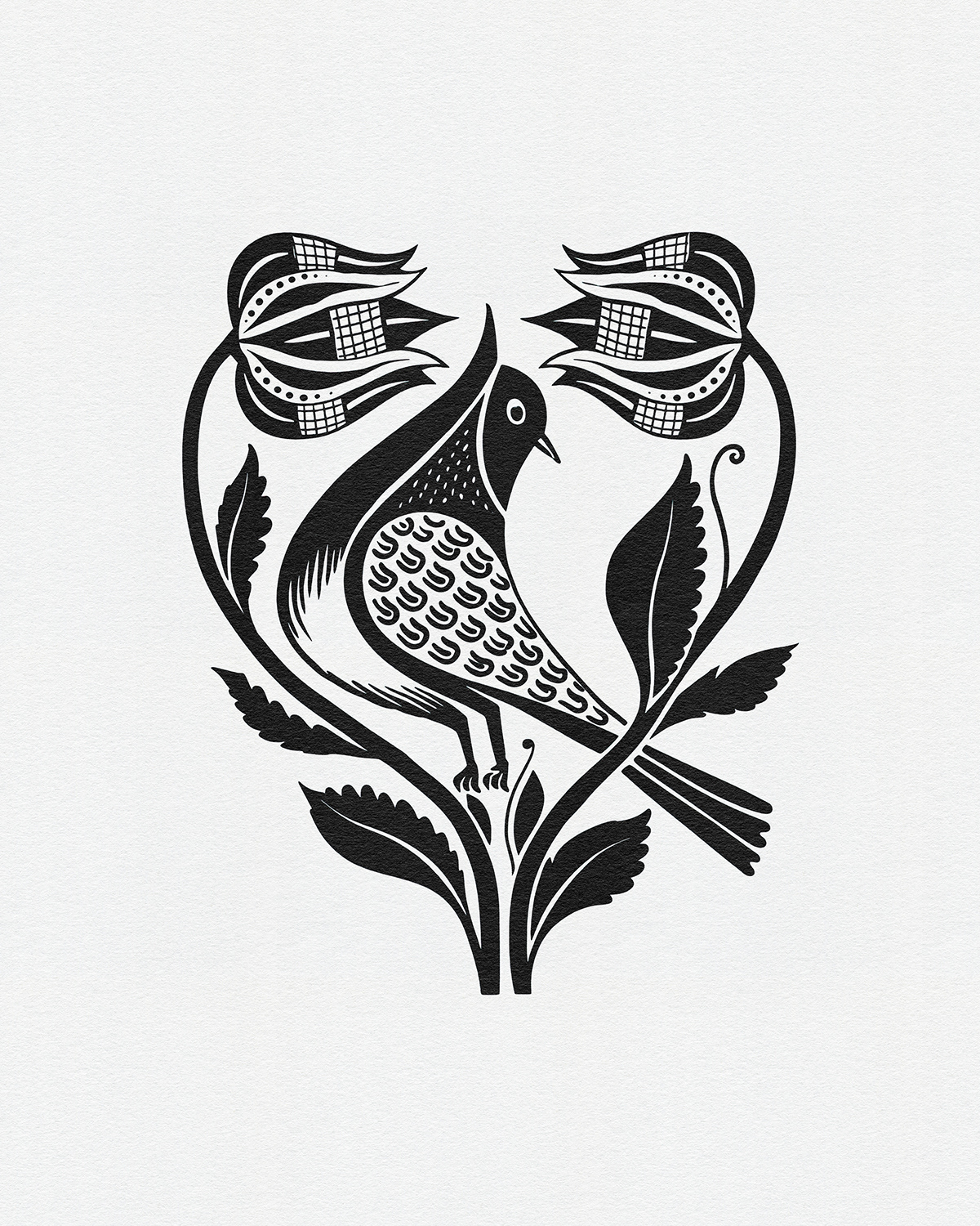A refined series of black-and-white bird illustrations rooted in Indian block prints, merging folk art, vintage woodcut aesthetics, and botanical motifs—timeless decorative works for textiles, wallpapers, and art-led interiors.