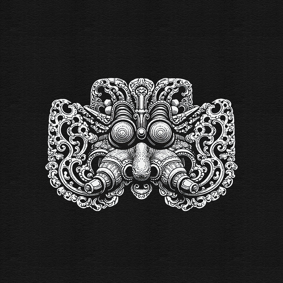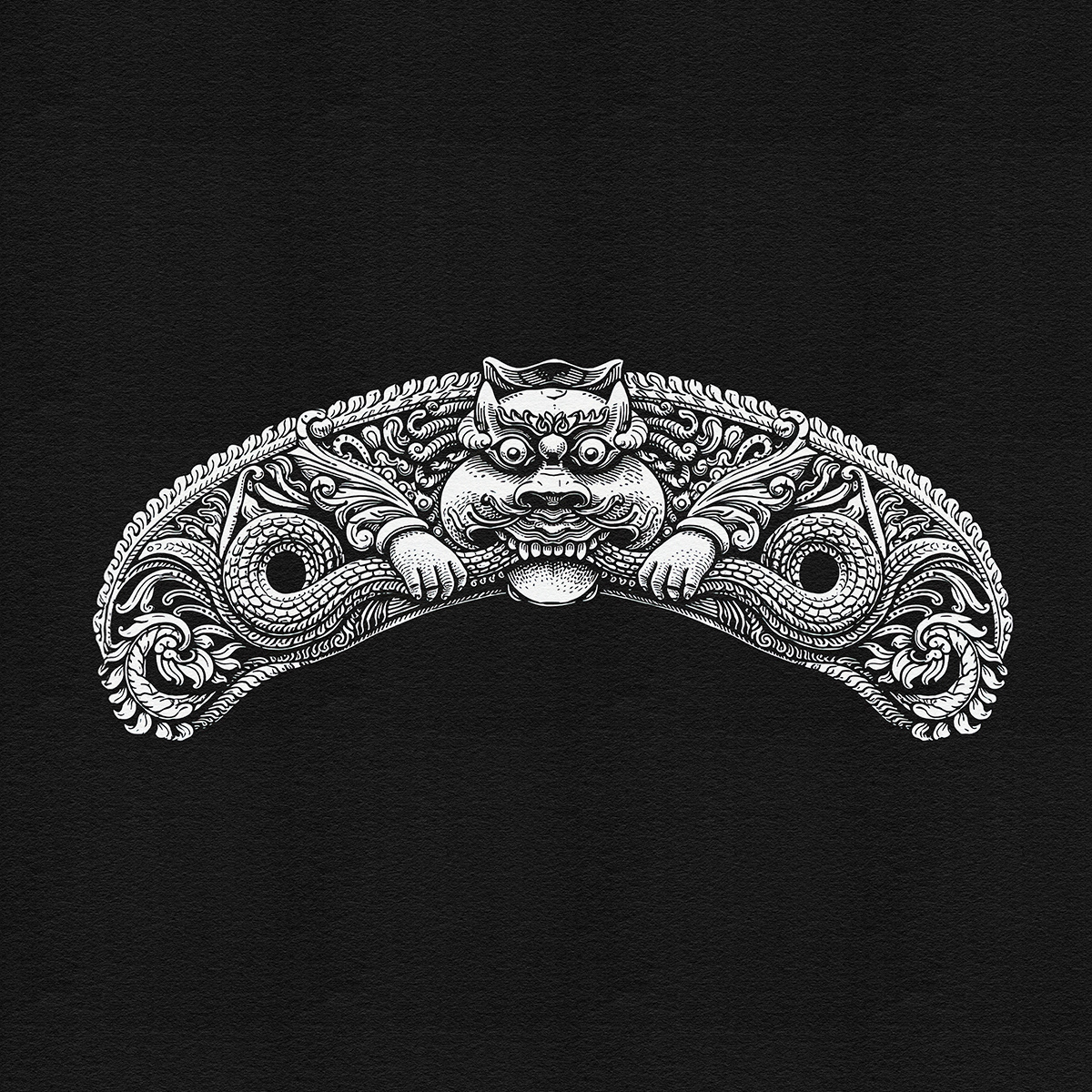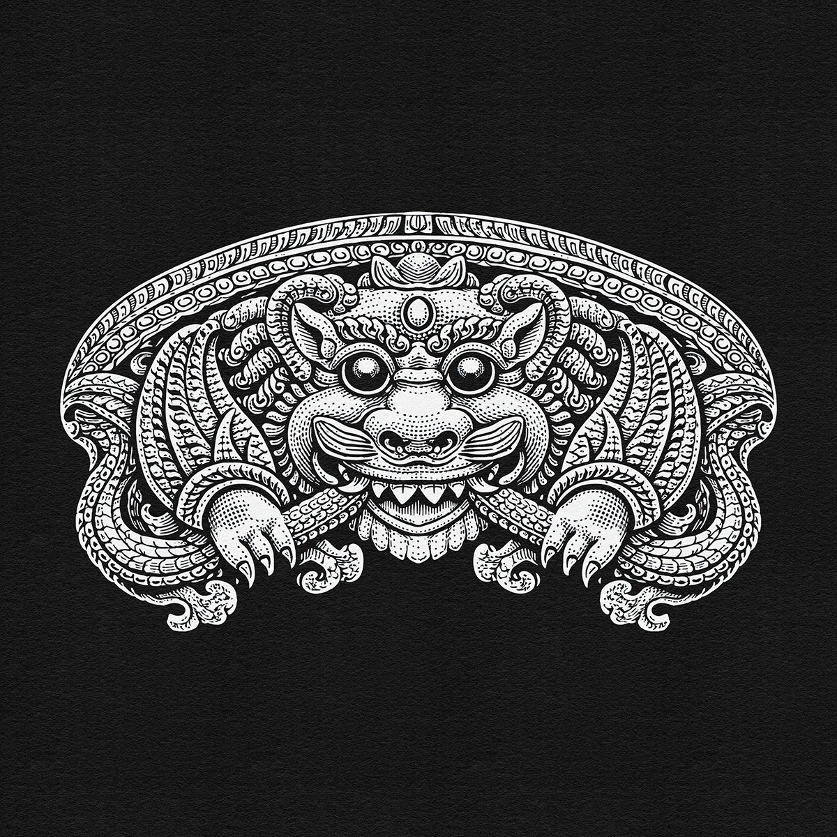 A powerful black-and-white Kirtimukha series reinterpreting sacred temple guardians through intricate linework and ornamental symmetry, blending mythological intensity with contemporary graphic precision and ceremonial presence.