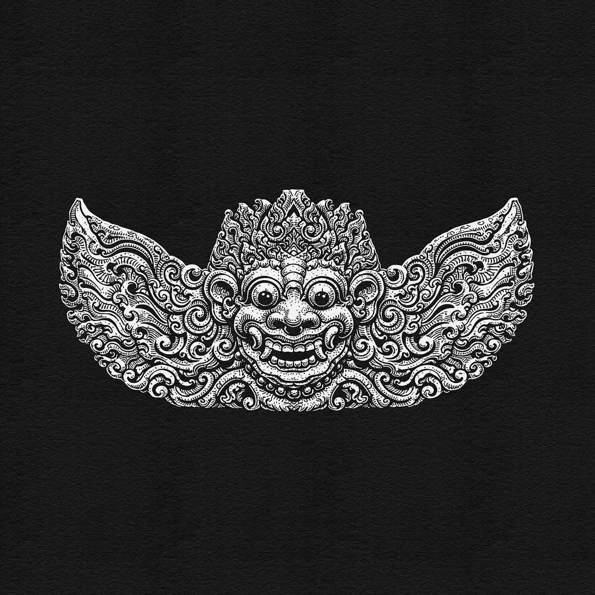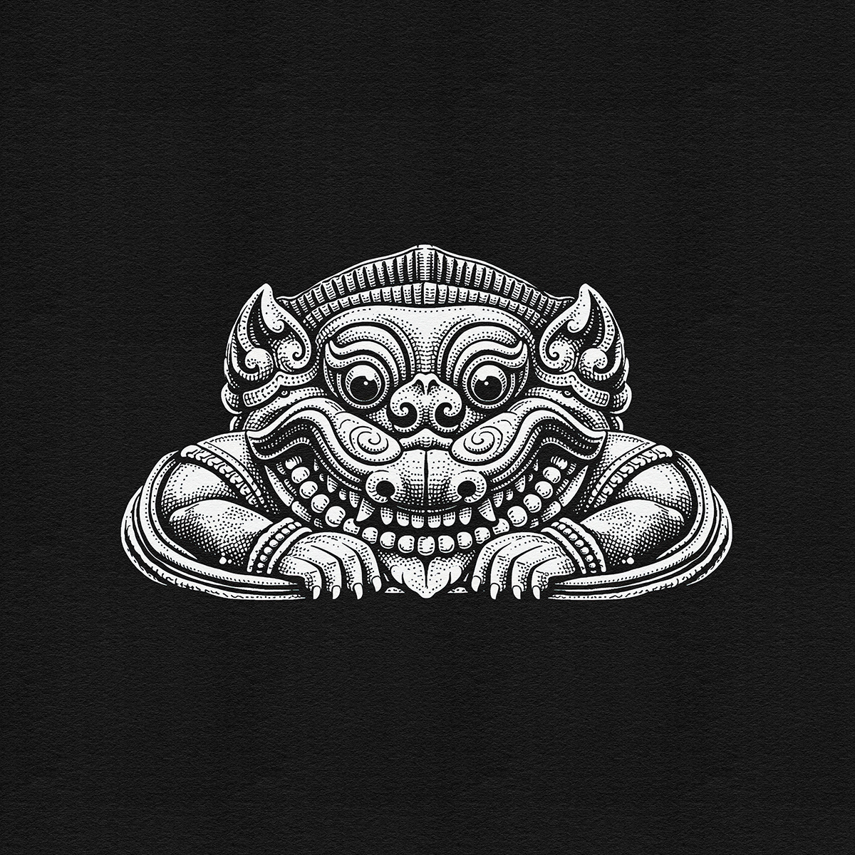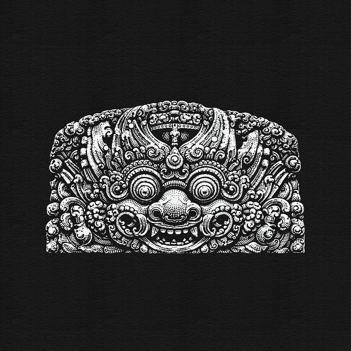 A powerful black-and-white Kirtimukha series reinterpreting sacred temple guardians through intricate linework and ornamental symmetry, blending mythological intensity with contemporary graphic precision and ceremonial presence.