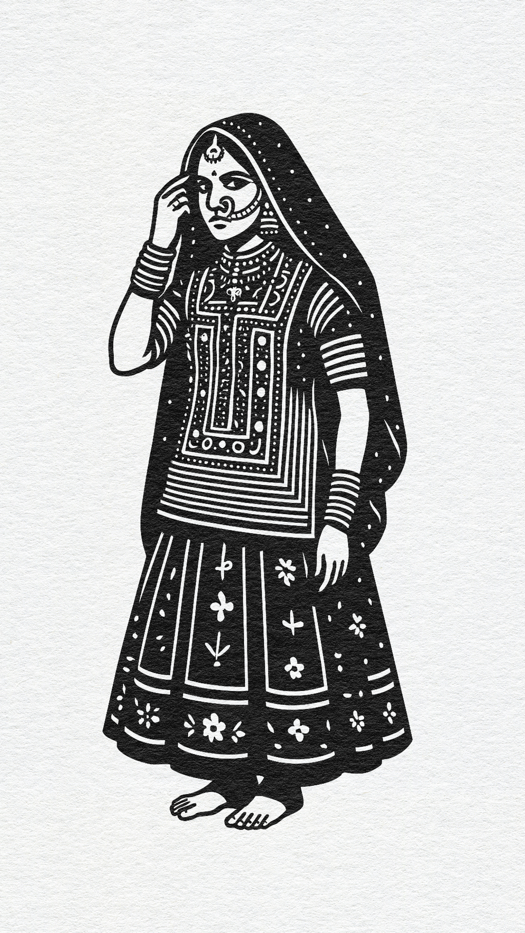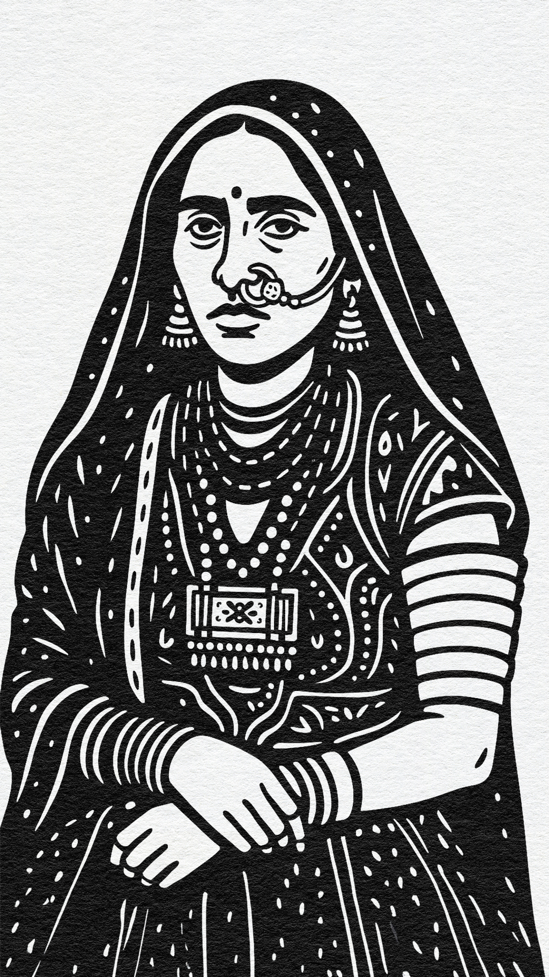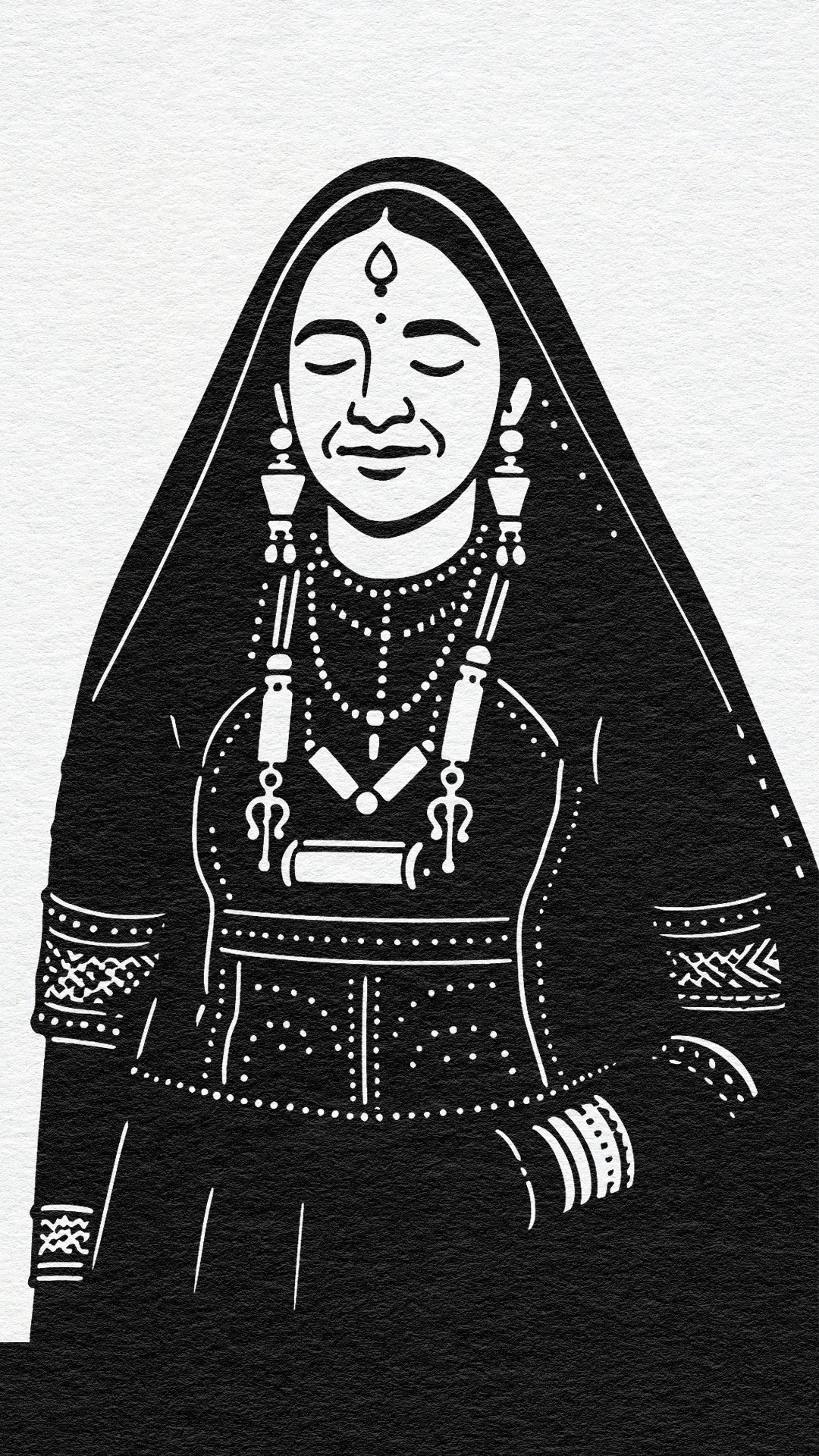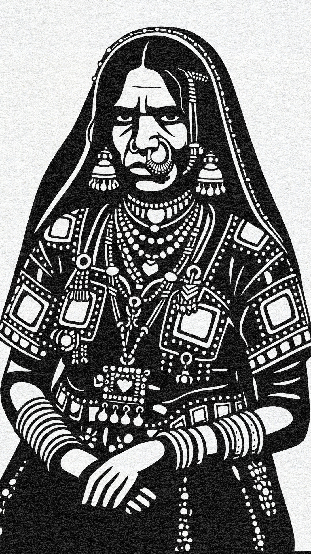 This evocative illustration series captures the timeless spirit of Kutch Rabari women through intricate black-and-white portraits. Each image celebrates traditional attire, cultural identity, and the enduring strength of heritage.