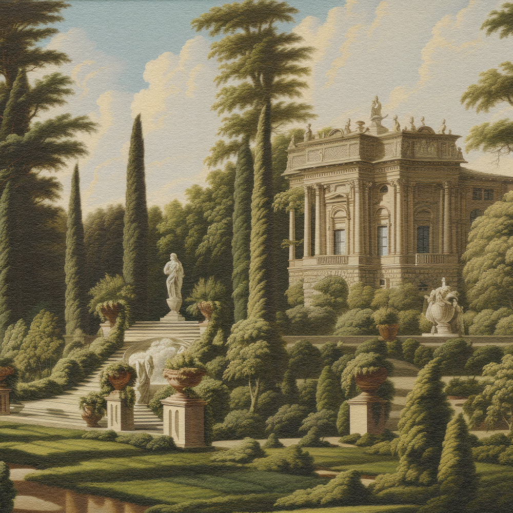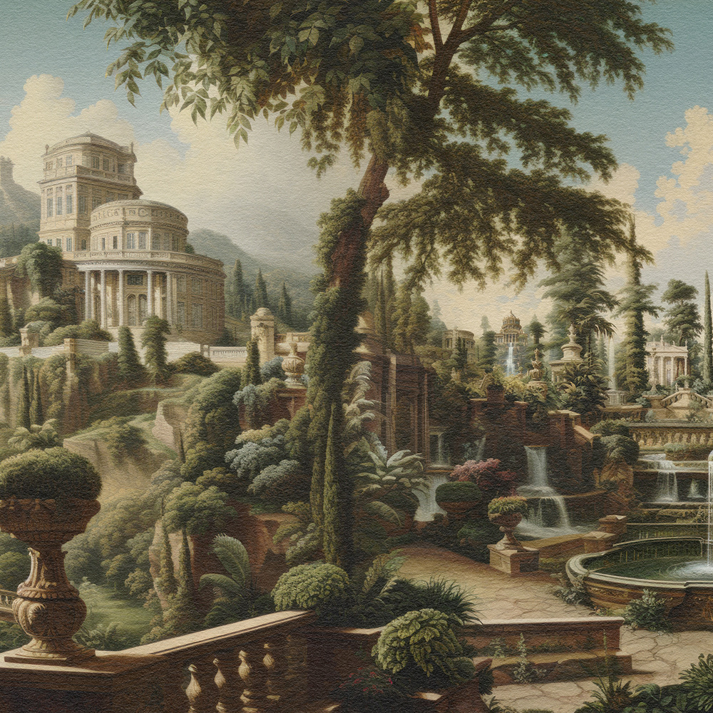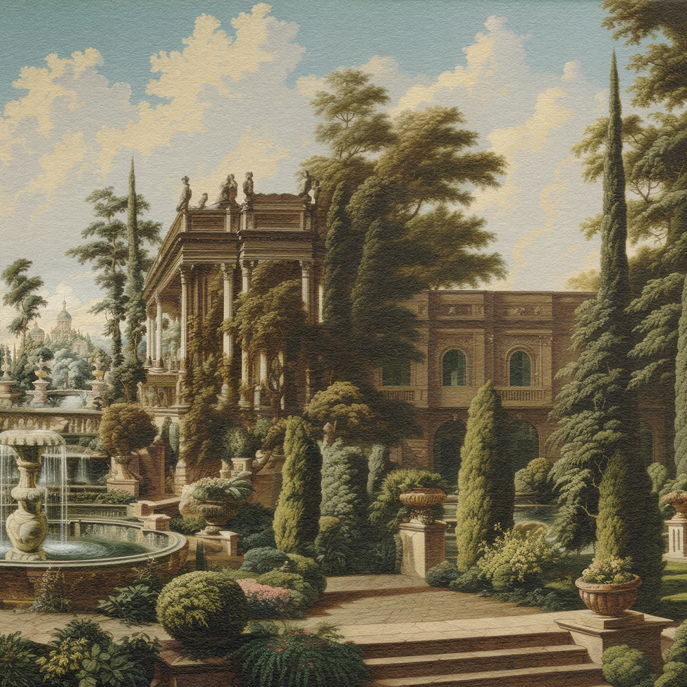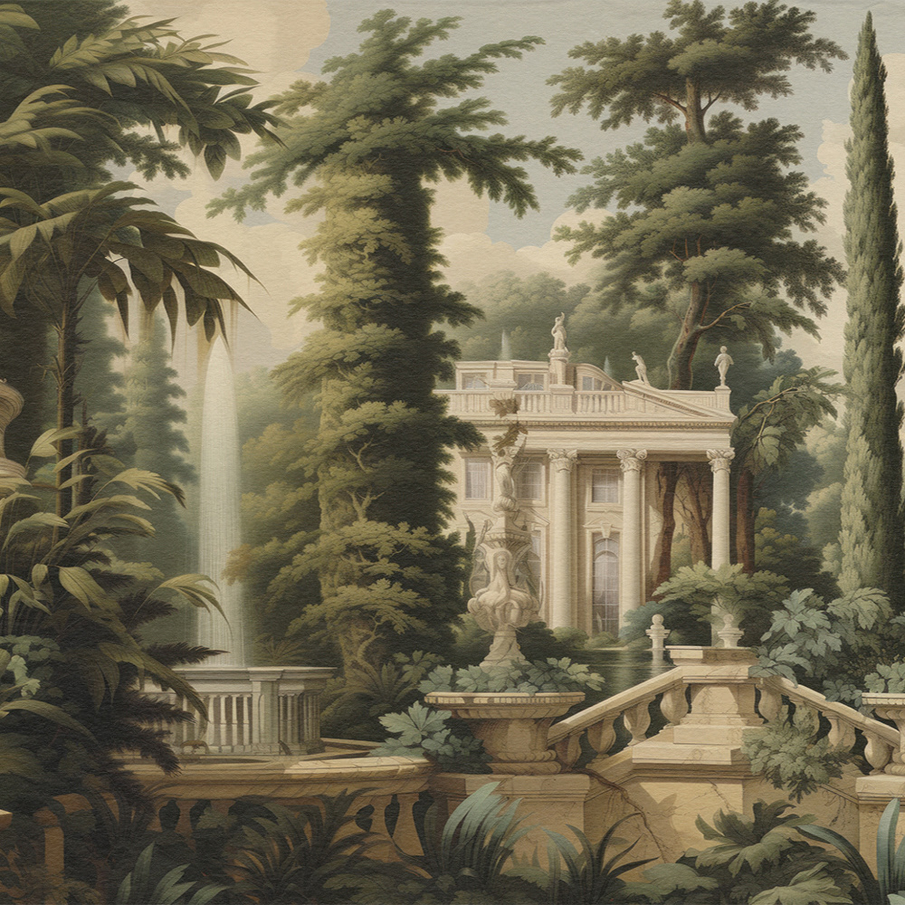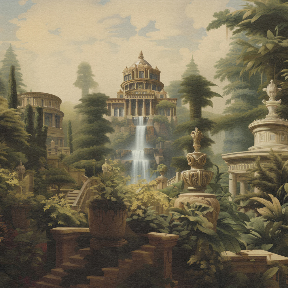 Enchanted Palatial Gardens unveils a lush, mystical palace garden with grand architecture and cascading waterfalls. The serene, verdant landscape evokes timeless beauty, blending classical charm with a dreamlike, Edenic allure.