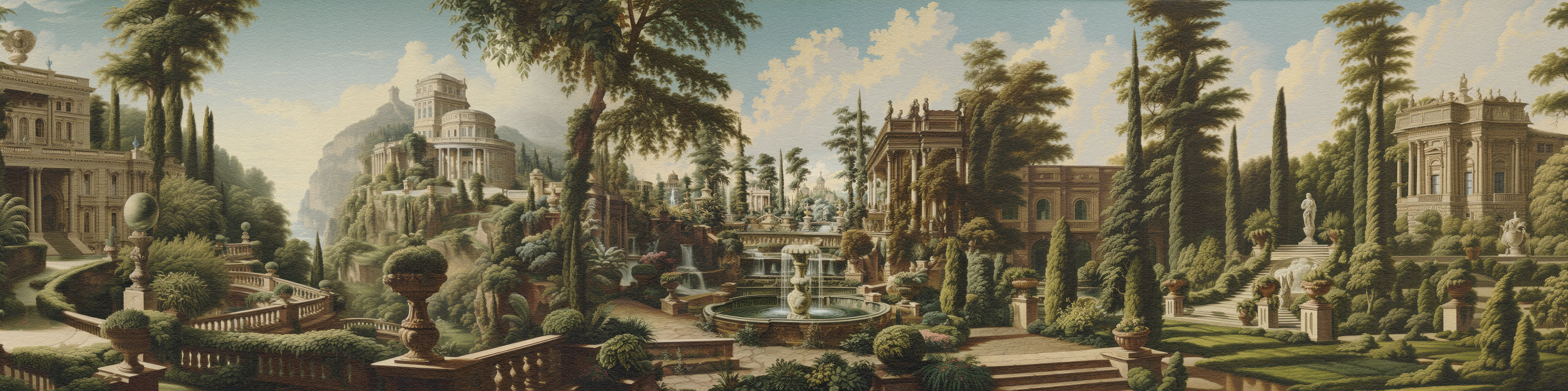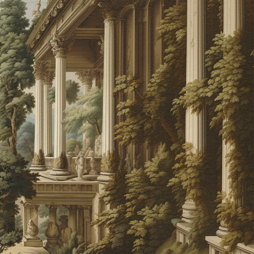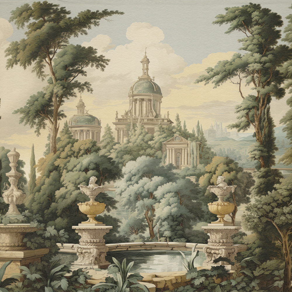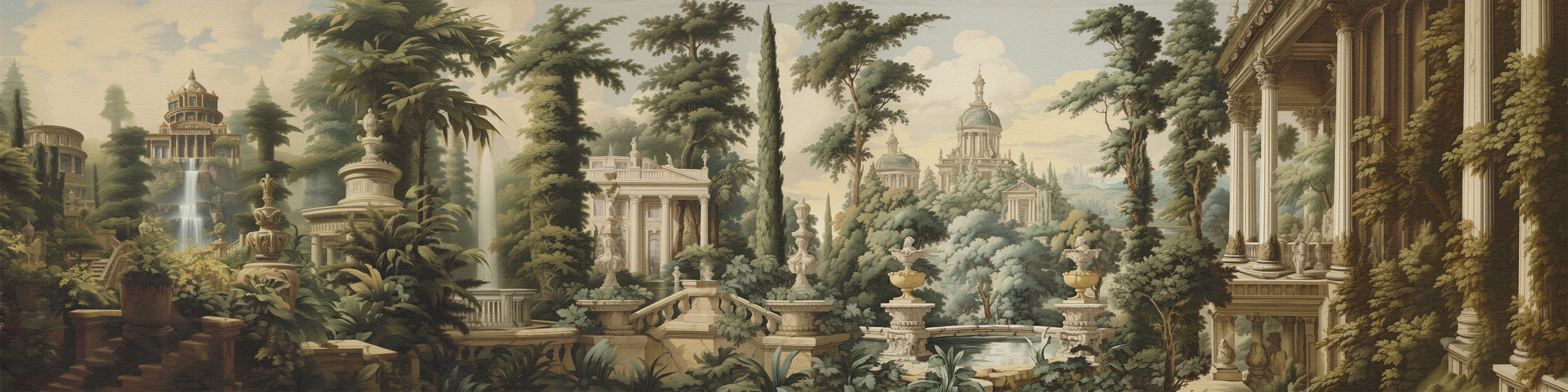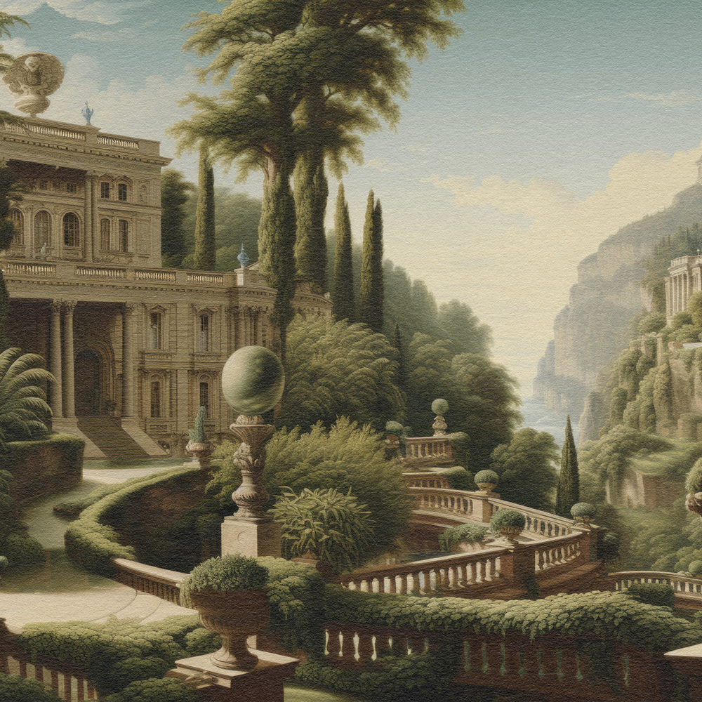 Enchanted Palatial Gardens unveils a lush, mystical palace garden with grand architecture and cascading waterfalls. The serene, verdant landscape evokes timeless beauty, blending classical charm with a dreamlike, Edenic allure.