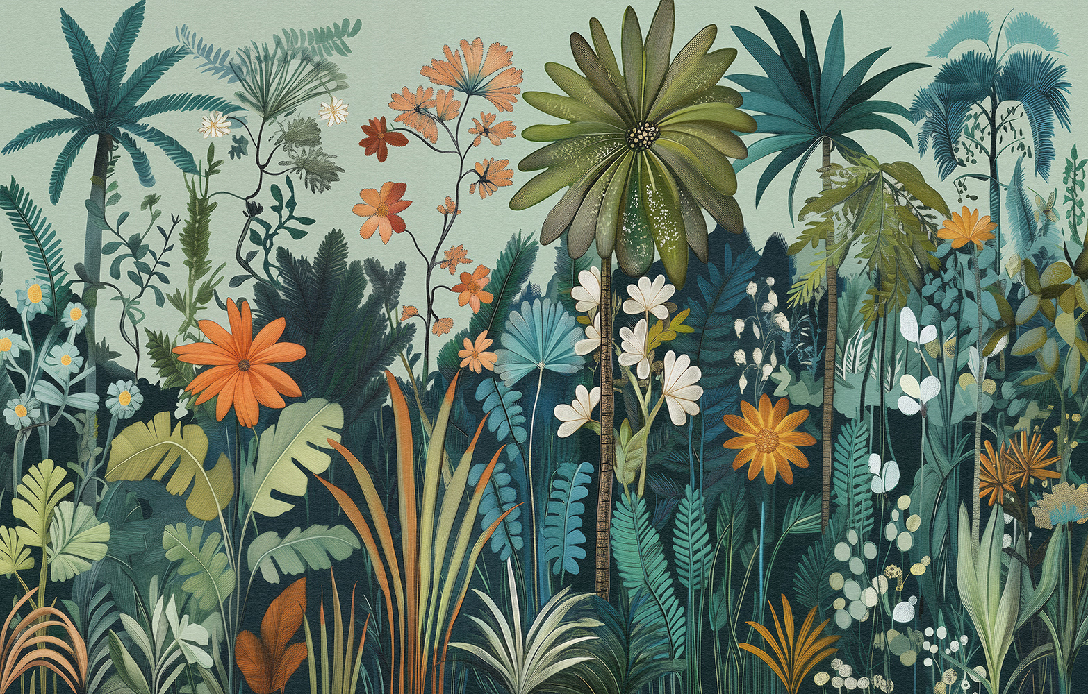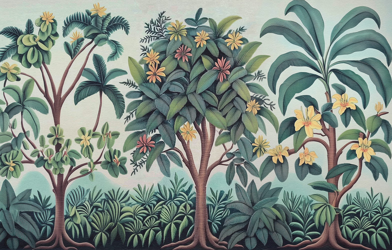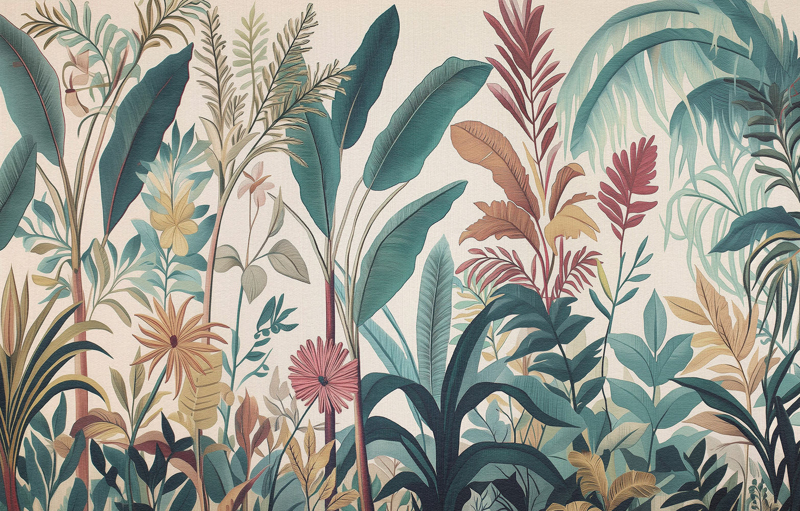 This vibrant mural series immerses viewers in serene tropical greenery, showcasing diverse foliage, intricate botanical patterns, and calming shades of nature, perfect for transforming interiors into tranquil forest retreats.