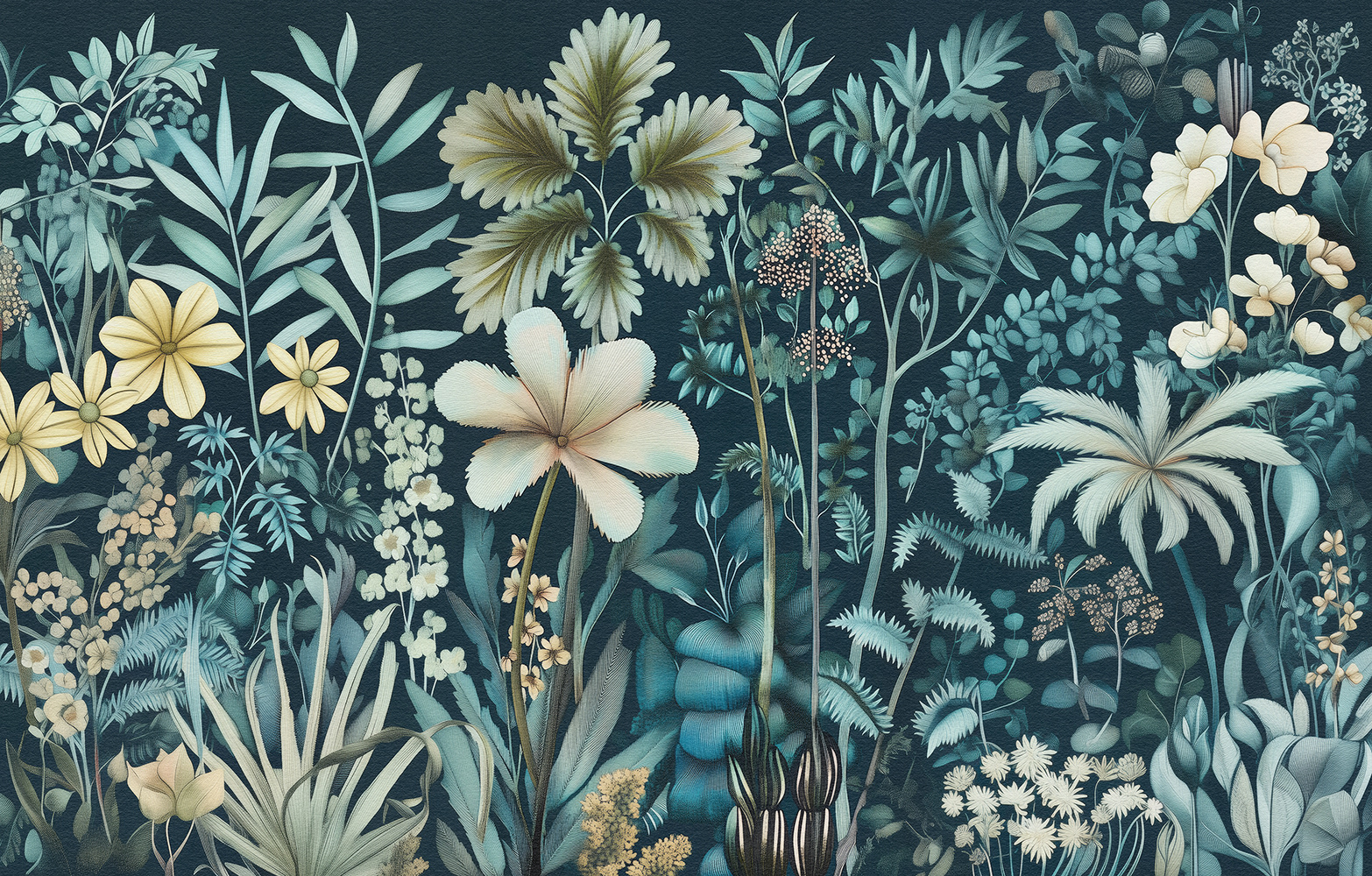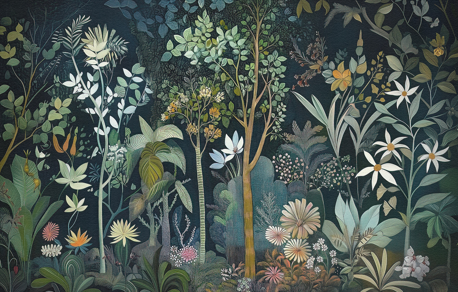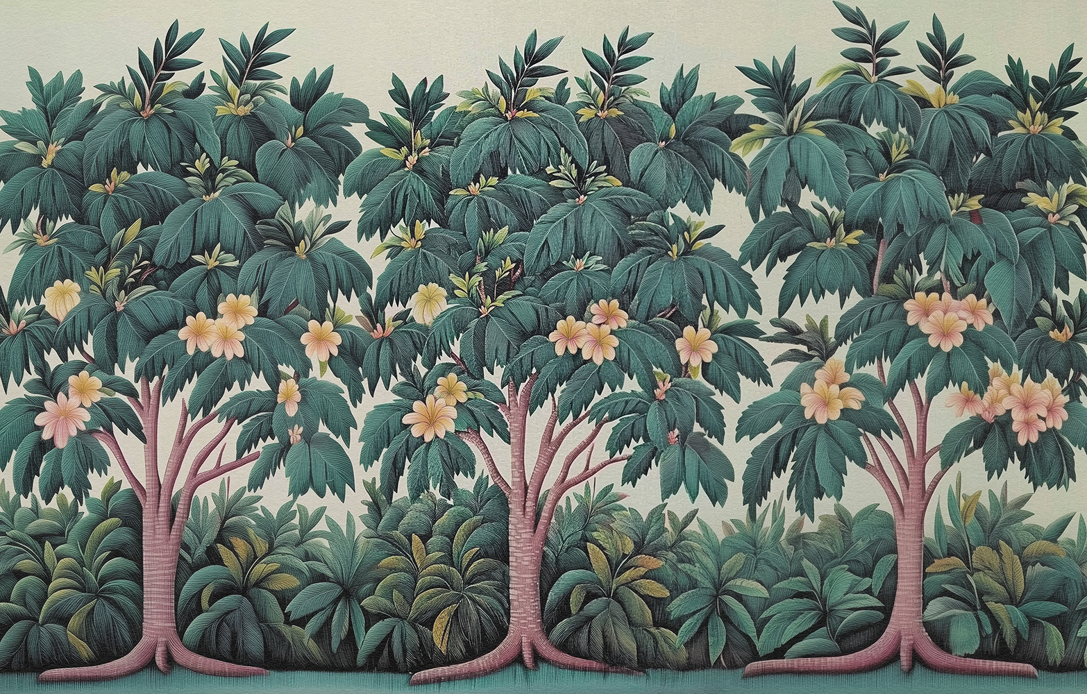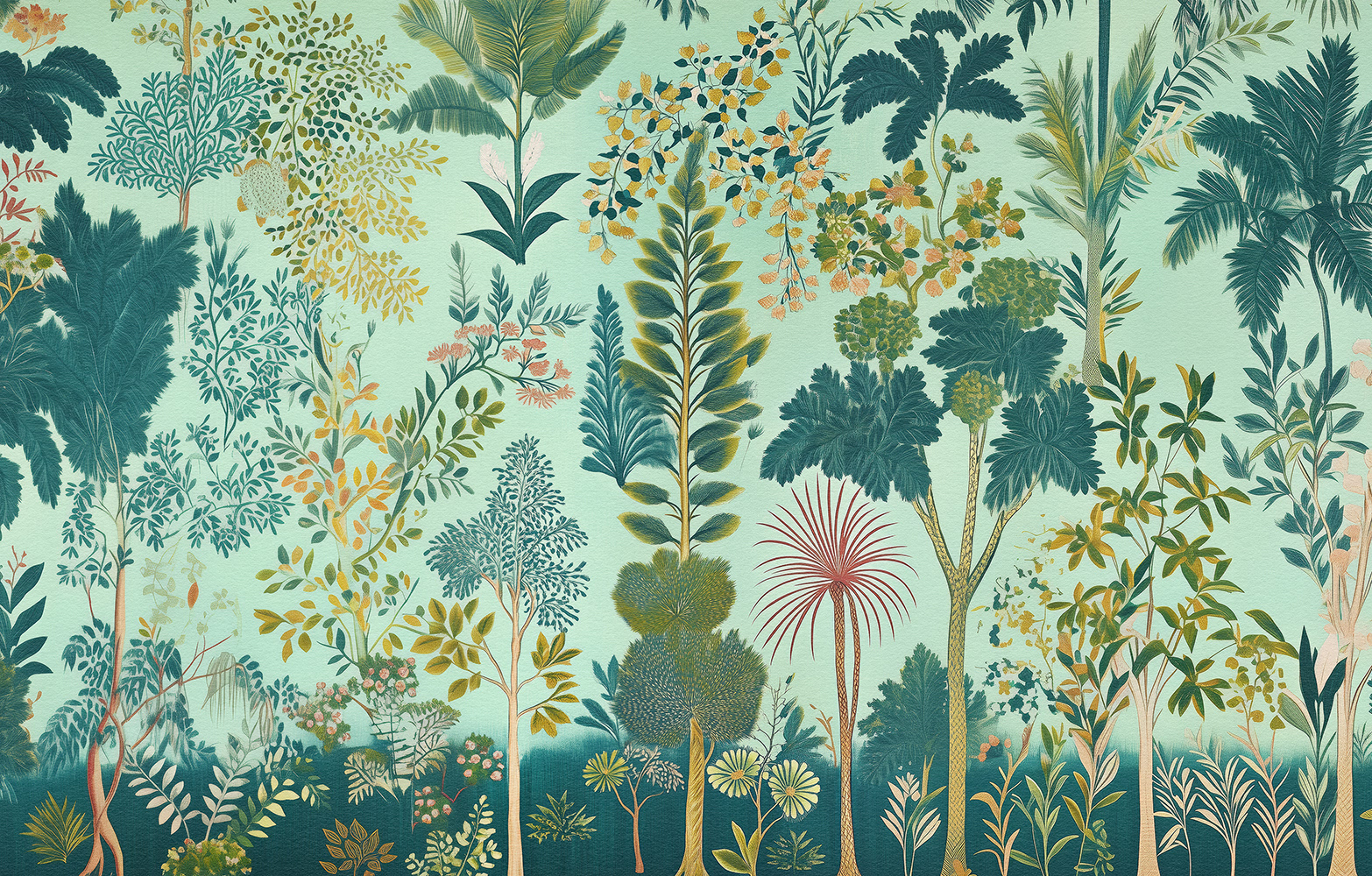 This vibrant mural series immerses viewers in serene tropical greenery, showcasing diverse foliage, intricate botanical patterns, and calming shades of nature, perfect for transforming interiors into tranquil forest retreats.