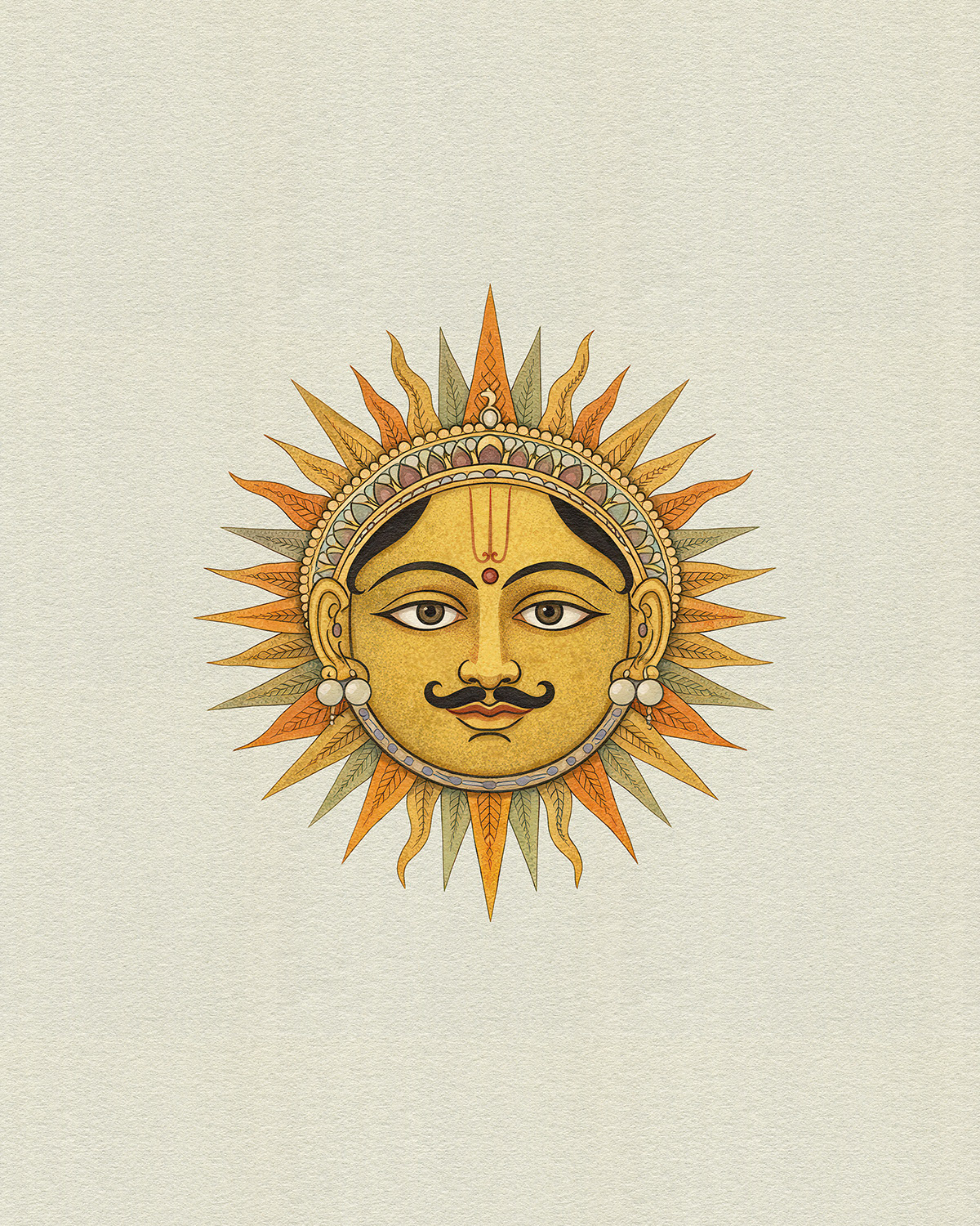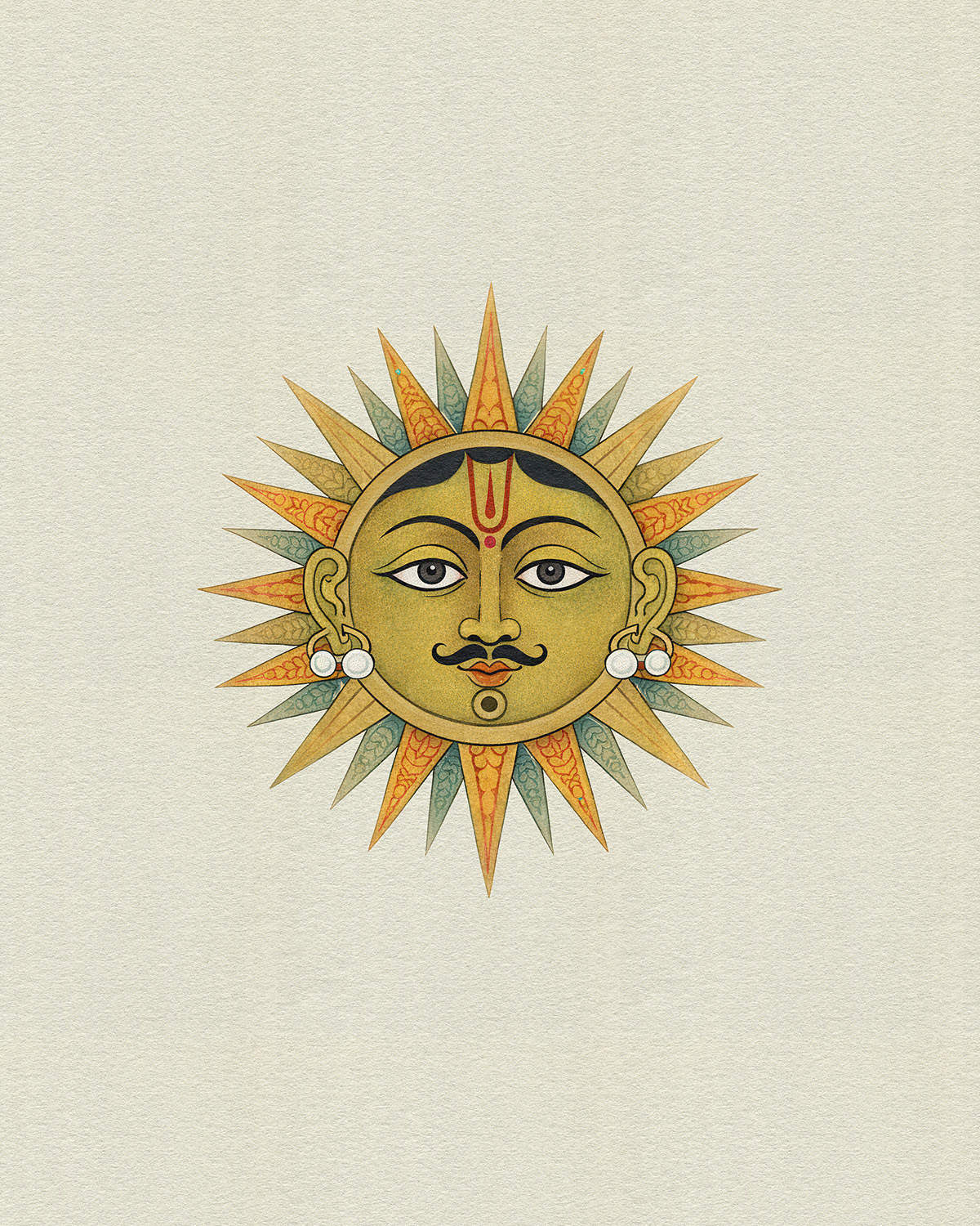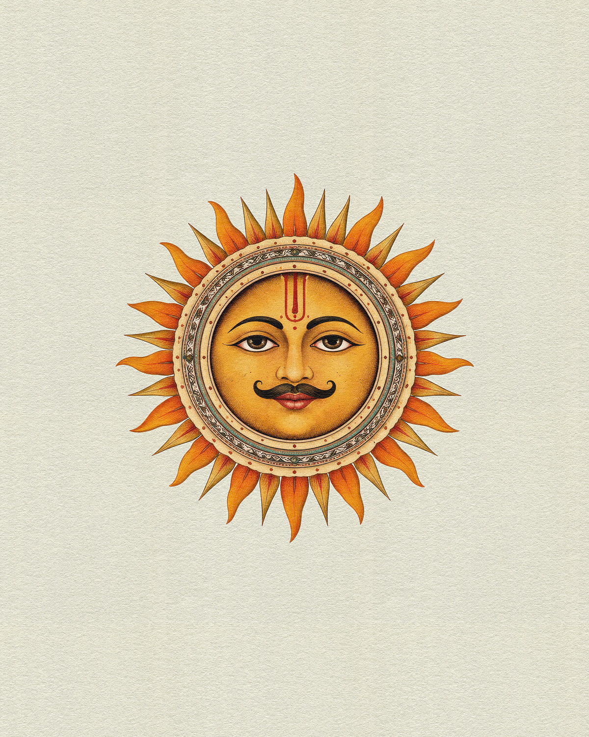 This art series reinterprets Surya Dev through miniature-inspired Indian folk iconography, blending ornamental precision, sacred symmetry, and mythological symbolism into radiant, timeless sun icons rooted in devotional tradition.