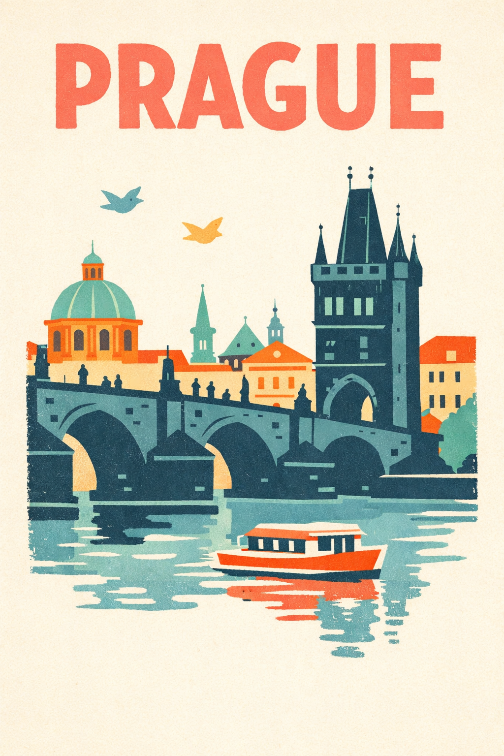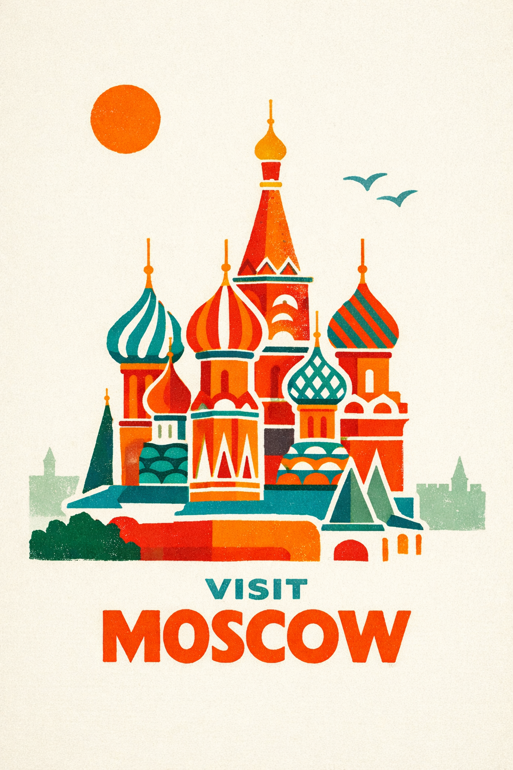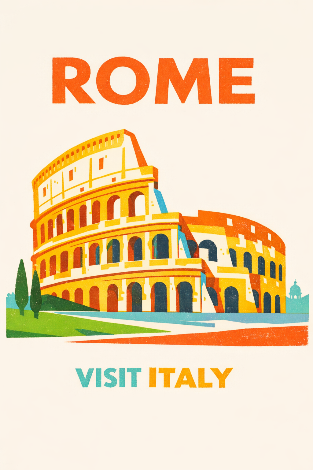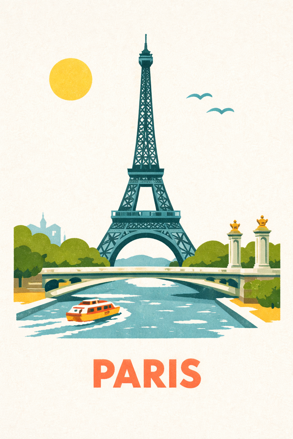 A vibrant collection of mid-century inspired travel posters reinterpreting iconic global landmarks through bold geometric forms, flat colors, and nostalgic composition, blending retro tourism aesthetics with contemporary graphic clarity.