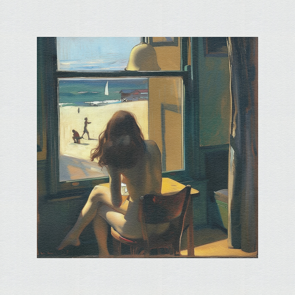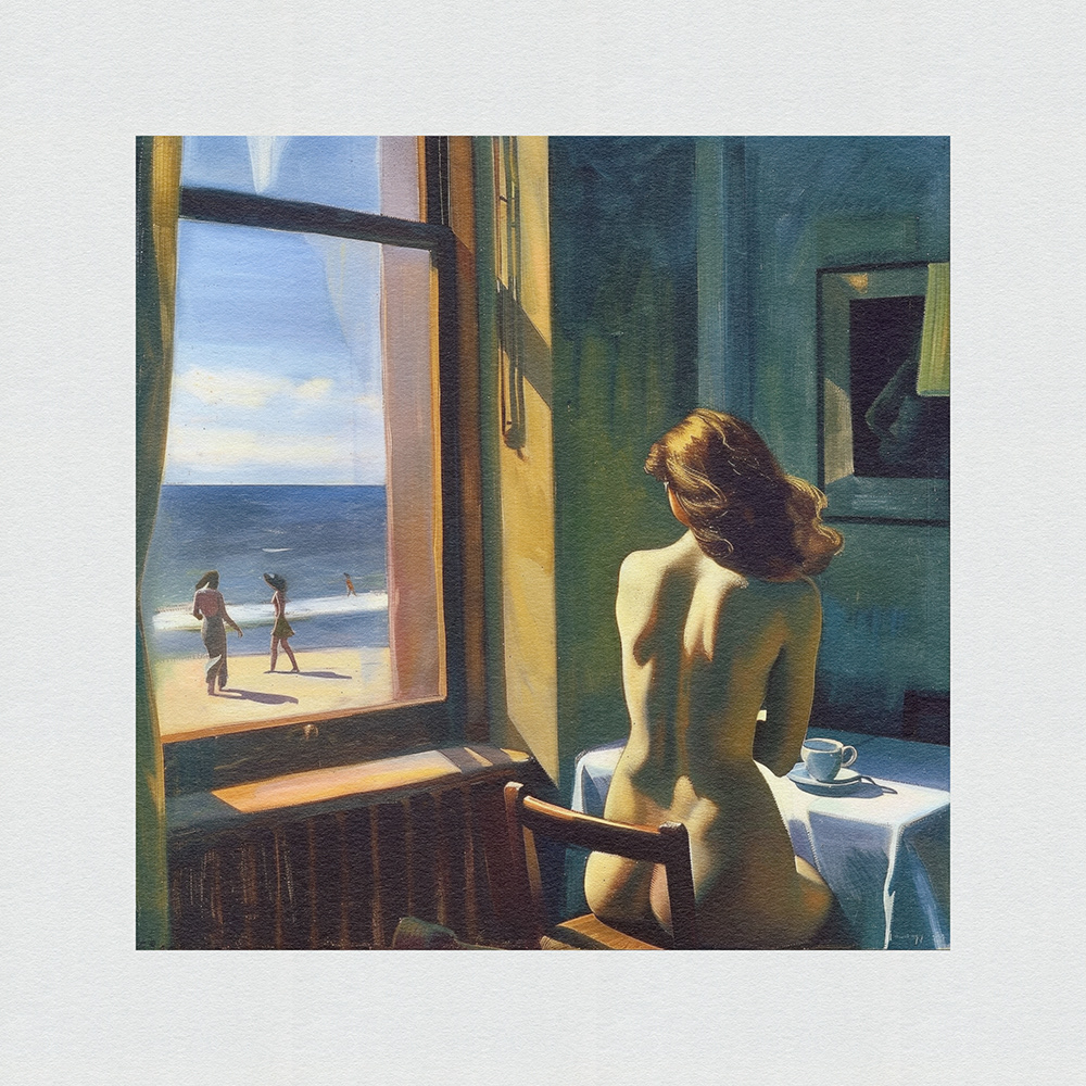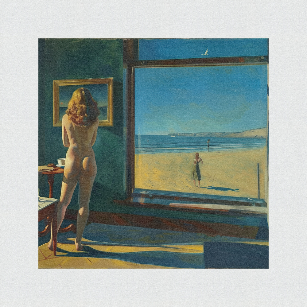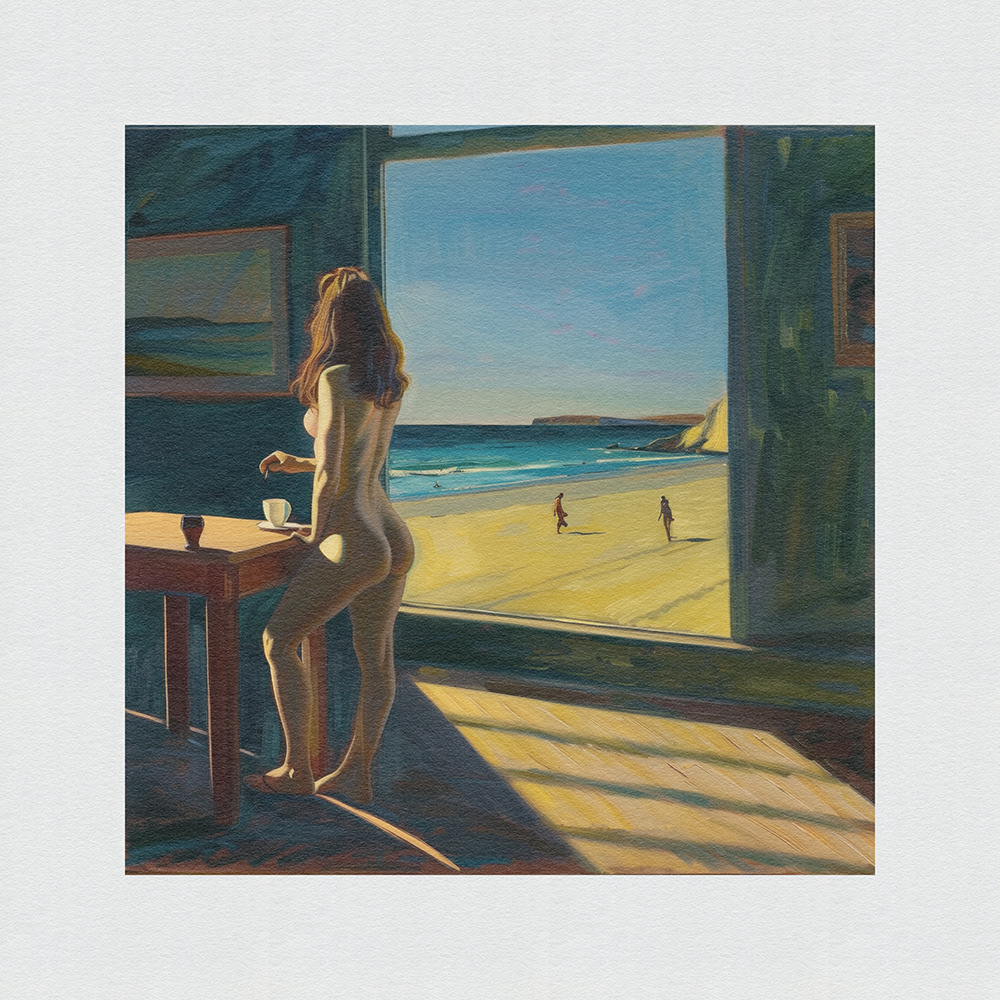 This series captures solitary moments of contemplation, featuring nude figures gazing out at serene beachscapes from the interiors of cozy, sunlit rooms, blending intimacy with the vastness of nature.