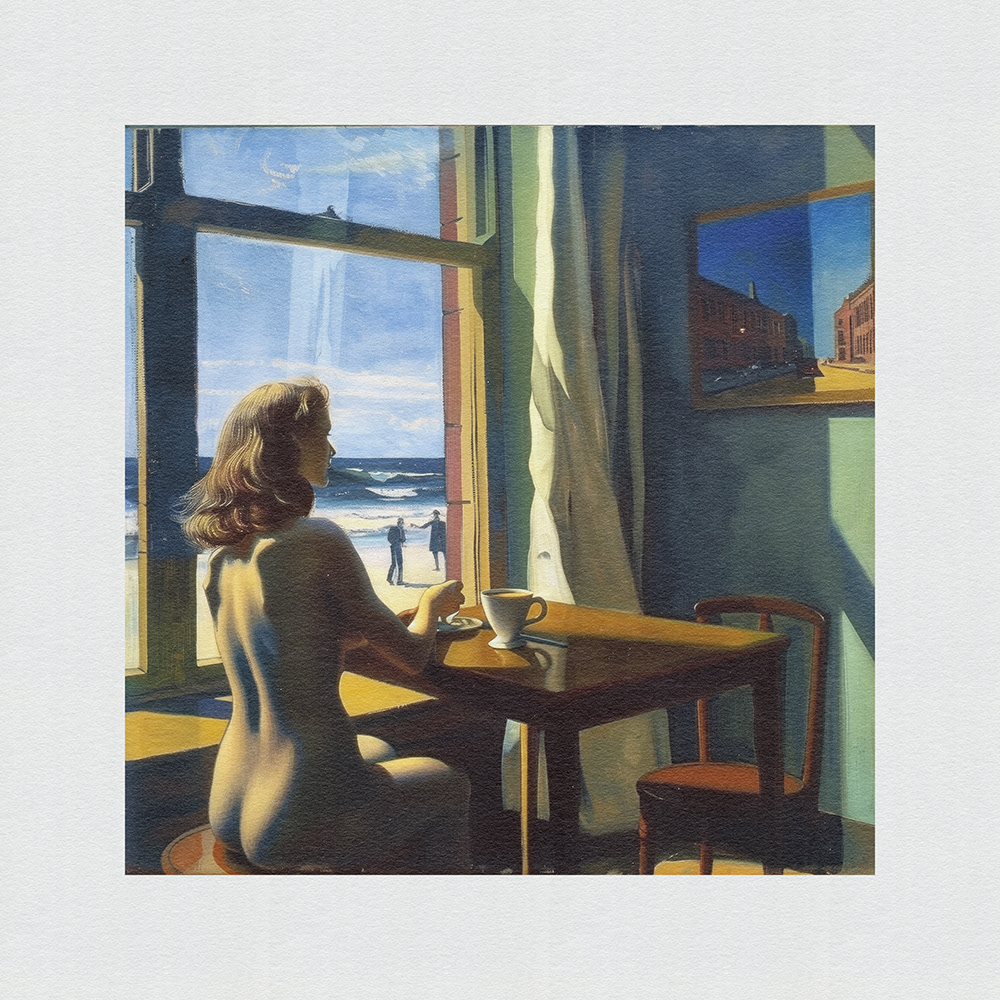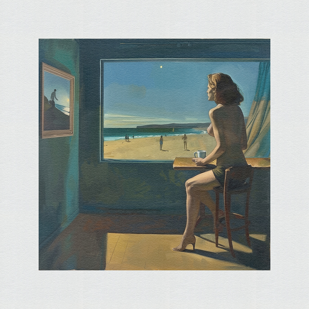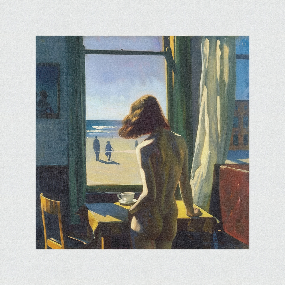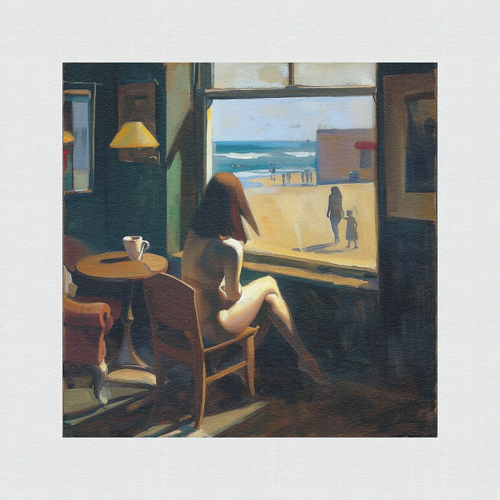 This series captures solitary moments of contemplation, featuring nude figures gazing out at serene beachscapes from the interiors of cozy, sunlit rooms, blending intimacy with the vastness of nature.
