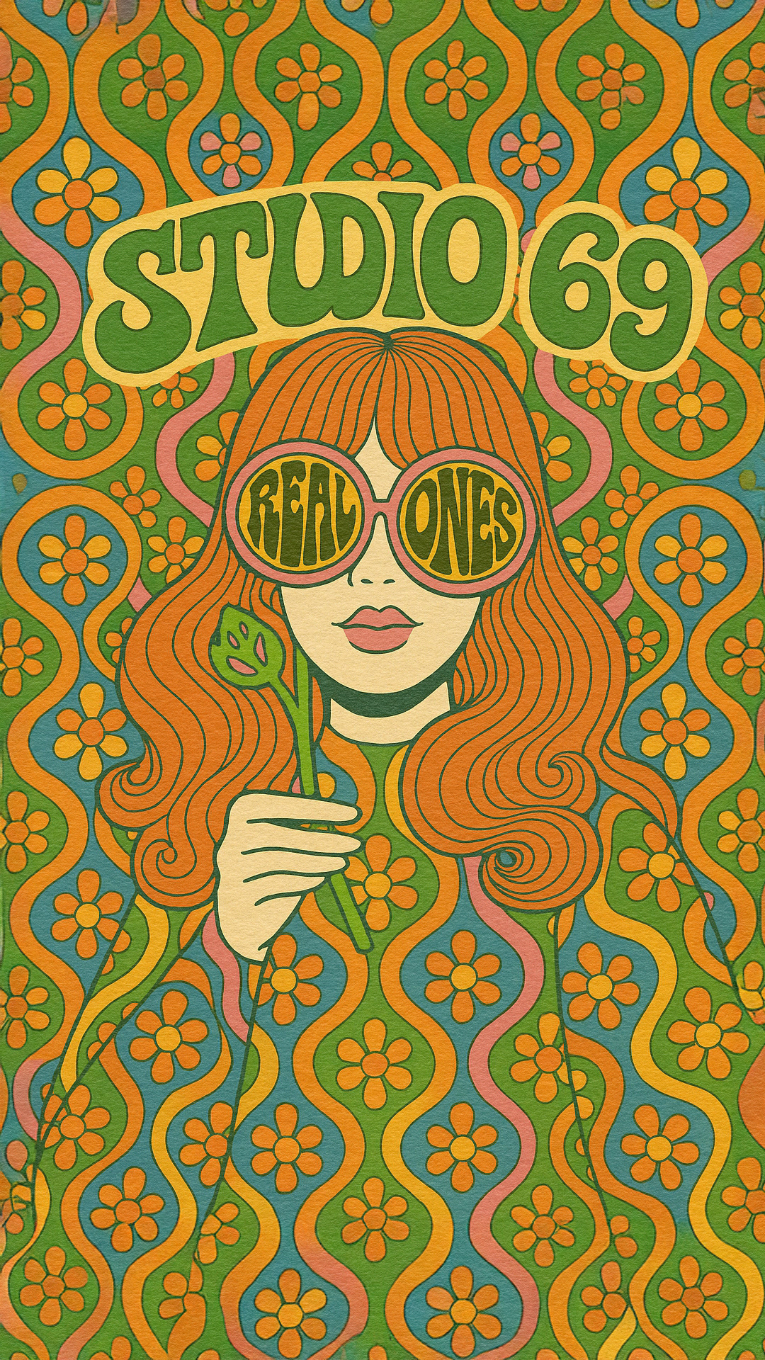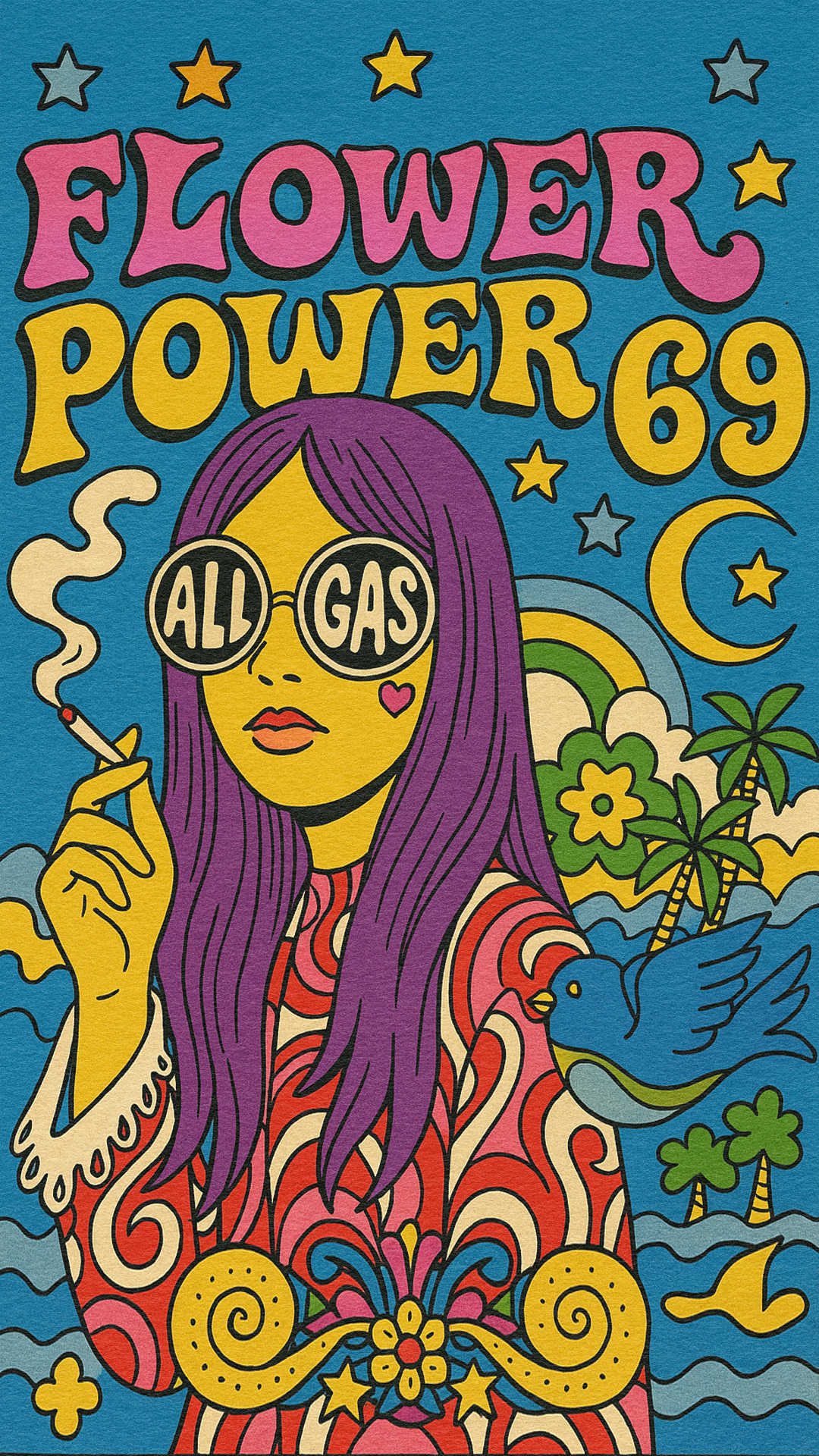 This striking art series reimagines the psychedelic poster culture of 1969 with bold colors, flowing typography, and surreal portraits. A dynamic blend of retro pop art, flower power, and counterculture nostalgia, perfect for collectors and design enthusiasts.