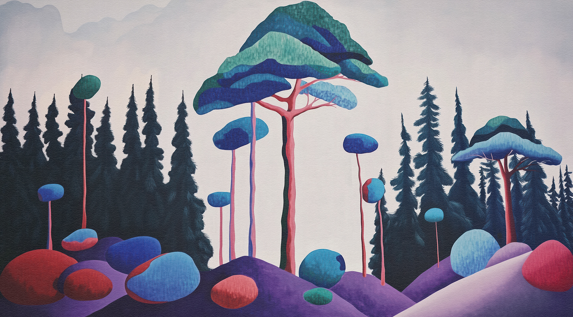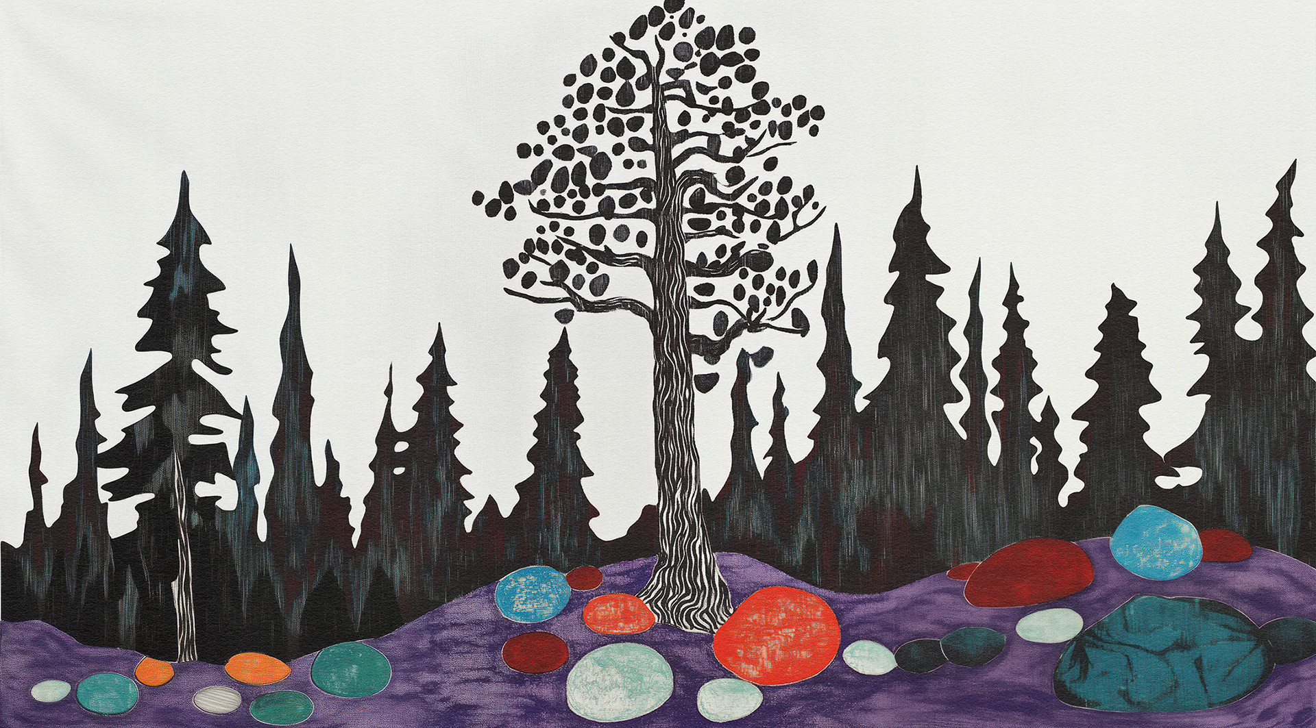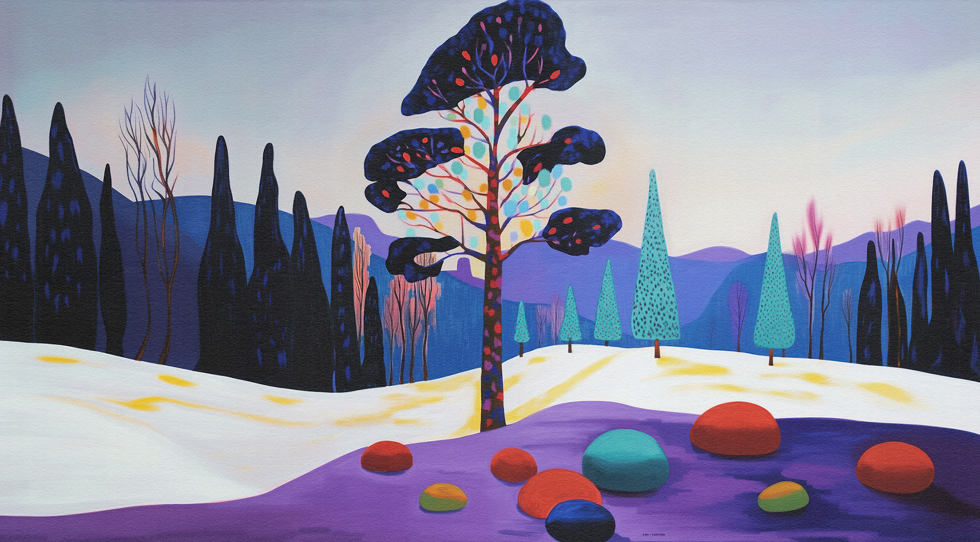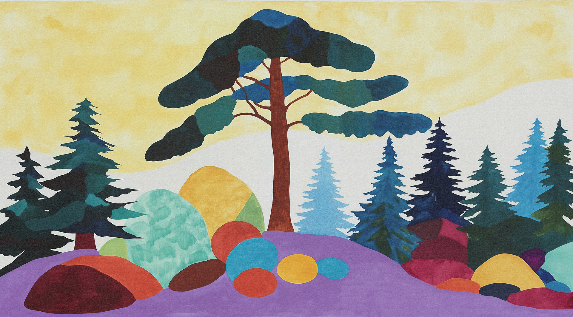 Roots, Rocks, and Radiance" is a vibrant forest art series blending surreal trees and colorful stones. Each piece celebrates nature’s quiet strength through bold forms, mystical palettes, and abstract harmony.
