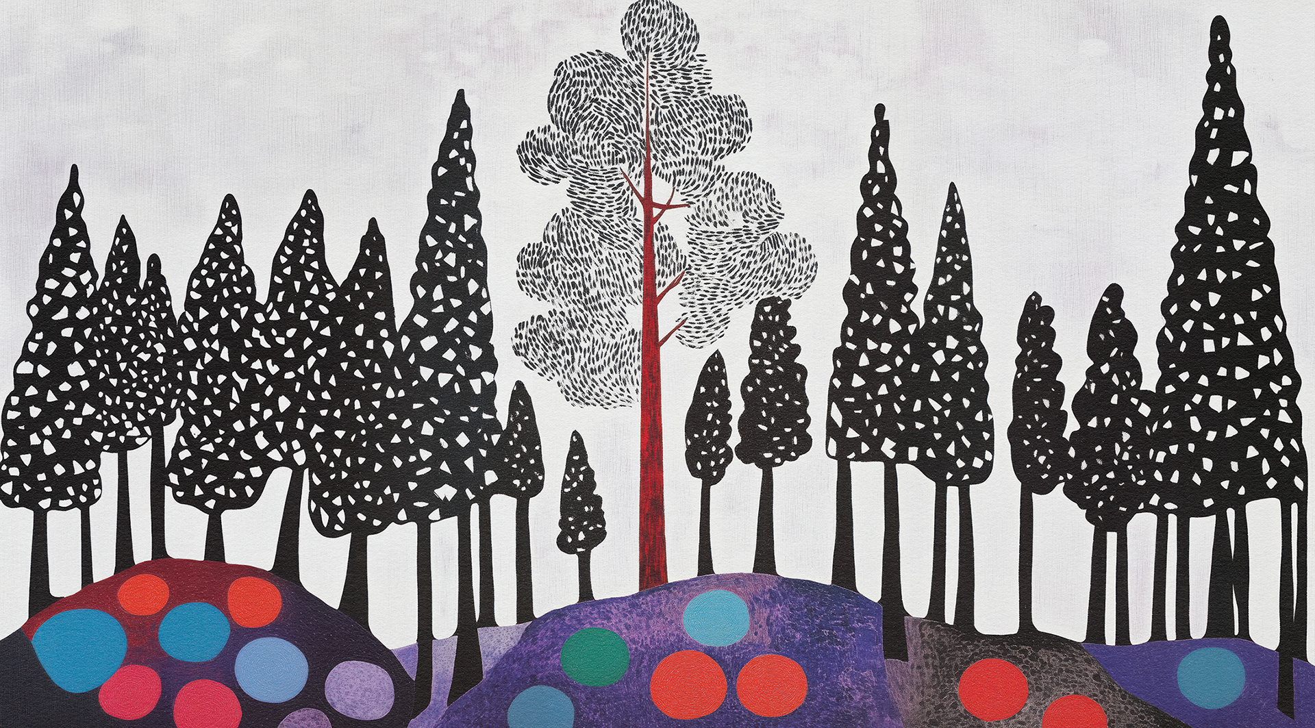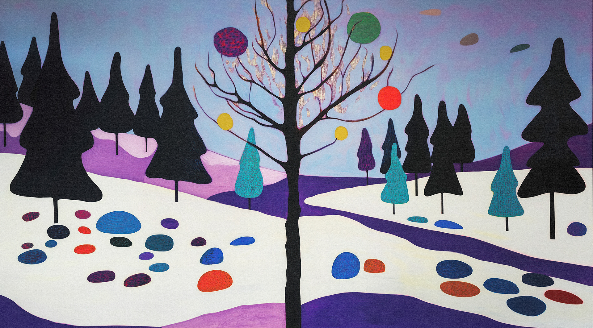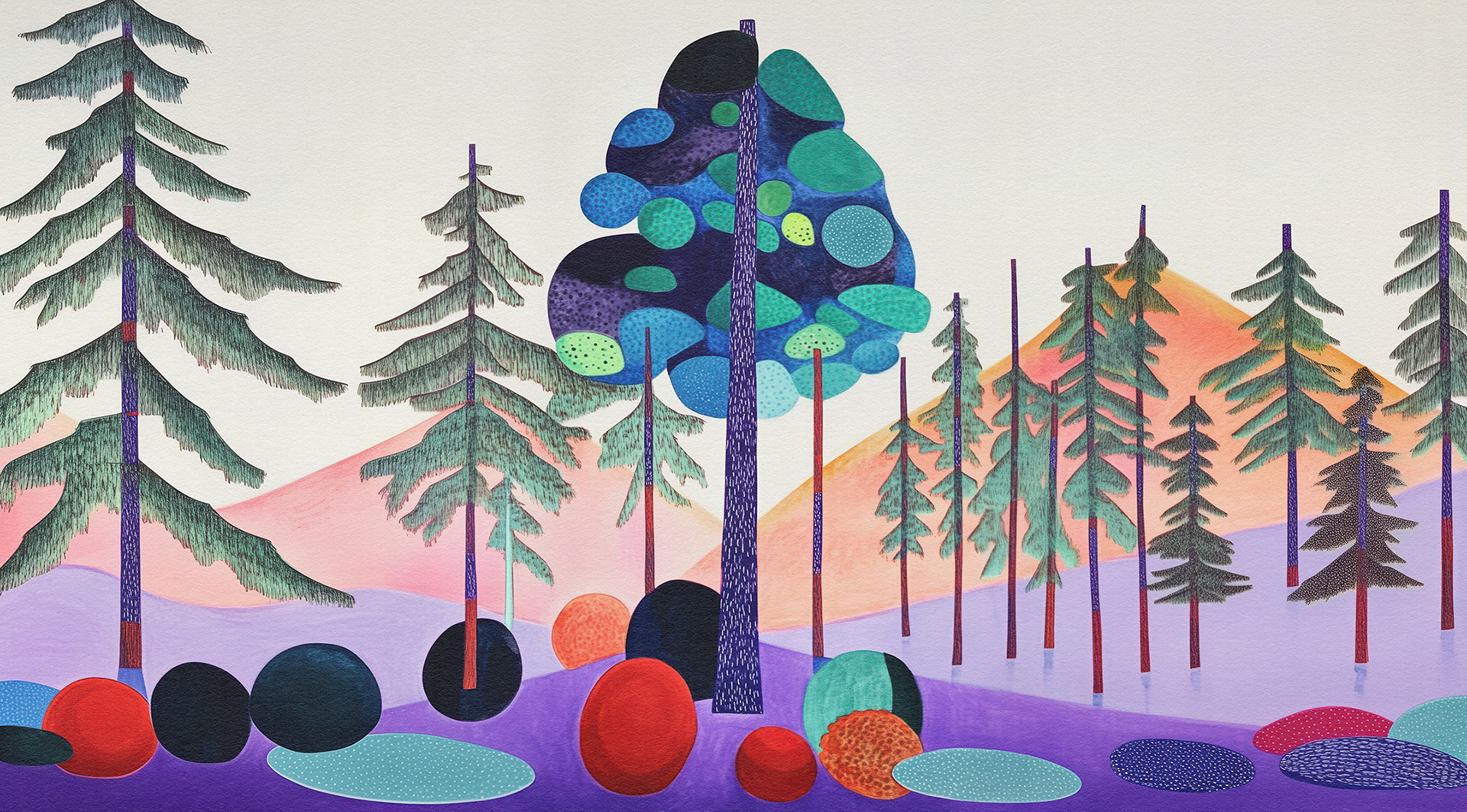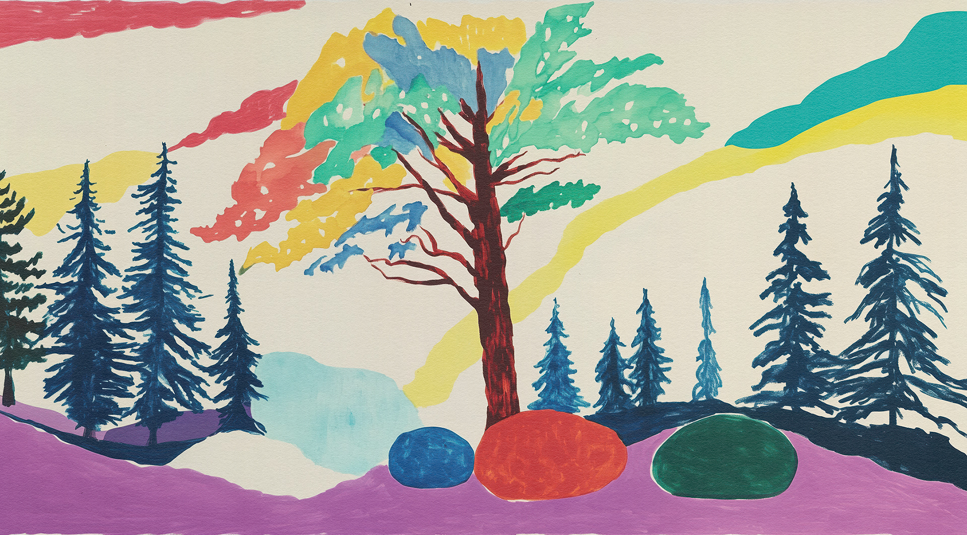 Roots, Rocks, and Radiance" is a vibrant forest art series blending surreal trees and colorful stones. Each piece celebrates nature’s quiet strength through bold forms, mystical palettes, and abstract harmony.