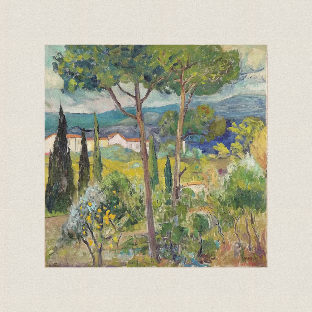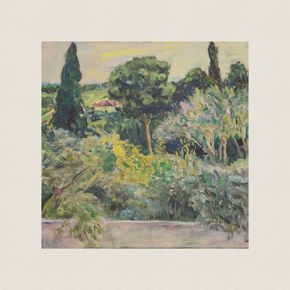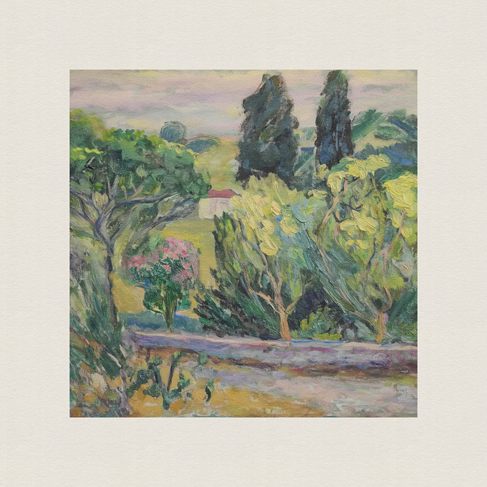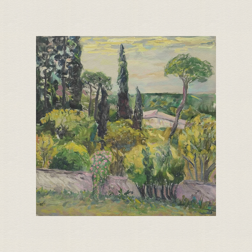An enchanting series of paintings depicting lush, vibrant landscapes with tall trees and serene cottages, blending the tranquility of nature with the charm of rural life