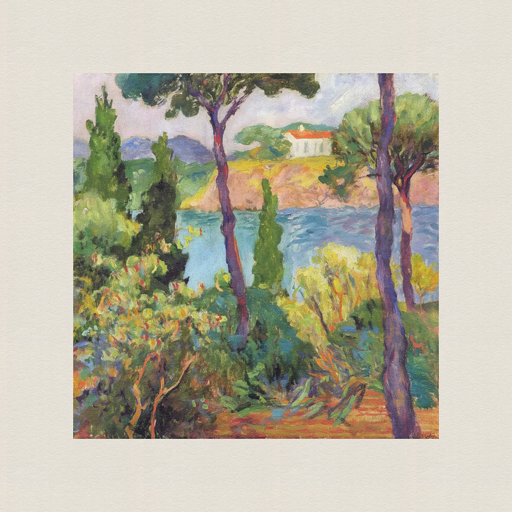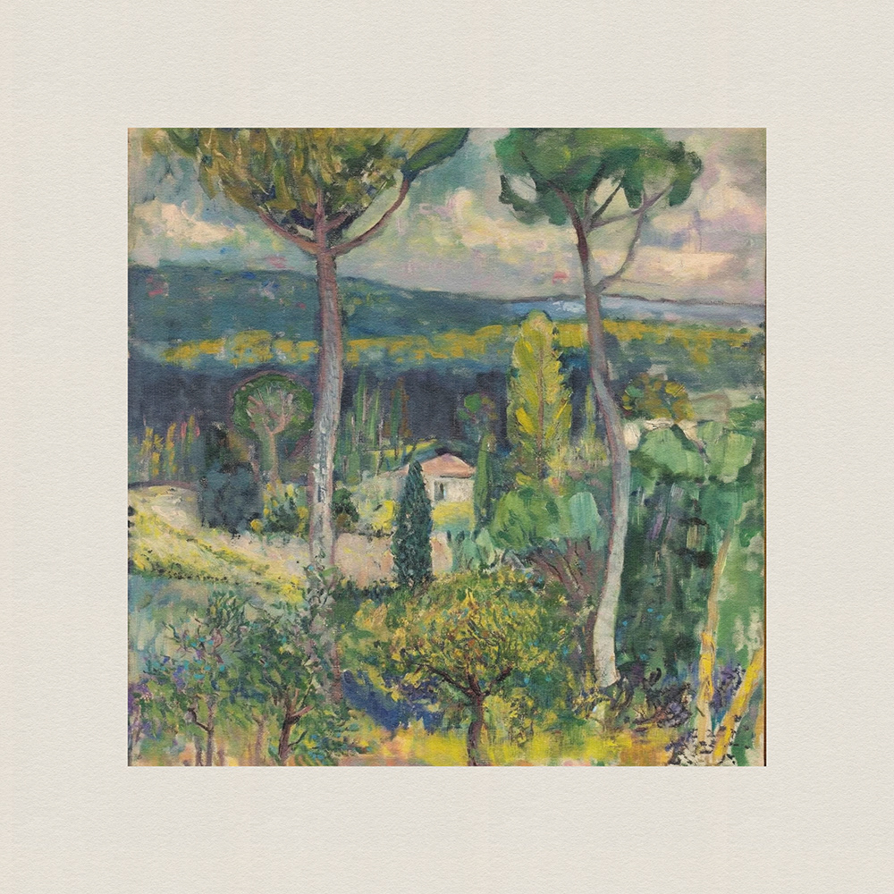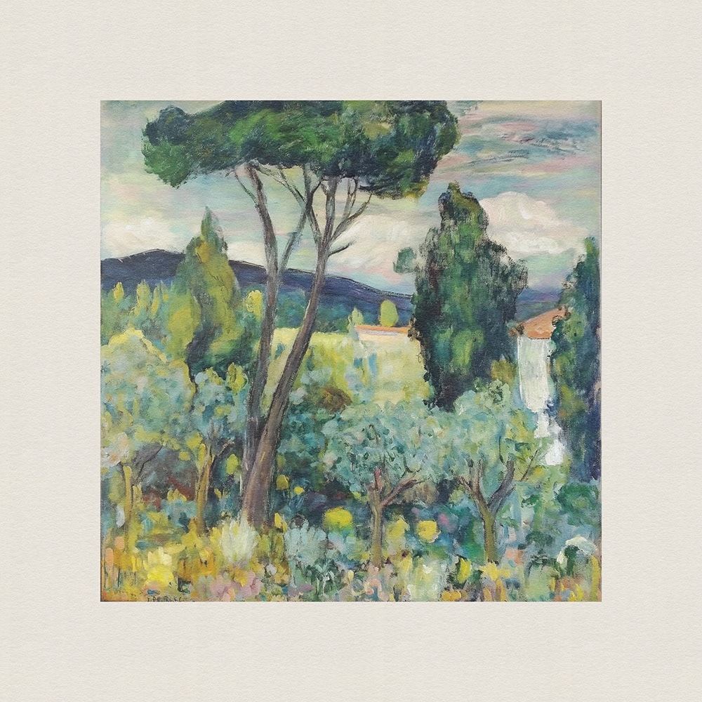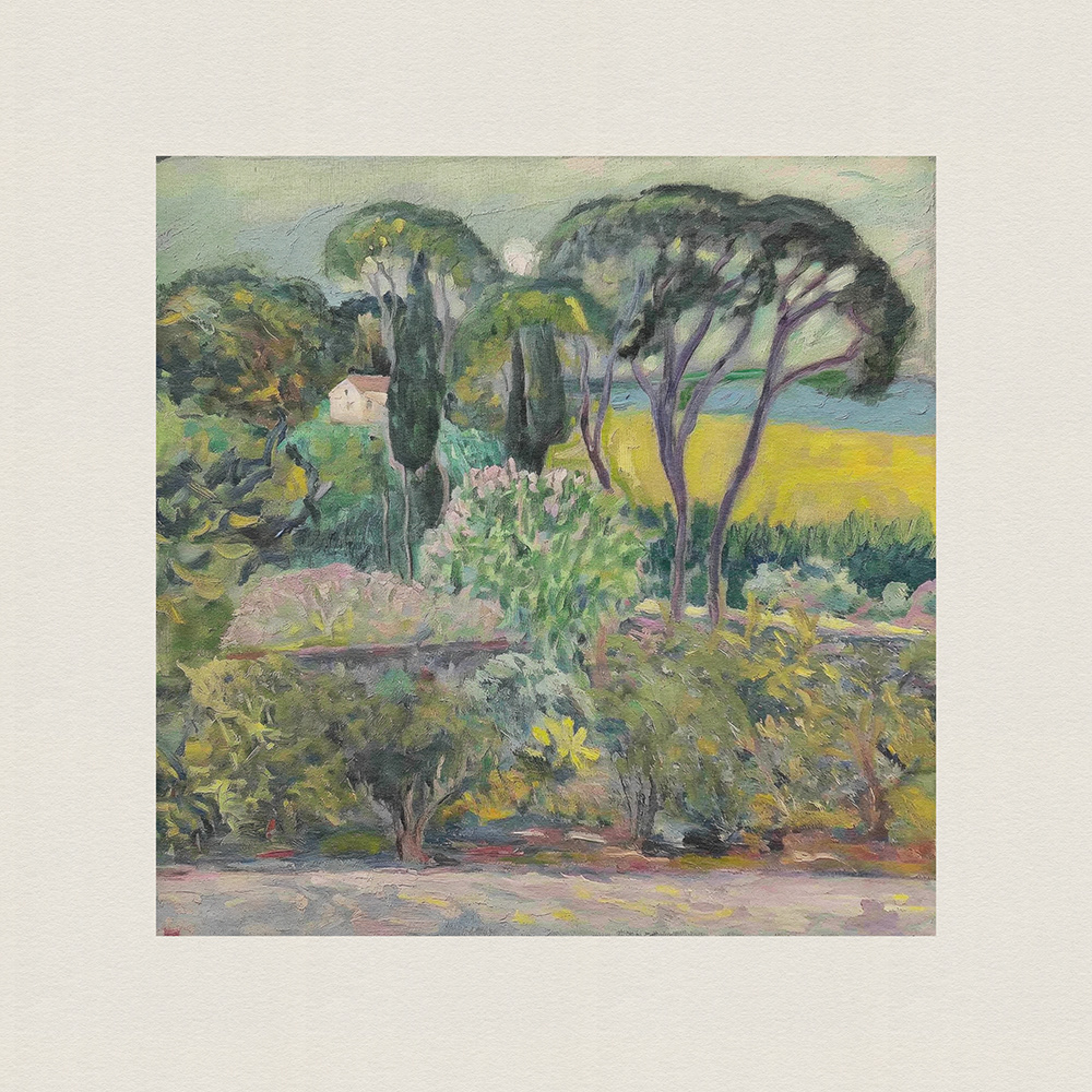 An enchanting series of paintings depicting lush, vibrant landscapes with tall trees and serene cottages, blending the tranquility of nature with the charm of rural life