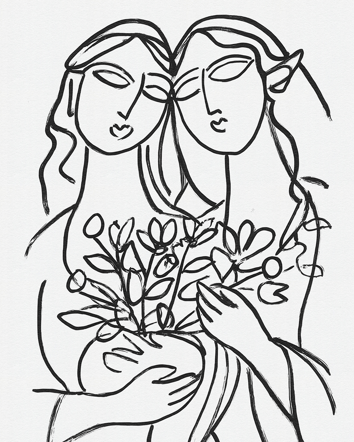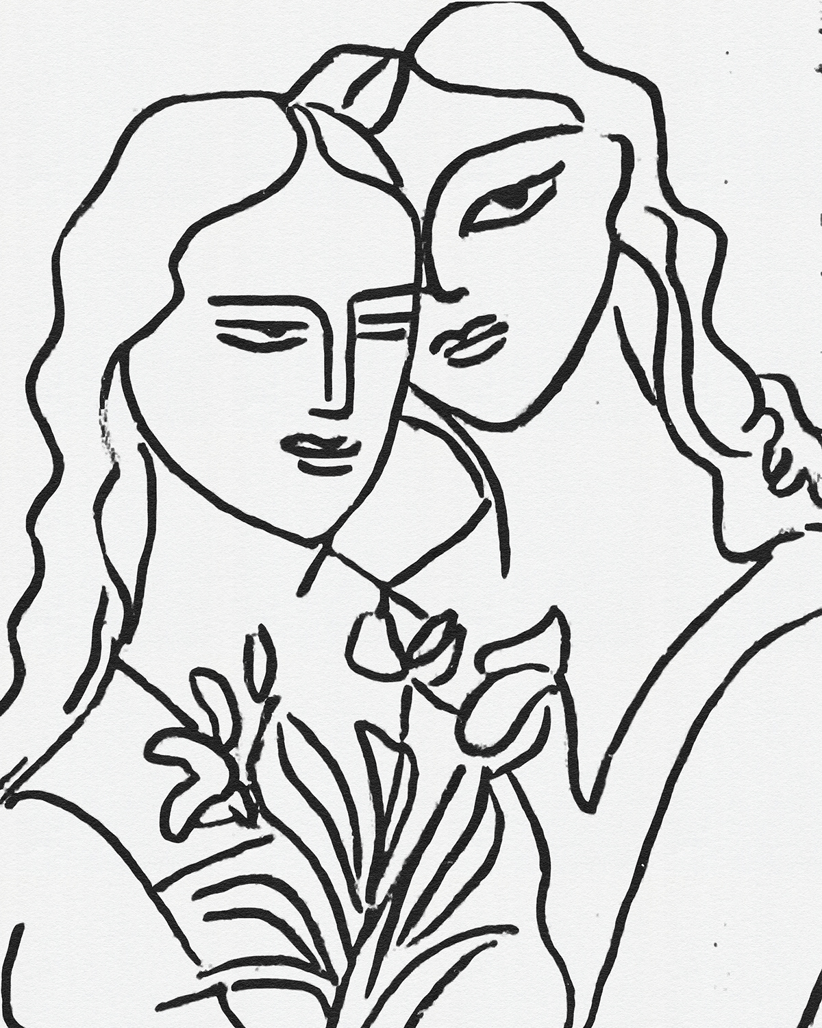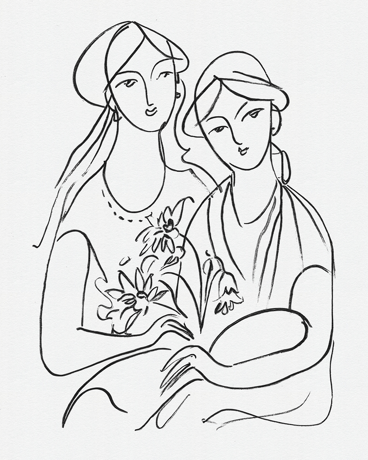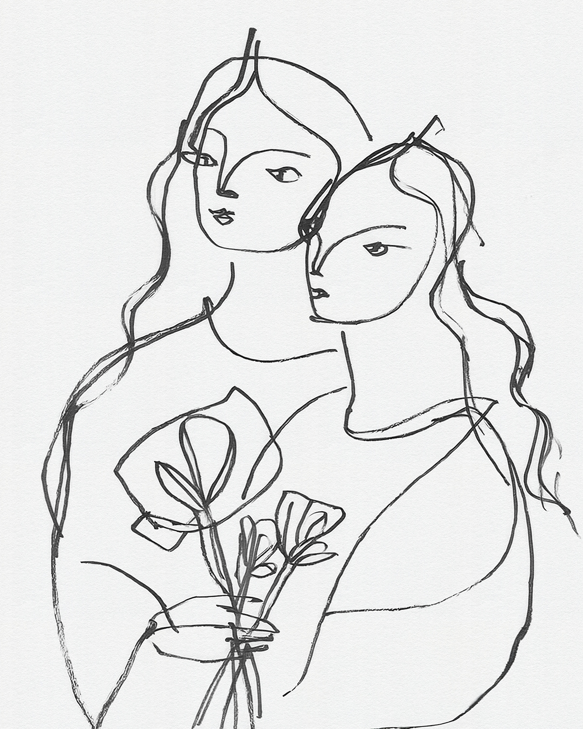 A lyrical series of intimate line drawings portraying women in quiet companionship, where flowing contour lines and floral gestures evoke tenderness, sisterhood, and modern femininity through minimal expressive mark making.