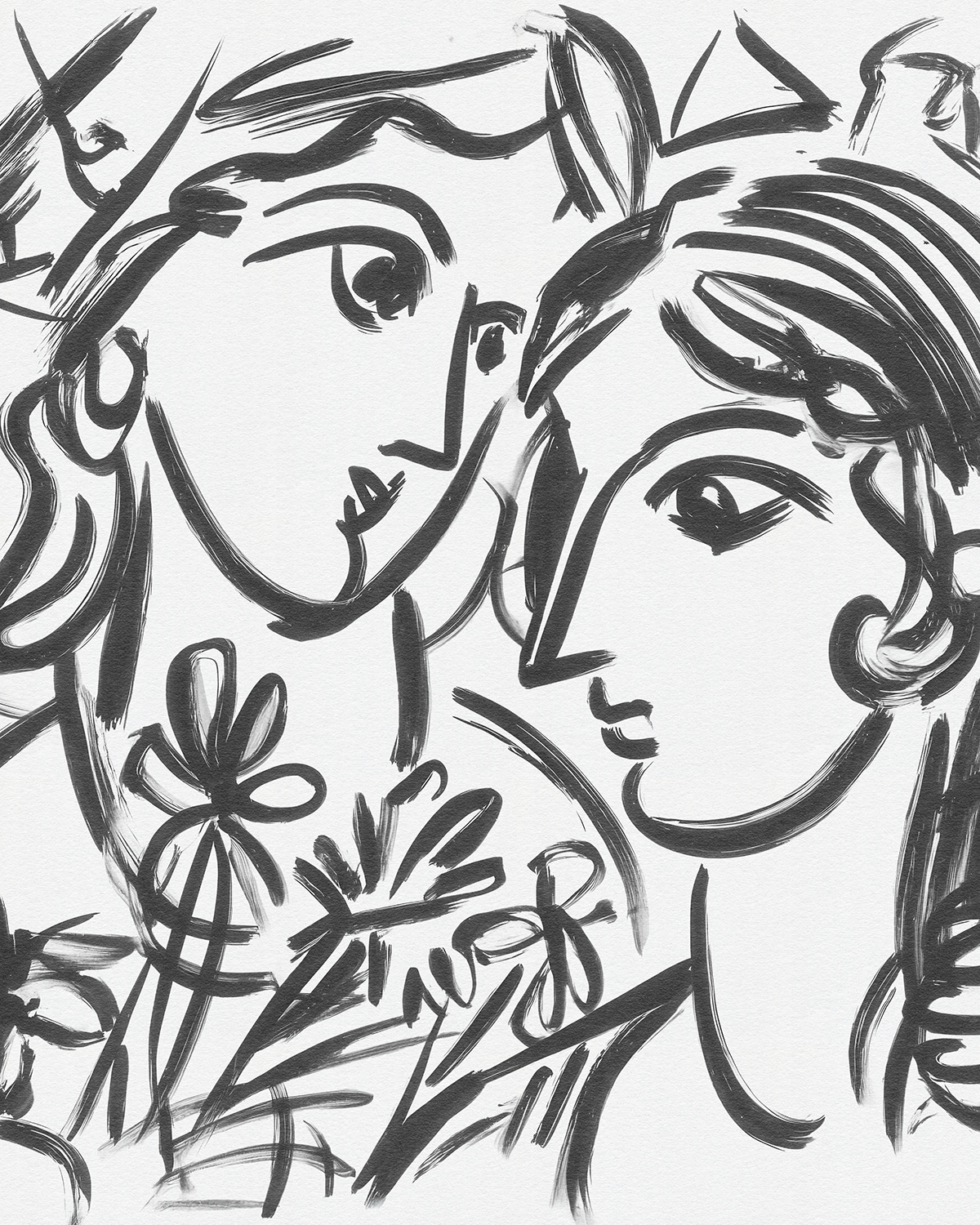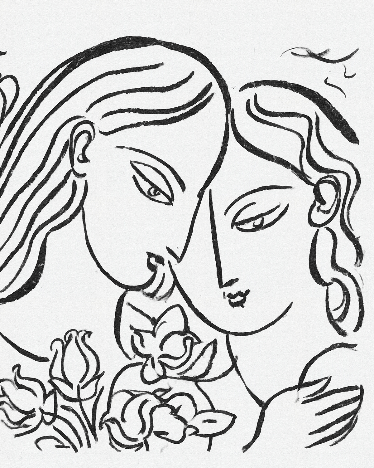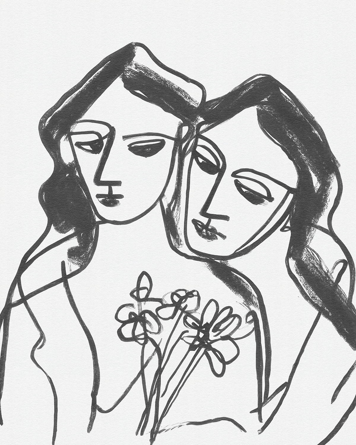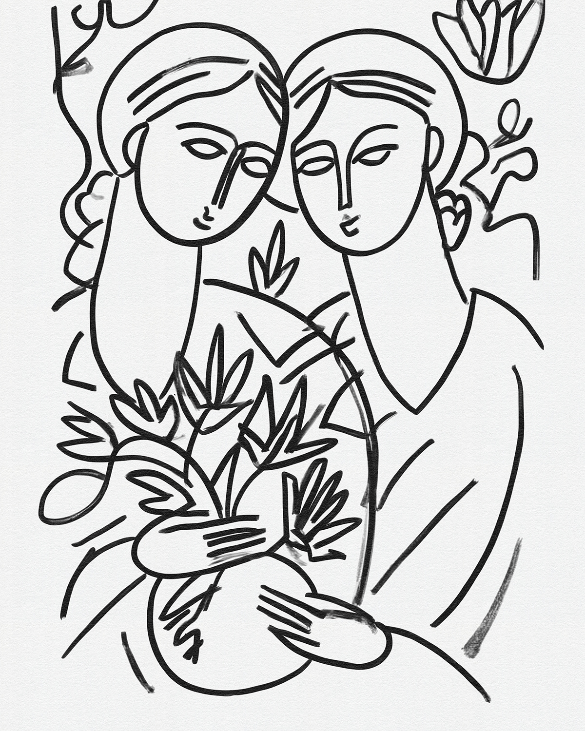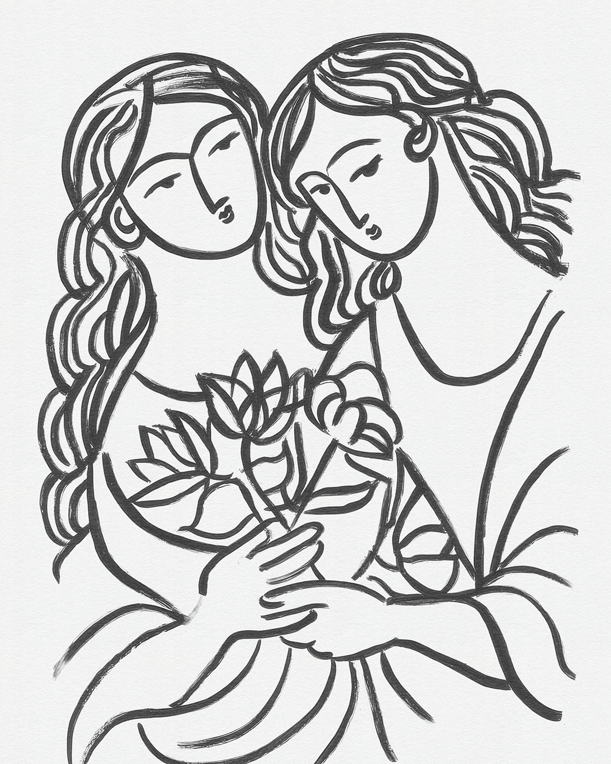 A lyrical series of intimate line drawings portraying women in quiet companionship, where flowing contour lines and floral gestures evoke tenderness, sisterhood, and modern femininity through minimal expressive mark making.