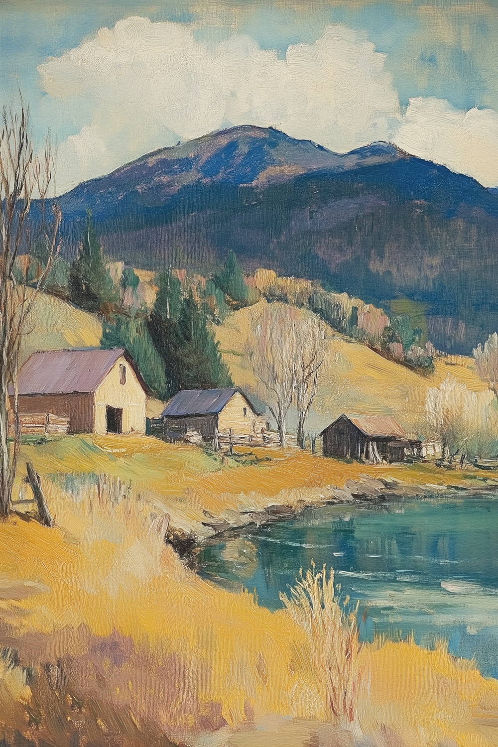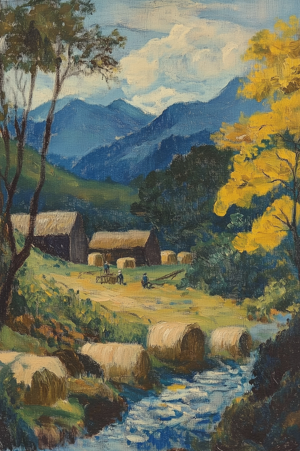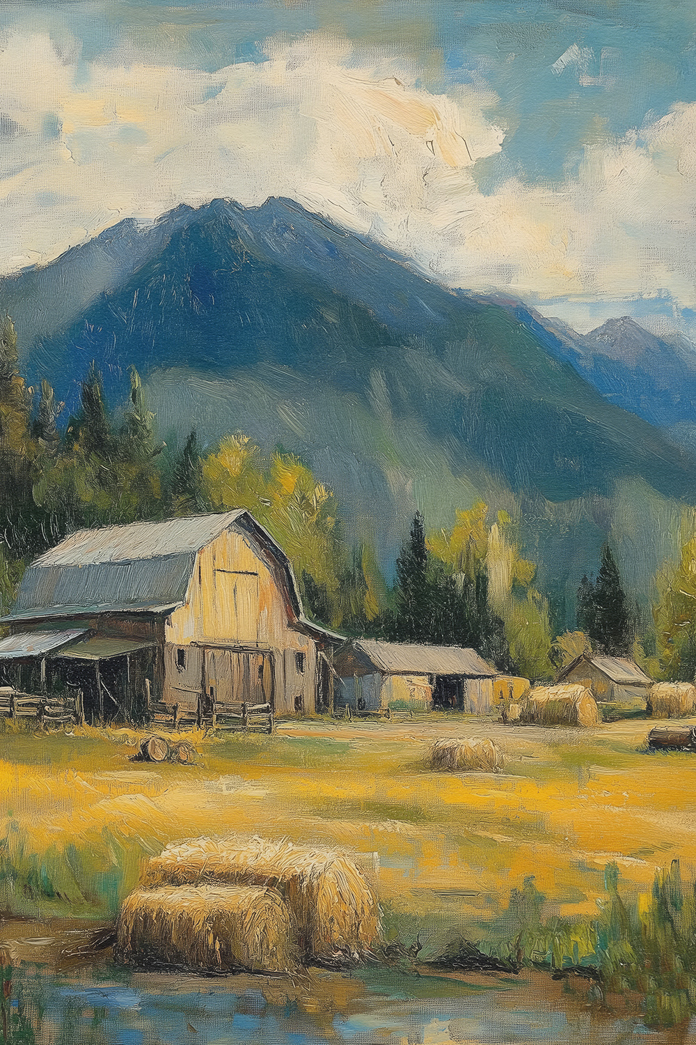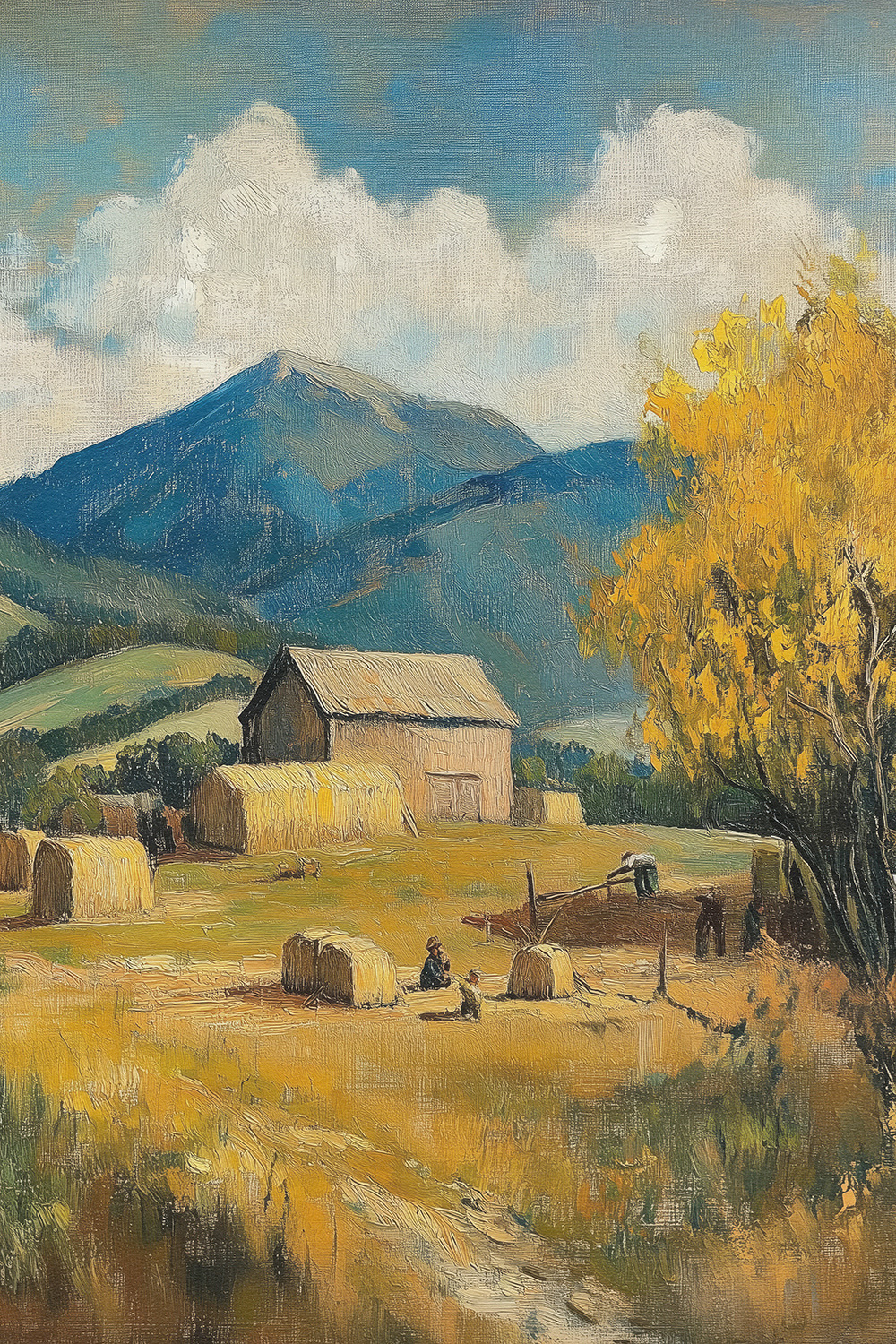 This captivating art series evokes serene rural charm with muted pastels, vivid golden tones, and dynamic brushwork, portraying peaceful landscapes of barns, haystacks, and reflective waterscapes.