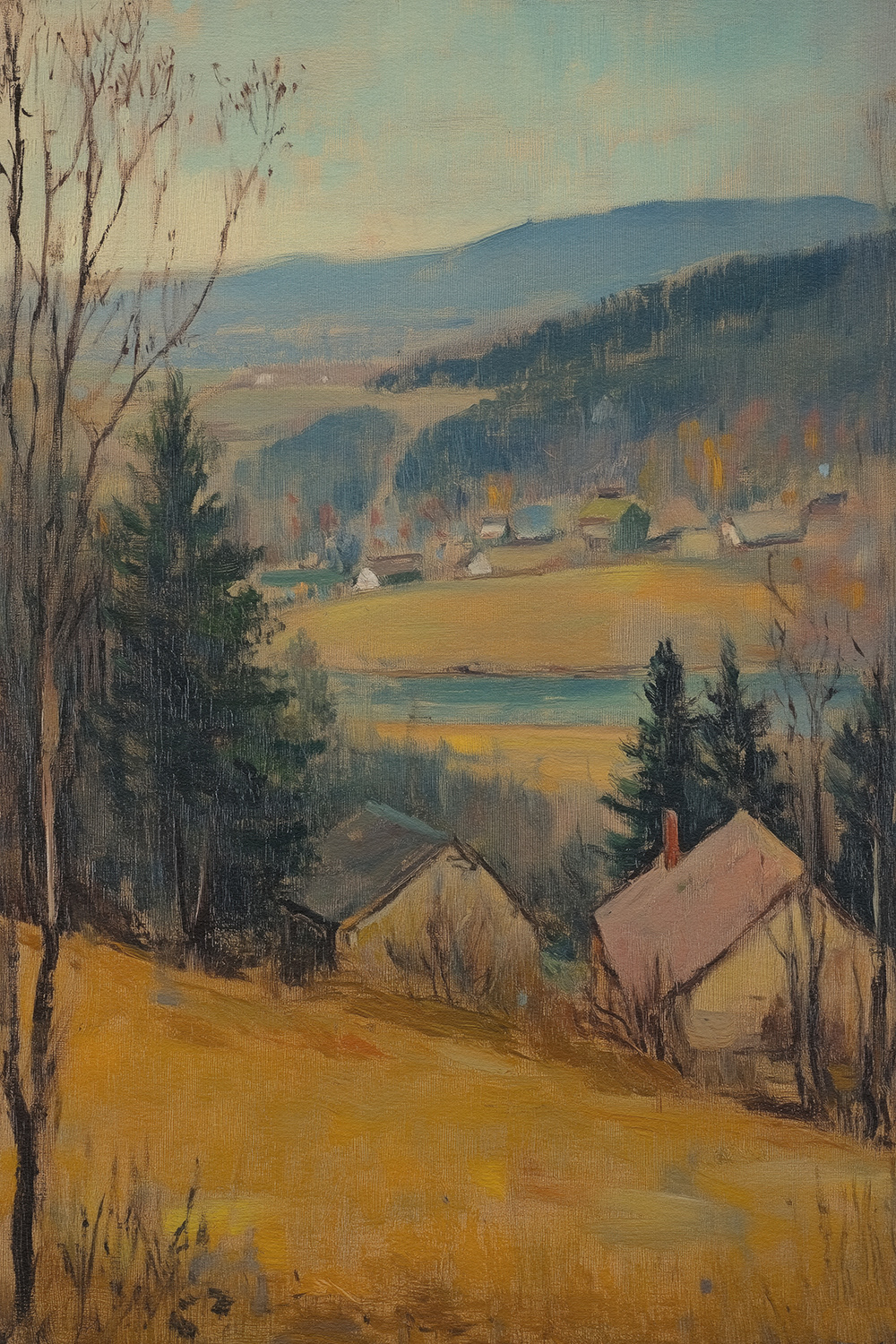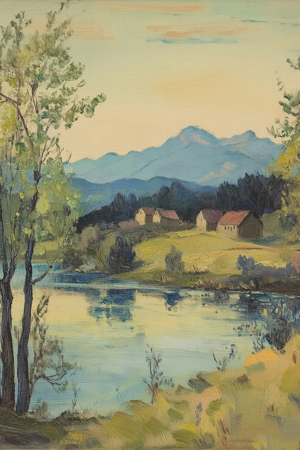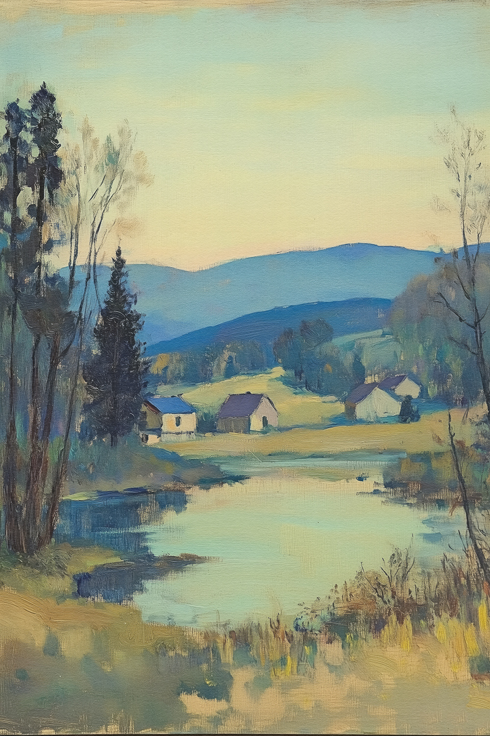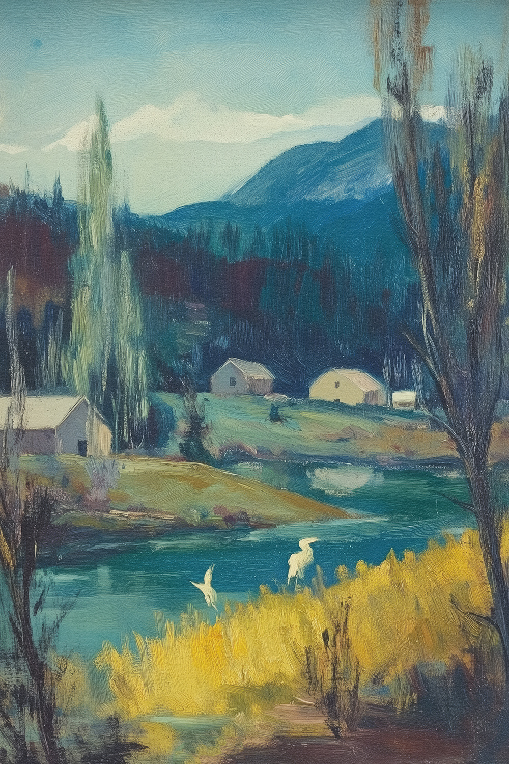 This captivating art series evokes serene rural charm with muted pastels, vivid golden tones, and dynamic brushwork, portraying peaceful landscapes of barns, haystacks, and reflective waterscapes.