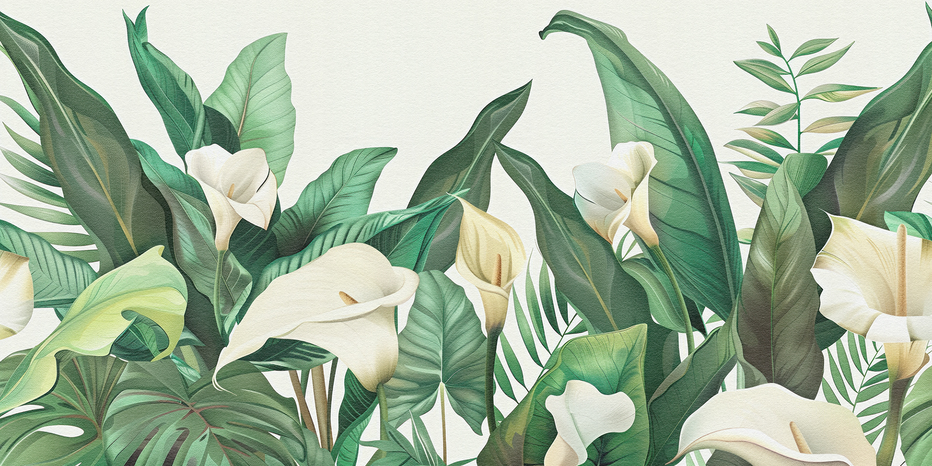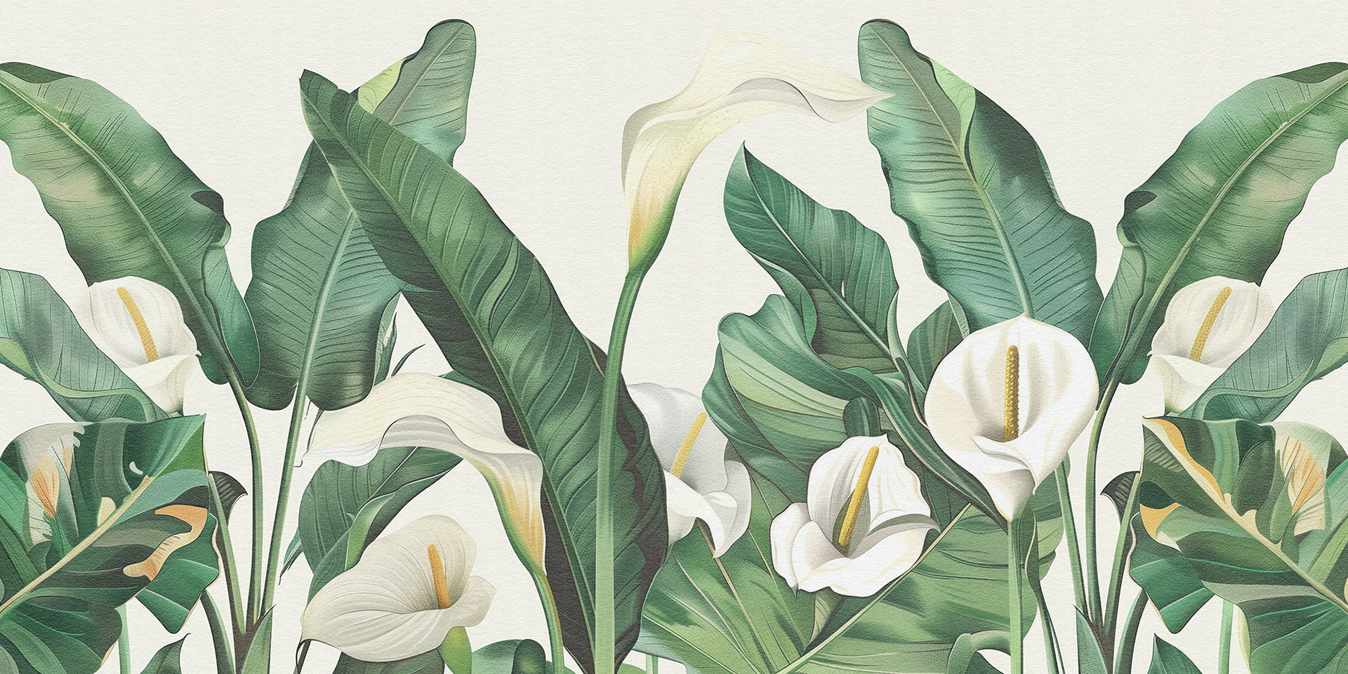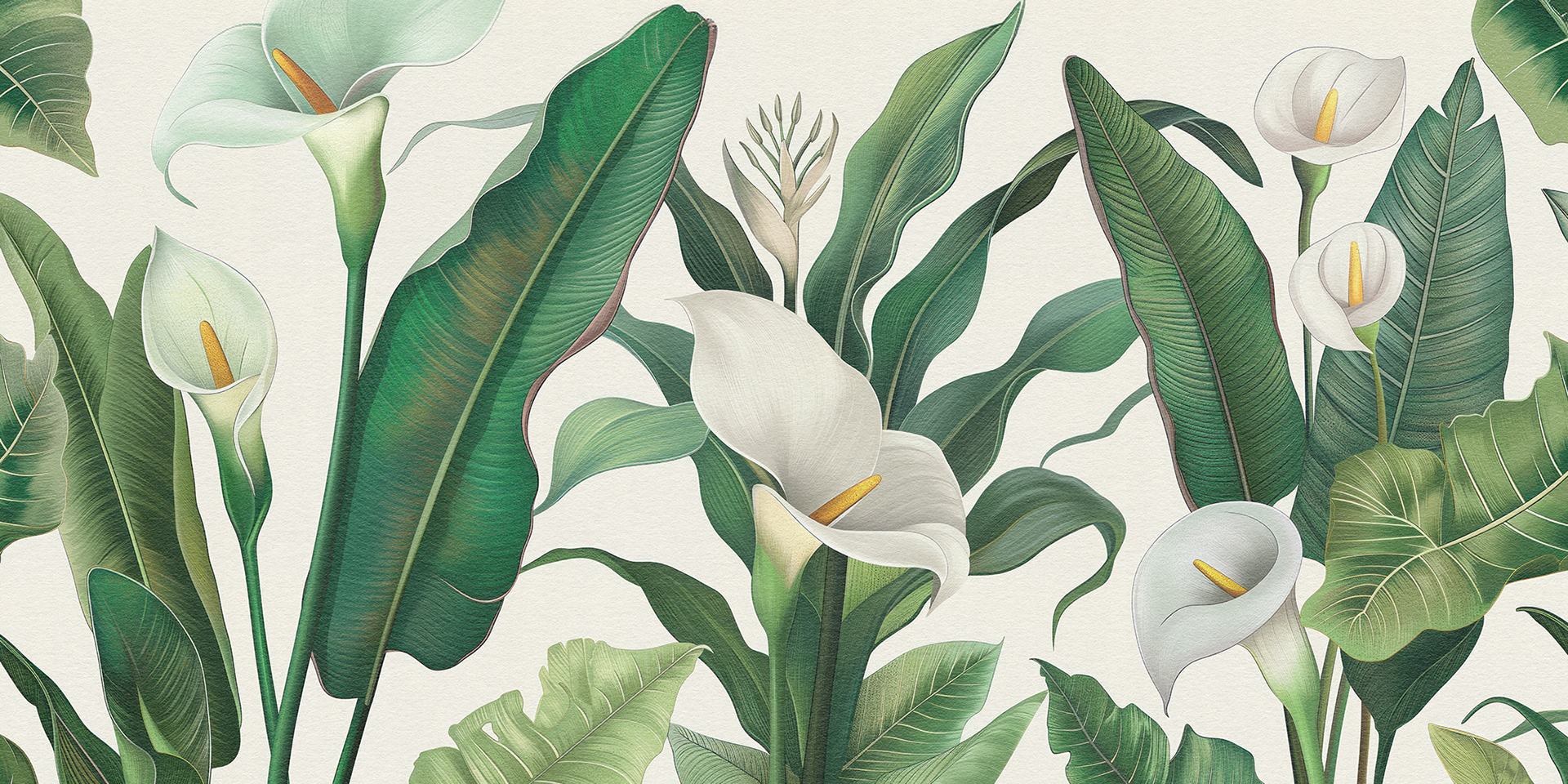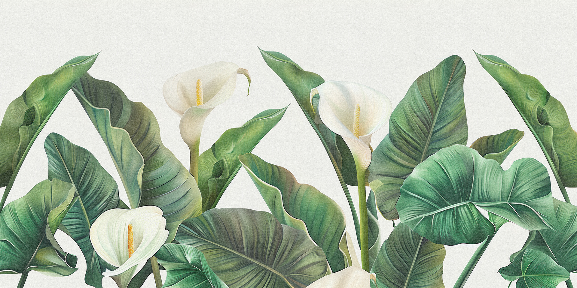 This refined botanical wallpaper series blends graceful calla lilies with lush tropical foliage, creating serene, museum-grade wall art. Its detailed hand-painted textures bring luxury, freshness, and timeless tropical sophistication to contemporary interiors.