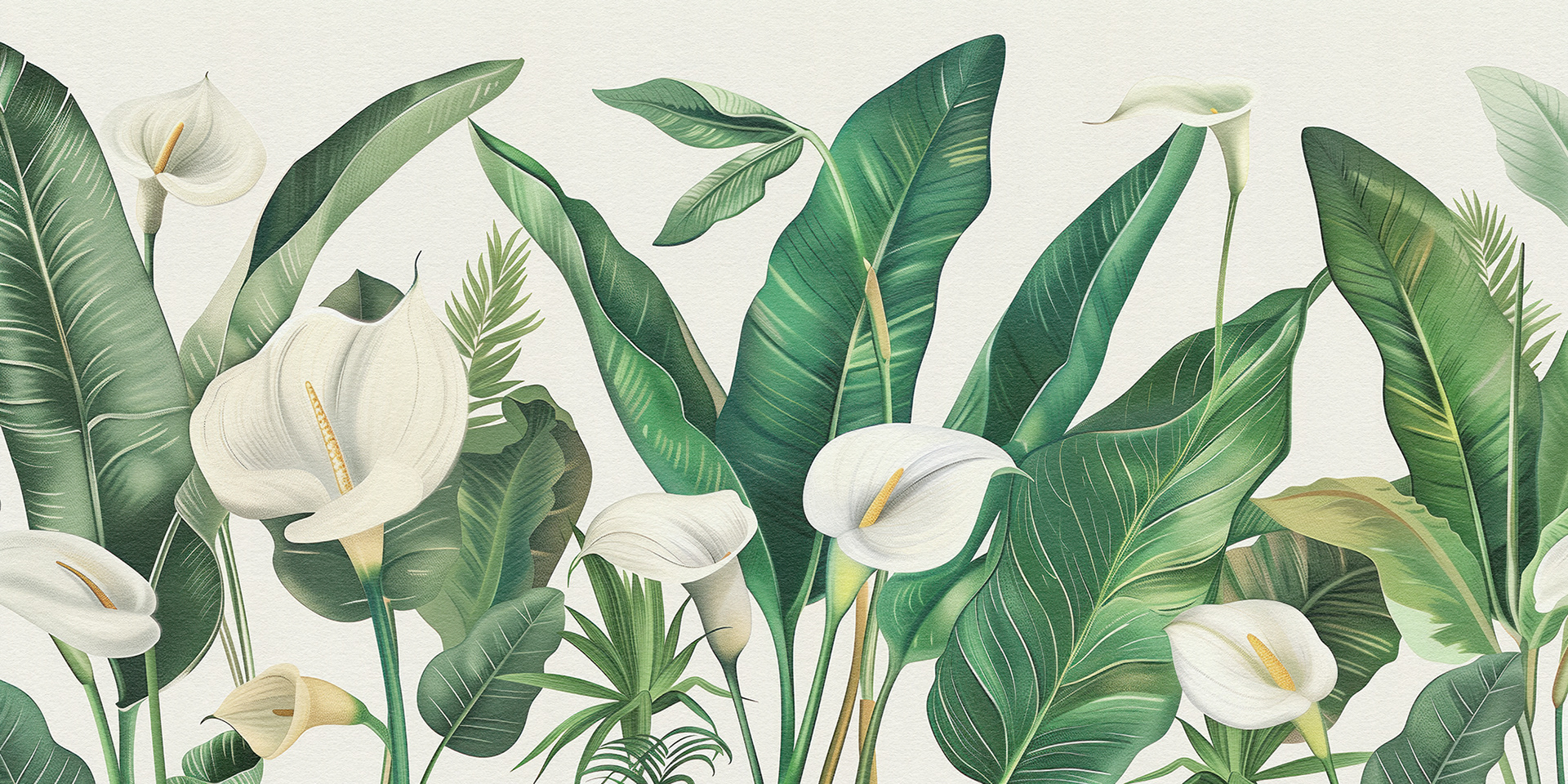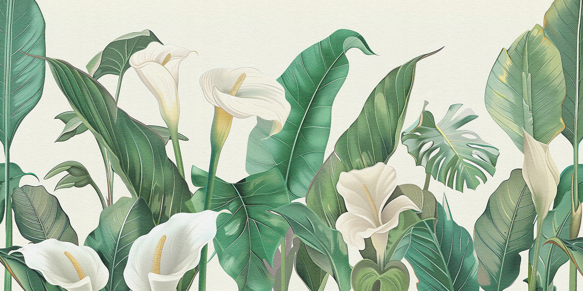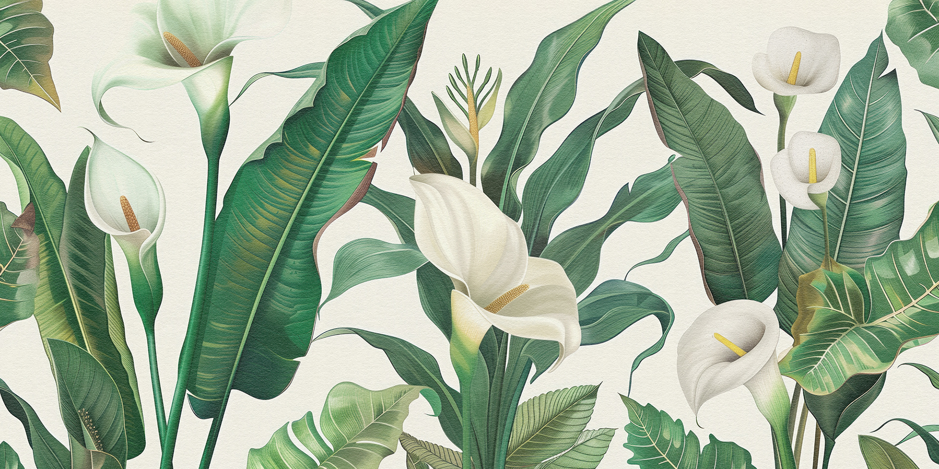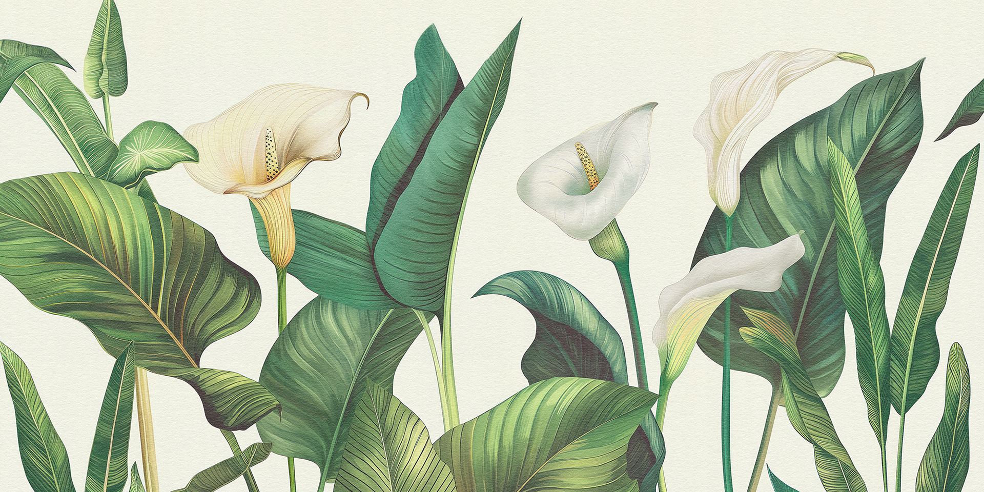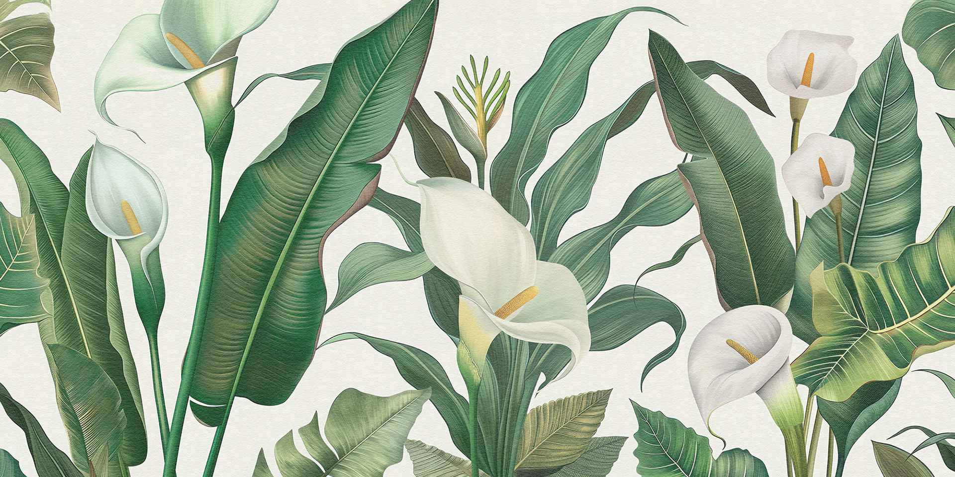 This refined botanical wallpaper series blends graceful calla lilies with lush tropical foliage, creating serene, museum-grade wall art. Its detailed hand-painted textures bring luxury, freshness, and timeless tropical sophistication to contemporary interiors.