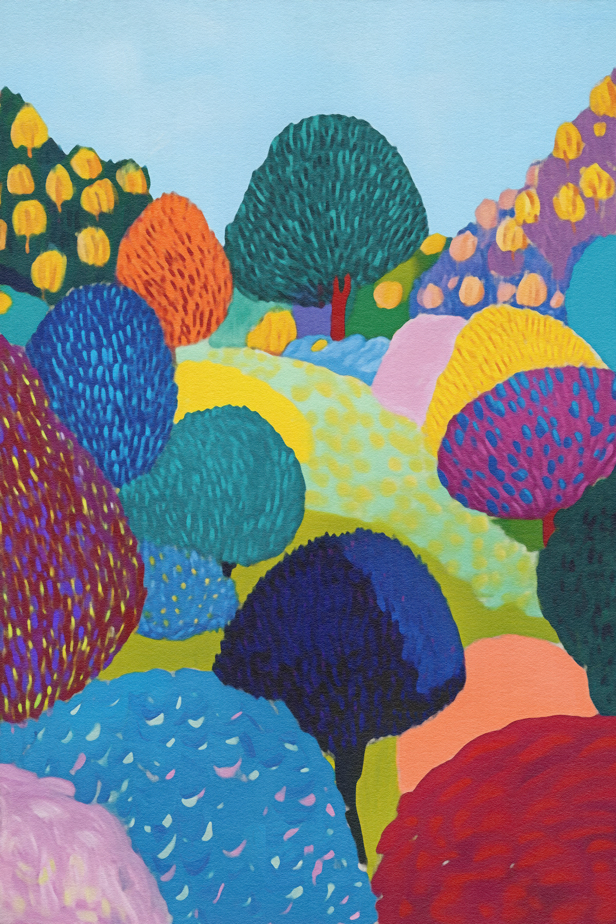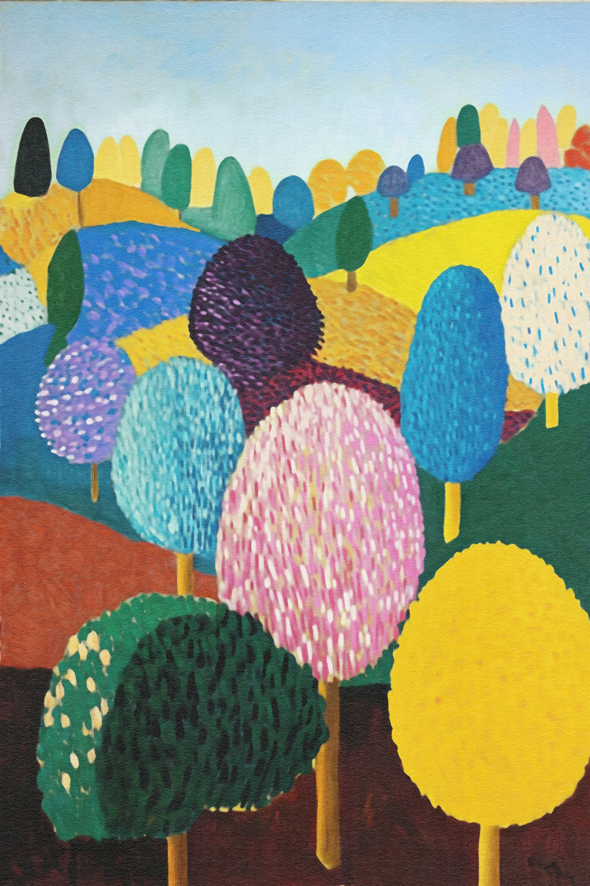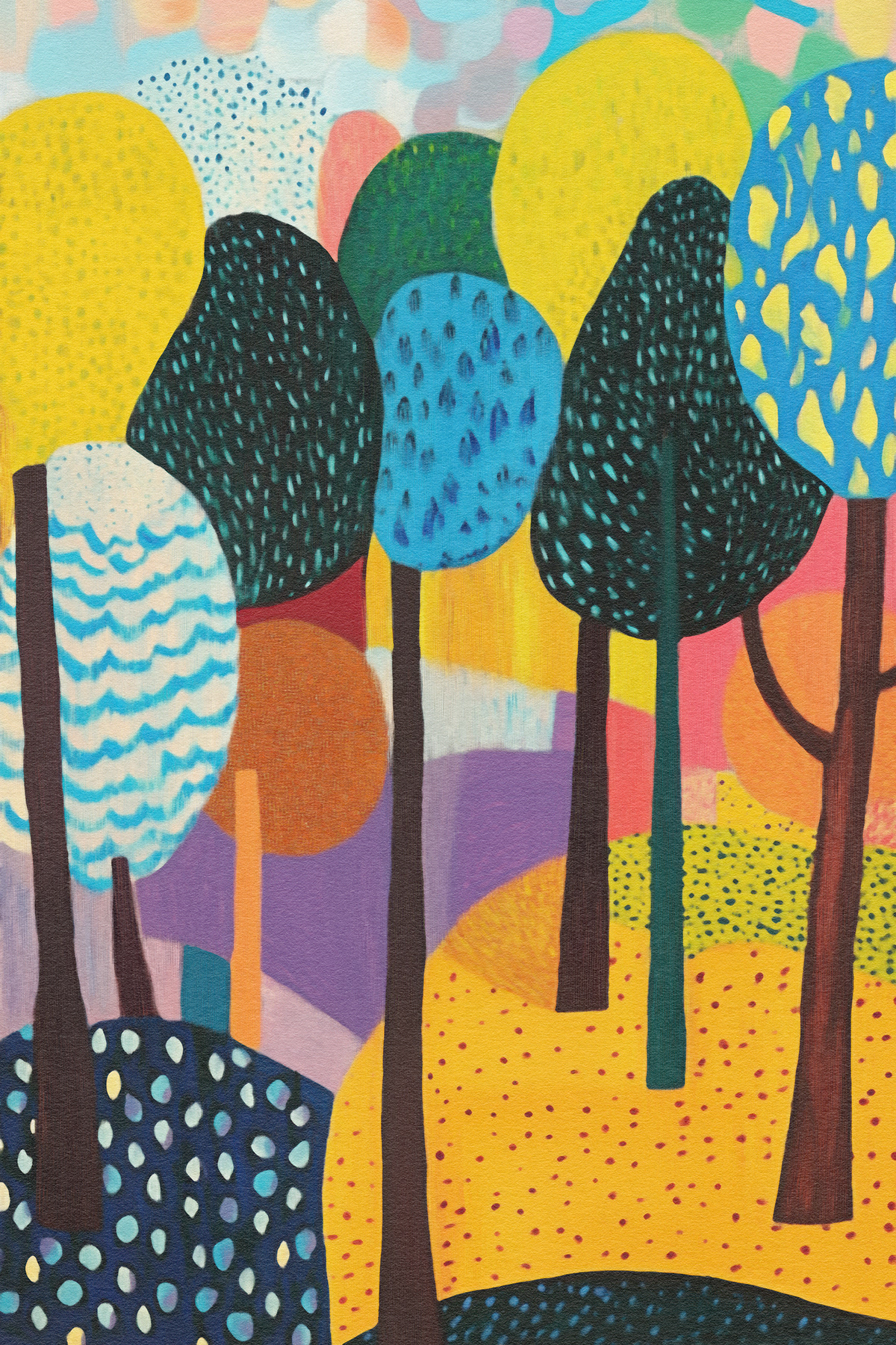 This vibrant art series transforms nature into a jubilant fantasy of rounded trees and painted meadows. Inspired by Fauvism and modern expressionism, each piece bursts with color, pattern, and playful movement. A celebration of texture and mood, the works radiate childlike wonder and abstract harmony.