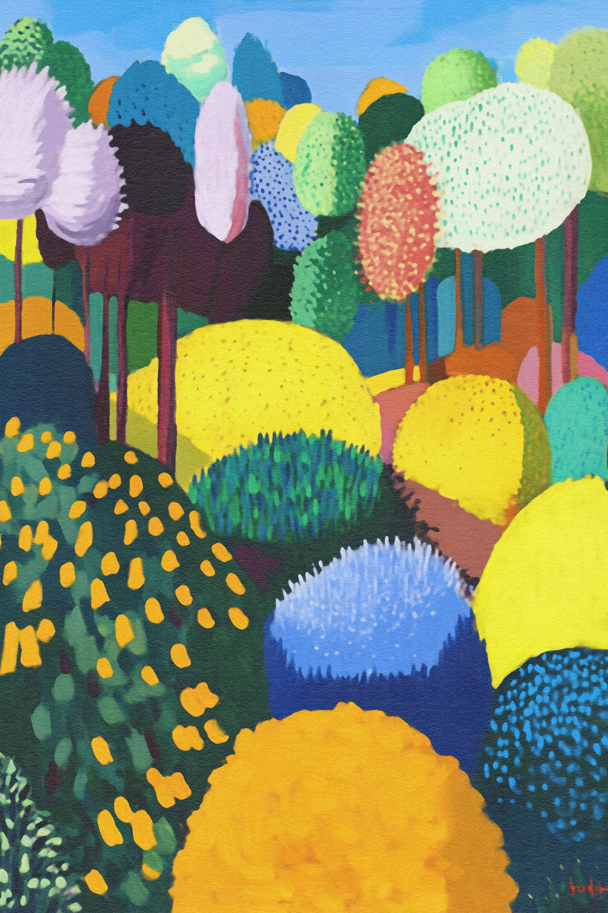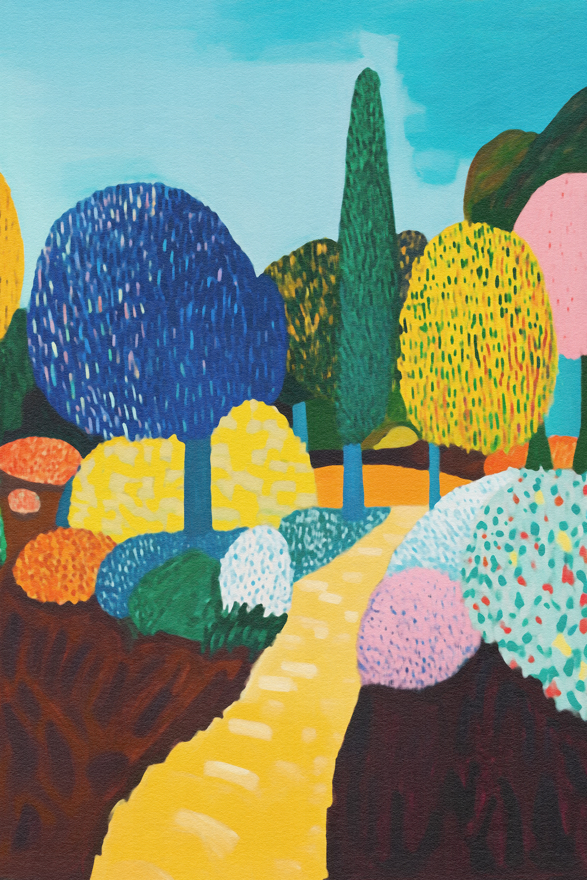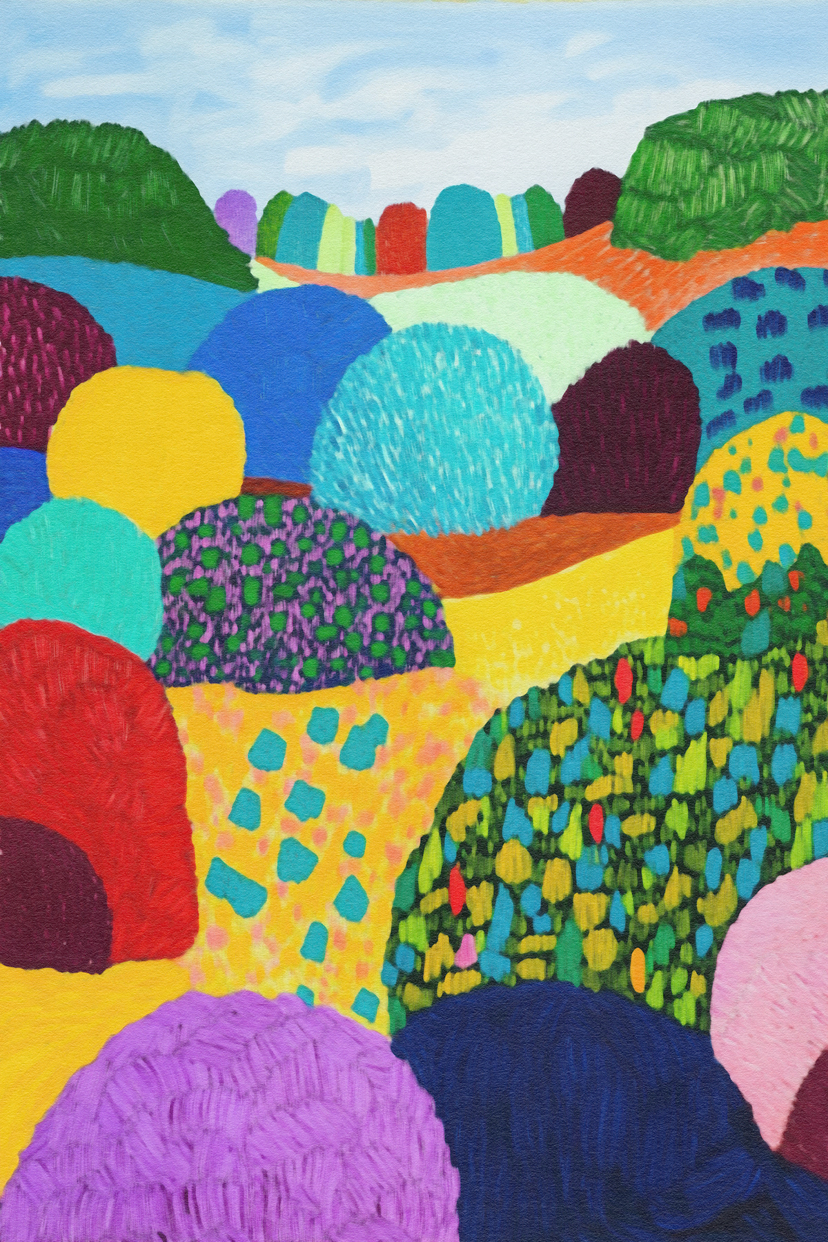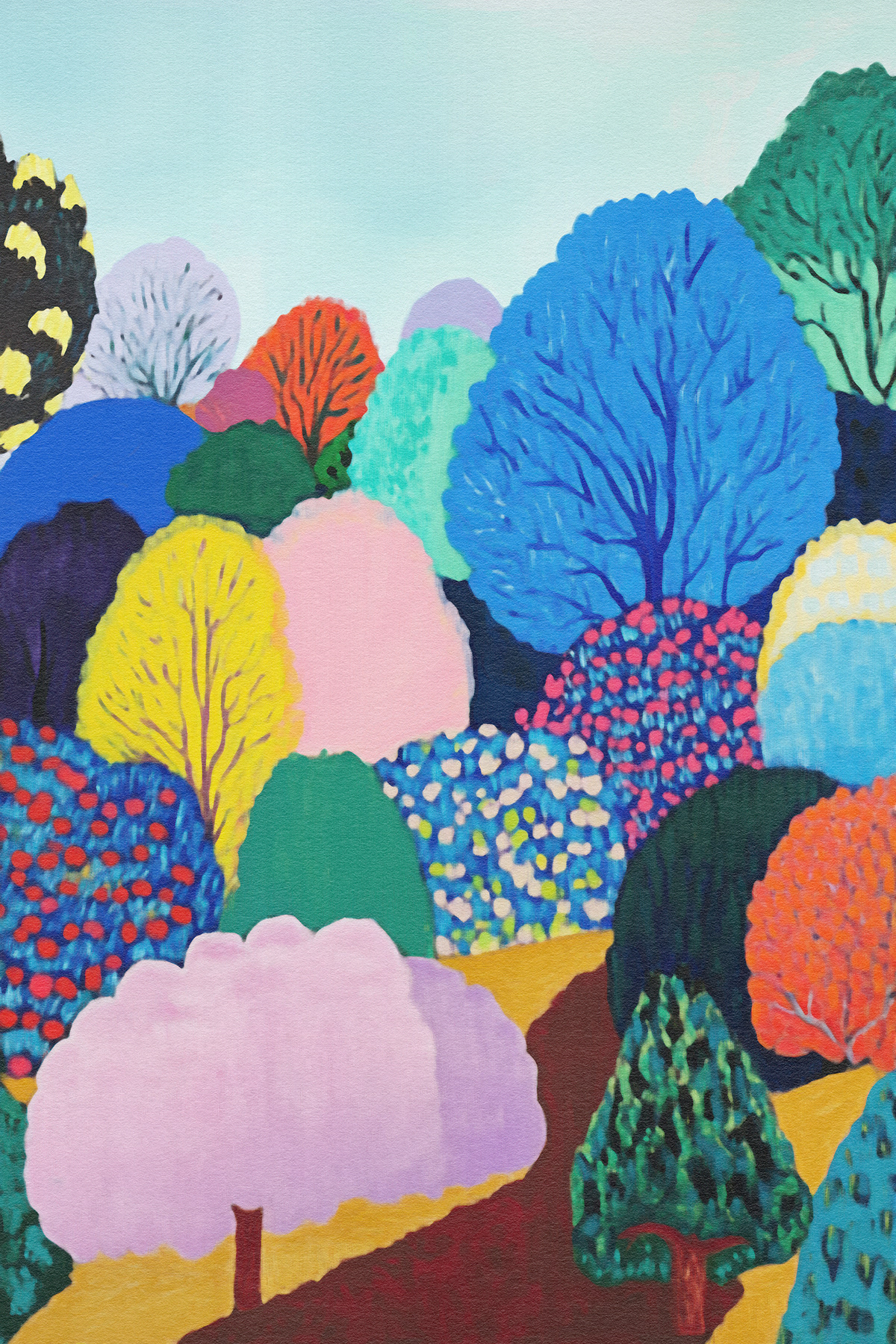 This vibrant art series transforms nature into a jubilant fantasy of rounded trees and painted meadows. Inspired by Fauvism and modern expressionism, each piece bursts with color, pattern, and playful movement. A celebration of texture and mood, the works radiate childlike wonder and abstract harmony.
