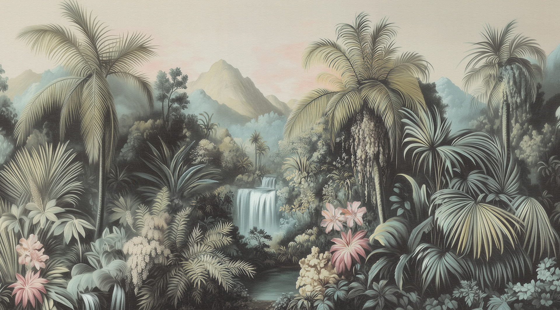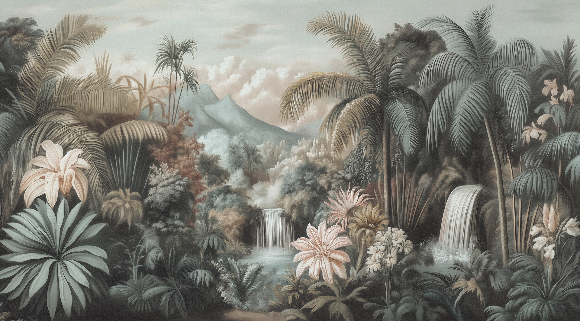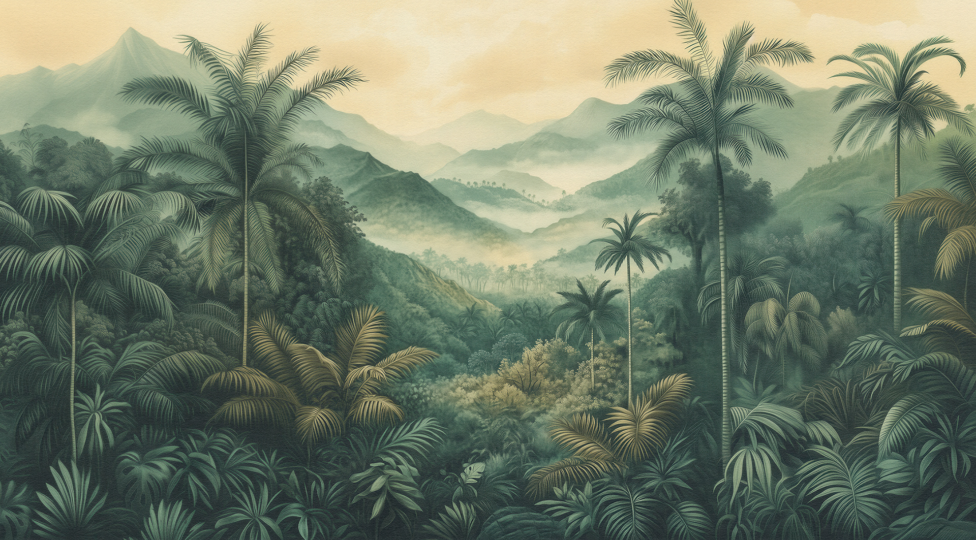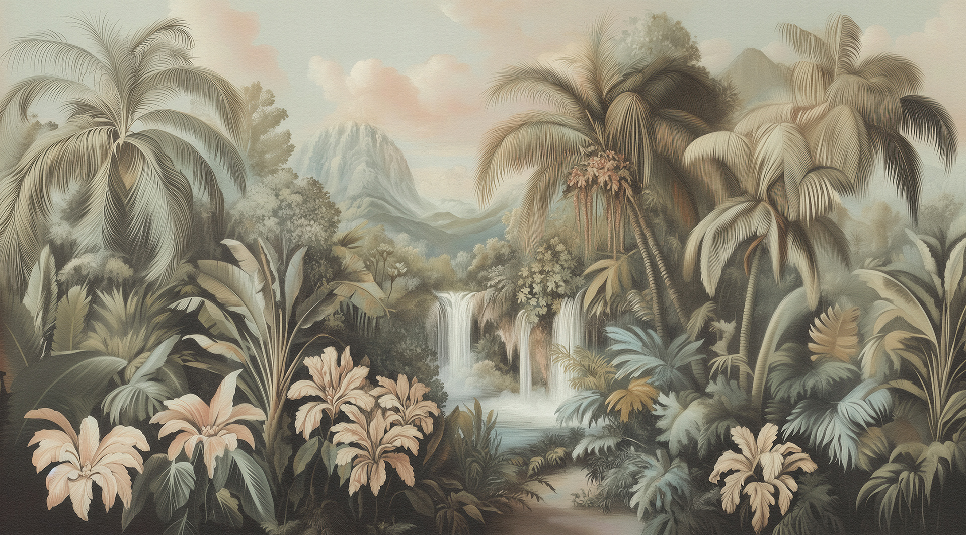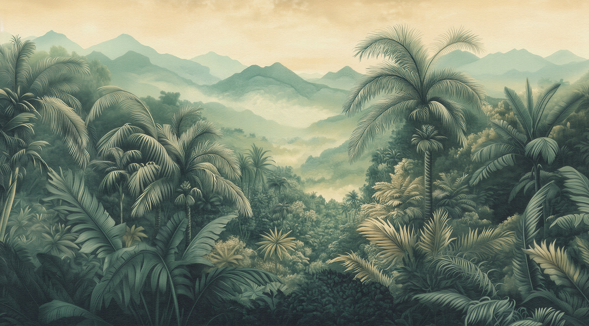 A breathtaking collection of vintage-style jungle and rainforest landscapes, these botanical wall murals blend lush foliage, distant waterfalls, and soft vintage palettes, capturing the timeless serenity of exotic tropical paradises. Ideal for luxury interiors.