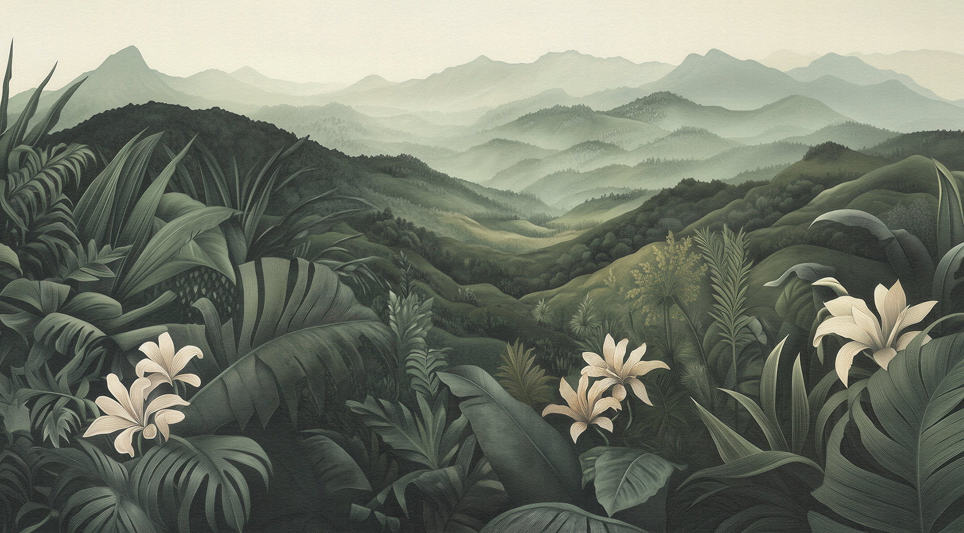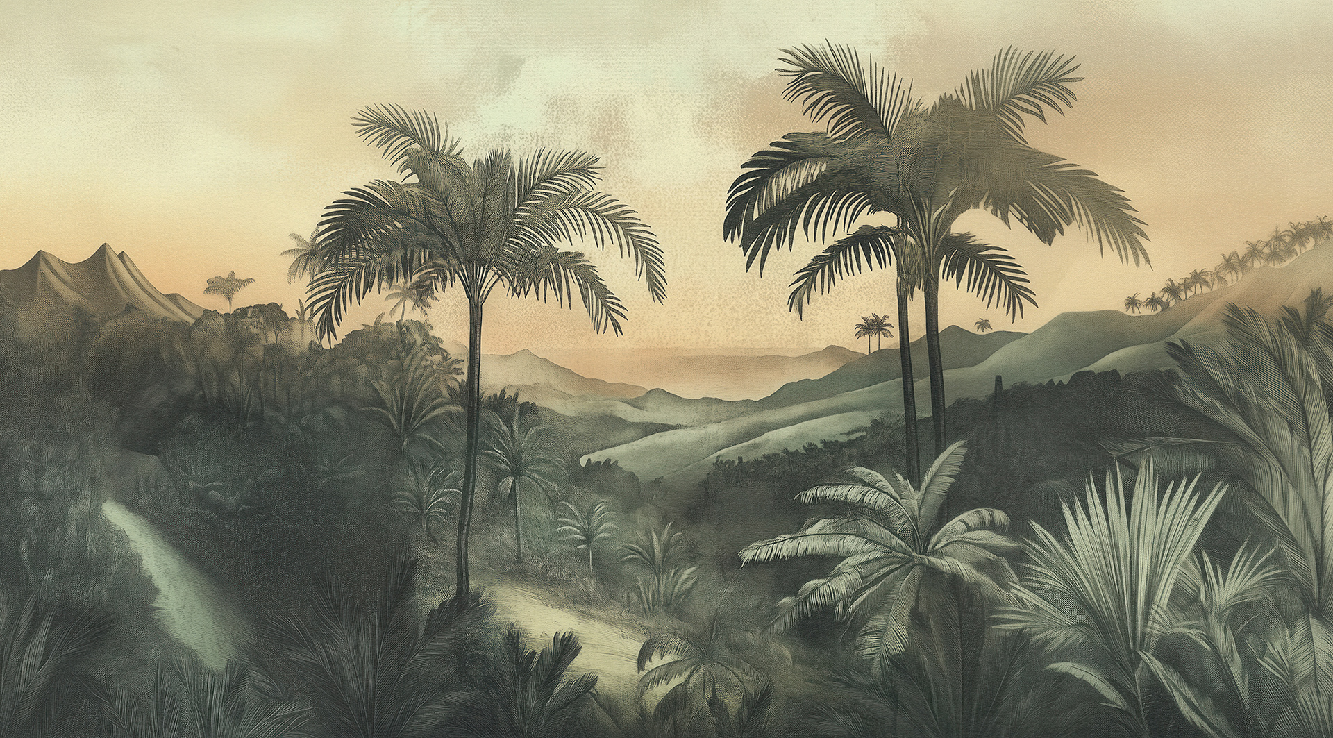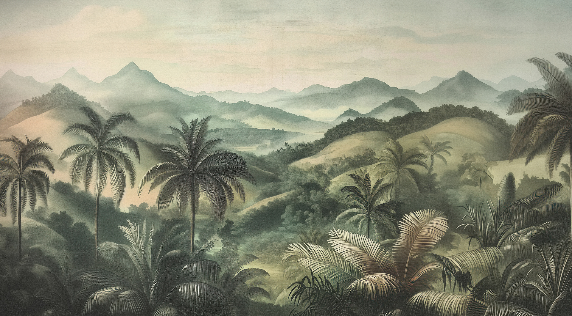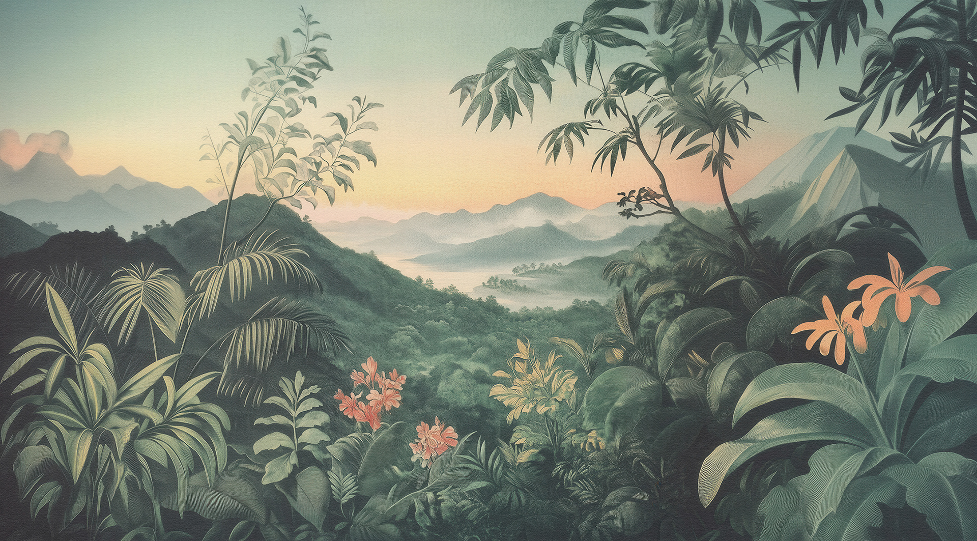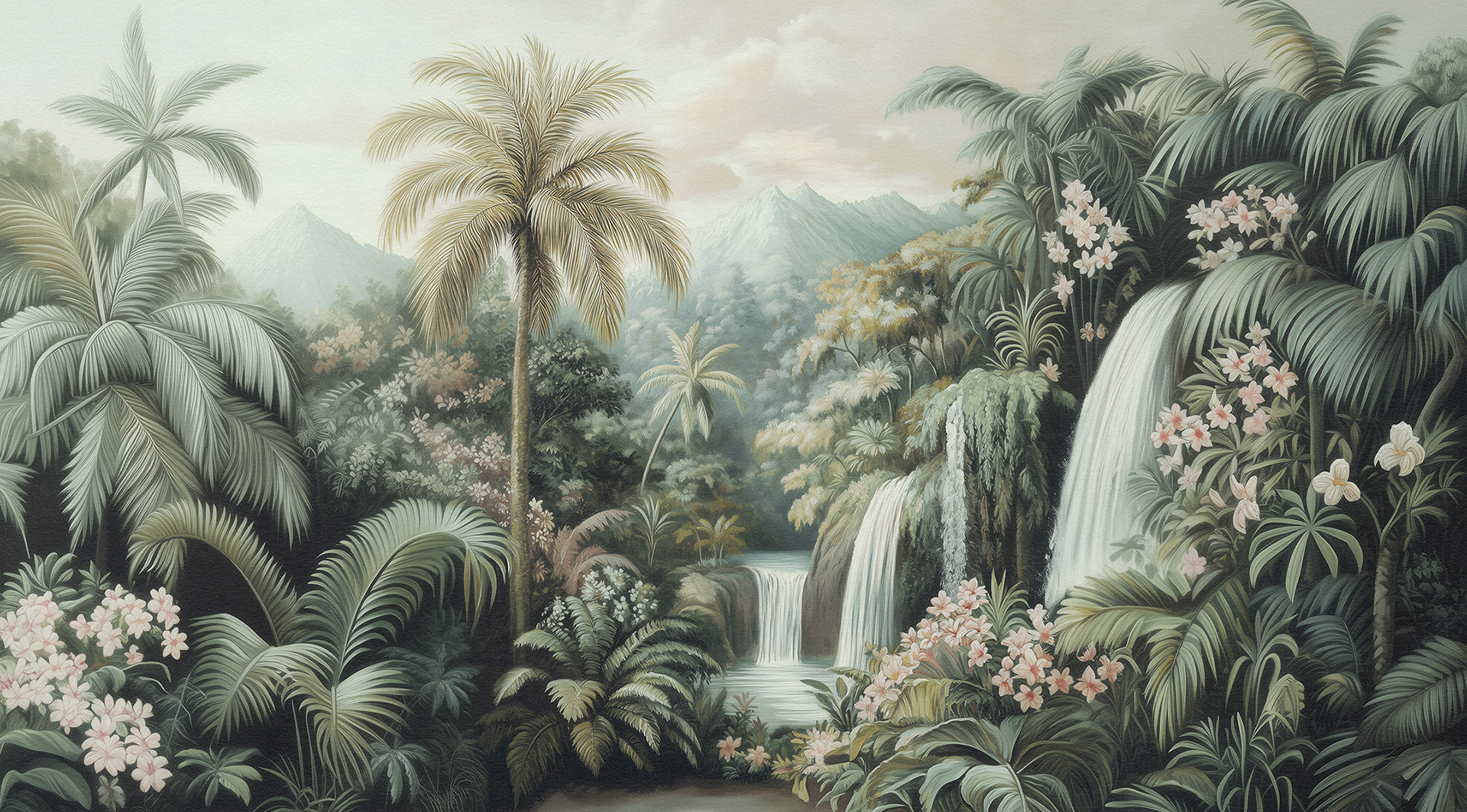 A breathtaking collection of vintage-style jungle and rainforest landscapes, these botanical wall murals blend lush foliage, distant waterfalls, and soft vintage palettes, capturing the timeless serenity of exotic tropical paradises. Ideal for luxury interiors.