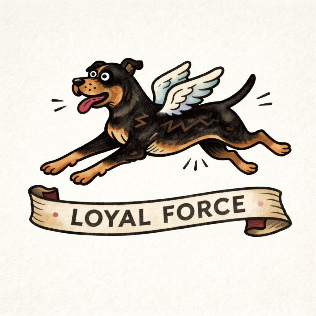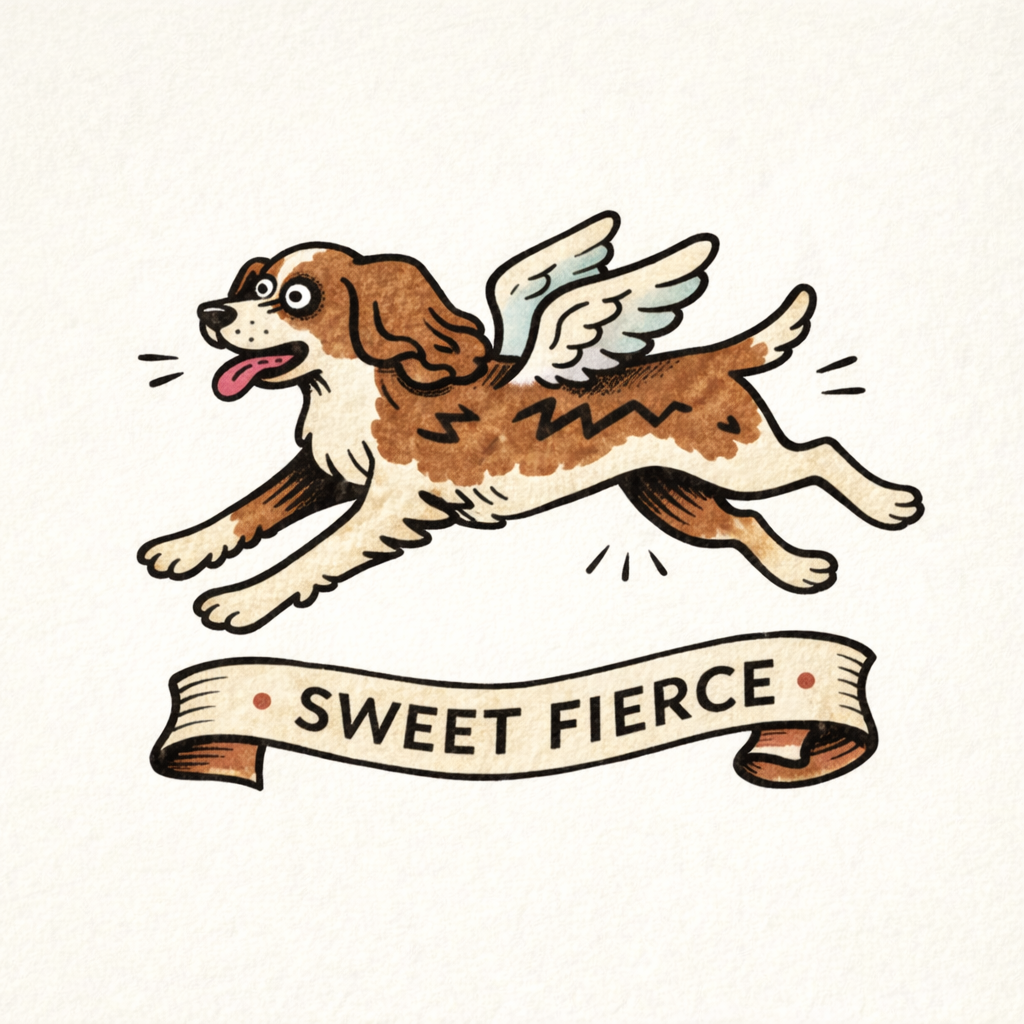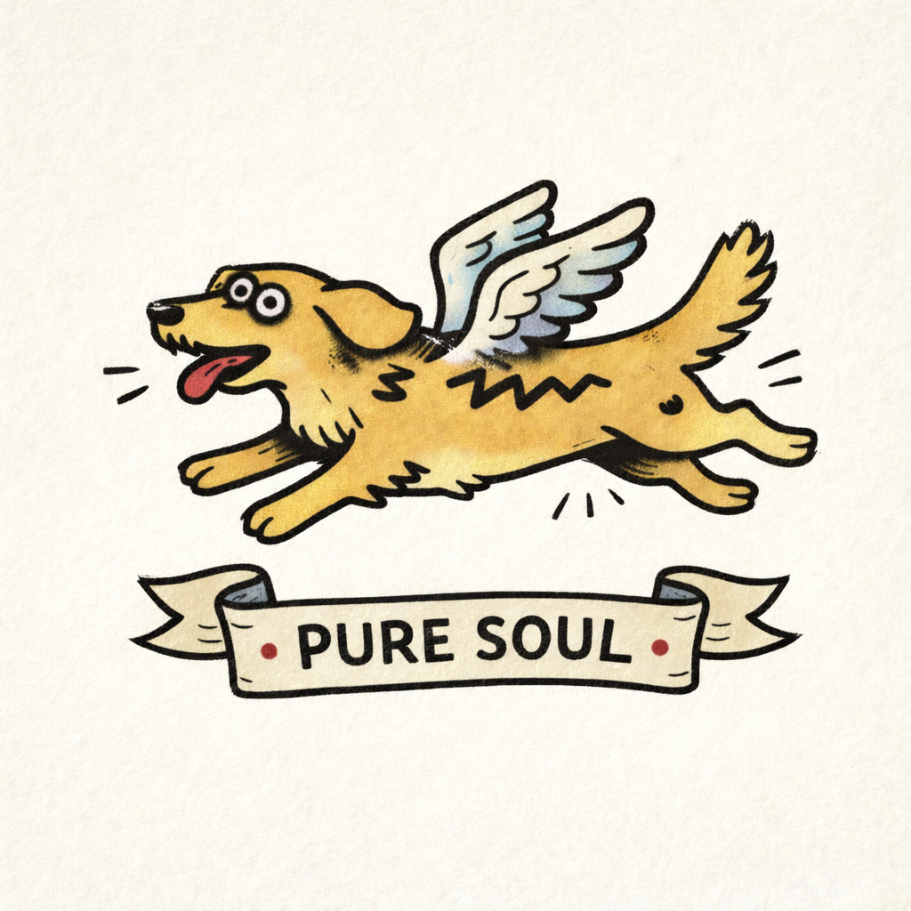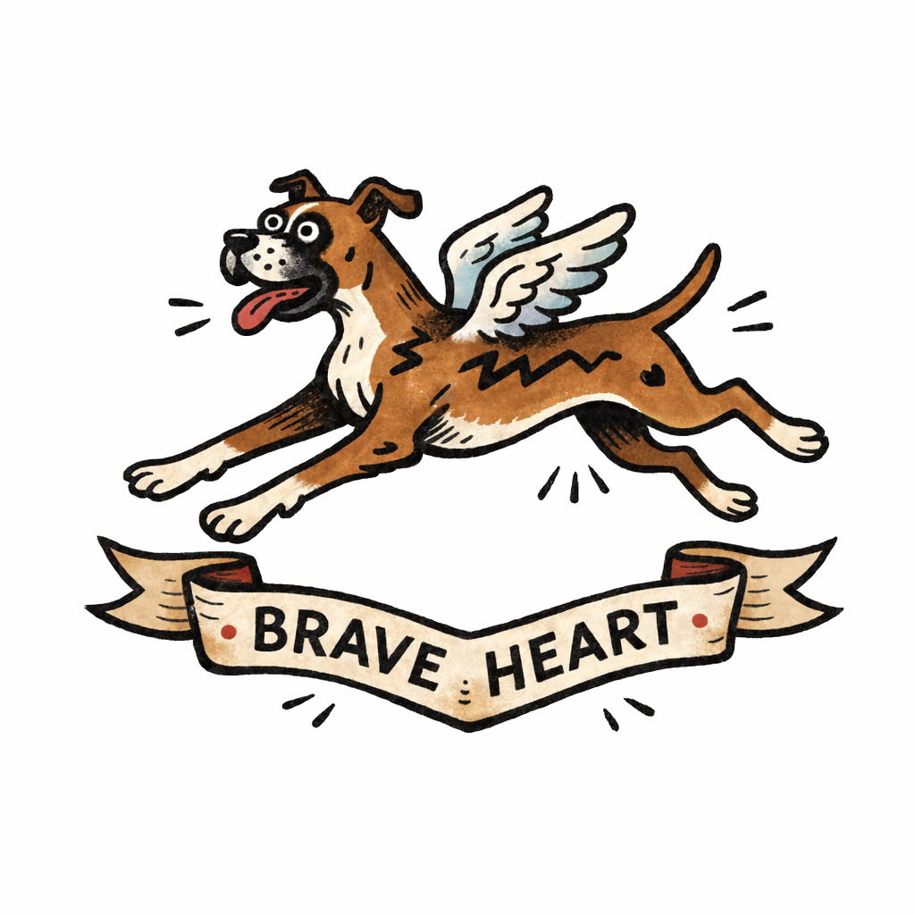 A charming illustrated dog series featuring playful winged breeds paired with bold personality phrases. Vintage-inspired linework meets modern character design, celebrating loyalty, courage, and spirited canine energy.